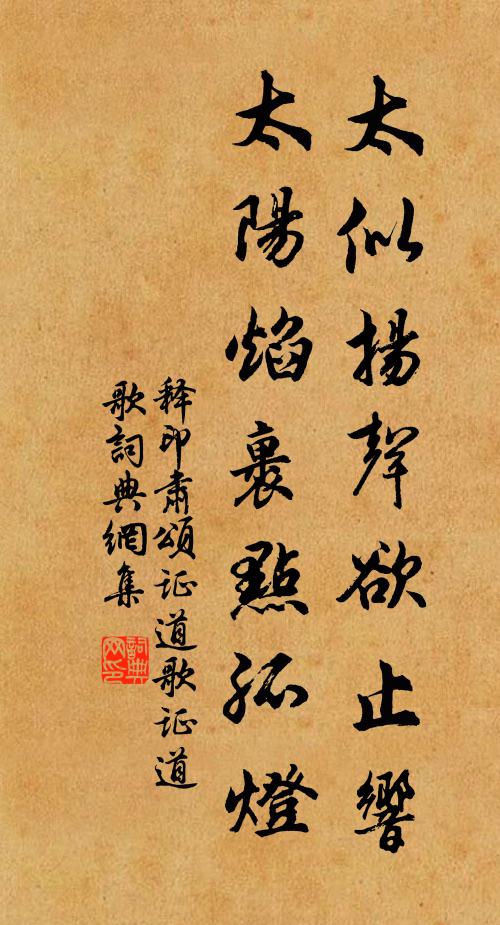 古詩文歷史字典書法欣賞書法字典國語詞典說文解字康熙字典古漢語字典太似揚聲欲止響,太陽焰裹點孤燈釋印肅 《頌證道歌證道歌》名句出處出自宋代釋印肅的《頌證道歌證道歌》全文:若實無生無不生,將無生更覓無徨。太似揚聲欲止響,太陽焰裹點孤燈。名句書法欣賞太似揚聲欲止響,太陽焰裹點孤燈書法作品釋印肅名句,頌證道歌證道歌名句名句推薦浮雲聚散如財物,不義之財馬鈺《戰掉醜奴兒》舞雩鼓瑟洙泗遠,弄月吟風伊洛舊孫應時《答楊霖用韻見贈》安得如雲長翮,命駕不須千里,上下逐君游李彌遜《水調歌頭(次向伯恭薌林見寄韻)》最愛橫斜無別樹,莫愁零落有蒼苔王大受《題道中觀梅》文耀可無田助祭,象賢賴有谷傳聲劉克莊《題趙志仁南溪雙蓮》眼前閒事靜,心裡故山來吳融《長安逢故人》上下循環通九九王處一《行香子》吟罷騷然略回首,歷陽詩社久離群林逋《壽陽城南寫望懷歷陽故友》河南有歸客,江風繞行襟孟郊《同茅郎中使君送河南裴文學》沙塵撲馬汗,霧露凝貂裘岑參《初過隴山途中,呈宇文判官》須看竹有筠,與松相表里魏了翁《和靖州判官陳子從山水圖十韻松徑晚步》長安九衢最巘嶮,侯門處處深如淵曹勛《又行路難》官事何時了,抽身朱墨叢洪咨夔《洪園洗心堂飲中偶成》湖波又遠漲綠,粉牆陰、日融煙暖馬子嚴《孤鸞(早春)》藥苗如草長,岩溜入池清徐照《題丁少瞻林園》詩詞推薦賈節庵冒夏暑越修塗過我苕霅情誼甚厚令聞古牟巘五〔宋代〕連宵接軟語,共說夢中夢。聚行時未多,歸驂忽已動。鵲橋仙盧祖皋〔宋代〕澄江曉碧,君山秋靜,人與江山俱秀。最聲吹下紫泥封,看宣獻、風流依舊。□袍對引,魚軒徐駕,小隊旌旗陪後春帖子詞皇帝閣十二首宋祁〔宋代〕瑞福隨春到,穰穰正似山。君王寬大詔,自此遍人間。贈雲門居士鄭俠〔宋代〕雲門山口雲徘徊,居士道與山崔嵬。清時肥遁古亦有,驚猿怨鶴今誰偕。居士高臥白雲堆,山門時為猿鶴開。溪花過萍鄉阮閱〔宋代〕悠悠休問渡江萍,山人毛人丹已成。路入瀟湘向西去,暮雲寒日下孤城。趙威后問齊使戰國策〔先秦〕齊王使使者問趙威后。書未發,威後問使者曰:“歲亦無恙邪?民亦無恙邪?王亦無恙邪?”使者不說,曰:“臣同謝公定攜書浴室院汶師置飯作此黃庭堅〔宋代〕竹林風與日俱斜,細草猶開一兩花。天上歸來對書客,愧勤僧飯更煎茶。泊接泥渡董嗣杲〔宋代〕笑泊虛寒古渡沙,沉暉遠襯楚山霞。江鄉酒薄難支日,客路詩多轉憶家。金彈耀林懸橘柚,翠綃縈浦泛蒹葭。船窗同李漢老登高齋劉子翬〔宋代〕飛梯百級轉層巒,政喜登臨著眼寬。海上波濤連閬苑,日邊塵土暗長安。亂來世事終無定,春盡羈愁豈一端。賴有琴歌先秦無名〔先秦〕百里奚。初娶我時五羊皮。臨當相別烹乳雞。今適富貴忘我為。