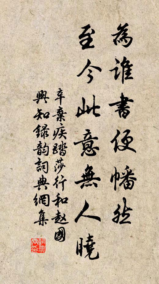 古詩文歷史字典書法欣賞書法字典國語詞典說文解字康熙字典古漢語字典為誰書便幡然,至今此意無人曉辛棄疾 《踏莎行(和趙國興知錄韻)》名句出處出自宋代辛棄疾的《踏莎行(和趙國興知錄韻)》全文:吾道悠悠,憂心悄悄。最無聊處秋光到。西風林外有啼鴉,斜陽山下多衰草。長憶商山,當年四老。塵埃也走鹹陽道。為誰書便幡然,至今此意無人曉。名句書法欣賞為誰書便幡然,至今此意無人曉書法作品辛棄疾名句,踏莎行(和趙國興知錄韻)名句名句推薦永日雖無雨,東風自落花李建勛《踏青樽前》他鄉一尊酒,獨坐不成斟徐鉉《雪中作》乞降那更得,尚詐莫徒勞杜甫《喜聞官軍已臨賊境二十韻》玉龍吟,金童拍侯善淵《迎仙客》絕憐郊野依林壑,更拓軒窗貯竹風程公許《題江樂陳氏江亭》南山特地森奇峰,嶙峋怪石盤虬龍江邦佐《游潯州南山》歌吹歡娛夕,衡門可屬垣晏殊《上元夕次韻答張諫議》大限直待臨頭,難免三塗苦王哲《黃鶯兒》雨餘林外夕煙沉,忽有蛙聲伴客吟吳融《西京道中聞蛙》史臣弗遺,後世是資趙湘《送駕部劉侯赴厥詩》見柳知新翠彭元遜《隔浦蓮近/隔浦蓮近拍》松葉疏開嶺,桃花密映津劉方平《寄隴右嚴判官》棋雋決楚漢,杯壯迷彭傷洪咨夔《東山即事》把菊流雙淚,誰知憶遠人楊億《代答》先春嬌柳絮,永夜奪銀蟾陳襄《詠雪》詩詞推薦寄俞太中山人魏野〔宋代〕相訪住三年,初終道一般,知心於我異,屈指似君難。有物皆同詠,無書不共看。草堂今獨處,寧免動長嘆。過分水嶺溫庭筠〔唐代〕溪水無情似有情,入山三日得同行。嶺頭便是分頭處,惜別潺湲一夜聲。游都梁賦沈誠〔宋代〕昔中原兮今過頭,抱良圖兮氣乾牛。窺泗城兮辨古汴,臨清浦兮思白溝。答韓使同在邊陳子昂〔唐代〕漢家失中策。胡馬屢南驅。聞詔安邊使。曾是故人謨。廢書悵懷古。負劍許良圖。出關歲方晏。乘障日多虞。虜入減字木蘭花(預作菊詞,俾歌之,至時以侑酒)李處全〔宋代〕今年菊早。想到重陽花正好。玉冷金寒。全似東籬挹露看。色莊香重。直與梅花堪伯仲。待喚淵明。三友相從蓋為和姚令威春晚即事許志仁〔宋代〕臥看遊絲媚遠天,起尋幽徑卻茫然。句成落絮飛花里,心在殘霞夕照邊。無復雙魚傳尺素,空餘寶瑟思華年。老來玉樓春晏幾道〔宋代〕旗亭西畔朝雲住。瀋水香菸長滿路。柳陰分到畫眉邊,花片飛來垂手處。妝成盡任秋娘妒。裊裊盈盈當繡戶。臨風題獻花鋪陶弼〔宋代〕德裕南遷瘴海涯,路逢山女獻山花。平泉公子傷春處,唯有東風吹草芽。夏景園廬韋應物〔唐代〕群木晝陰靜,北窗涼氣多。閒居逾時節,夏雲已嵯峨。搴葉愛繁綠,緣澗弄驚波。豈為論夙志,對此青山阿。聞叔易隱居被召二首晁說之〔宋代〕處士何人為作牙,盡攜猿鶴到京華。故山岩壑應惆悵,六六峰前只一家。