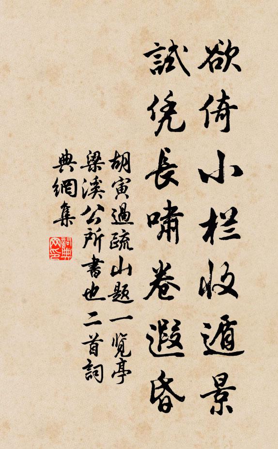 古詩文歷史字典書法欣賞書法字典國語詞典說文解字康熙字典古漢語字典欲倚小欄收遁景,試憑長嘯卷遐昏胡寅 《過疏山題一覽亭梁溪公所書也二首》名句出處出自宋代胡寅的《過疏山題一覽亭梁溪公所書也二首》全文:林梢斜月墮金盆,接影蒼茫日霧翻。欲倚小欄收遁景,試憑長嘯卷遐昏。寒山濯濯空堆皺,野水瀰瀰不待源。莫道此亭觀覽富,未如賓日上天門。名句書法欣賞欲倚小欄收遁景,試憑長嘯卷遐昏書法作品胡寅名句,過疏山題一覽亭梁溪公所書也二首名句名句推薦隨蜂繞綠蕙,避雀隱青薇劉孝綽《詠素蝶詩》倦眠書硯付埃氛,煙盡當窗一篆雲方回《三月十七夜大雷雨用韻酬俞好問四首》四釋分題處,年來一榻虛釋文兆《寄保暹師》天姝星艷下人世,靈真高秀無比方張耒《觀梅》潛發枯草萌,亂起蟄蟲伏蘇轍《立冬聞雷》他年二南化,無復更衰微虛中《寄華山司空圖二首》誰與寒窗催好林,幾重白氎一盂香李彌遜《奉懷粹戲成》劍外空逢杜,黃州卻遇蘇鞏豐《海棠》陳君為我言如此,折贈當期慰眼中趙蕃《代簡琛卿》守我冷官巾與屨,任他巧宦帶而袍梅時舉《挽趙秋曉》民思賢使者,帝遣大農丞楊萬里《送乘叔羽寺丞持節淮東二首》遂令湖海上,坐覺豪氣除向滈《莞爾堂和柳樞密韻》只愁吳苑館娃老,無奈唐宮春恨長何夢桂《和石庵洪府理金沙酴醾牡丹二首》羨汝歸茅屋,書窗見遠山李端《送衛雄下第歸同州》羽檄秋風,胡笳夜月,多少勛名留漢關李曾伯《沁園春(庚寅為親庭壽)》詩詞推薦鄙翁住菁山庵釋智朋〔宋代〕糞火堆中不善藏,蹲鴟直透九重香。煙雲深鎖菁山塢,輒莫鐘聲送夕陽。五祖演和尚贊釋智遇〔宋代〕師之道兮不可得而稱,師之德兮不可得而述。師之行兮不可得而聞,師之業兮不可得而見。道德行來,聞見稱述,行香子王哲〔元代〕五鼓才成,土德行香。偏能將、四象包藏。如今盡顯,聚在中央。沒白歸青,紅歸黑,不歸黃。已證空虛,便出昆初涼方回〔宋代〕余民脫死初平寇,歉歲逢秋亦喜涼。止水池邊臨樹影,逆風林下溯花香。尚欣鄰壁肯賒酒,不管空庖無宿糧。已往思歸八絕胡寅〔宋代〕昨日春風花滿山,回頭秋葉錦斑斑。終年竅綠慚憂寄,何事遲留久未還。胭脂井曾極〔宋代〕寒泉玉甃沒春蕪,石染胭脂潤不枯。杏怨桃羞嬌欲墮,猶將紅淚西黃奴。為建平詹使君賦山泉程公許〔宋代〕秋風慄憀宋玉宅,湍波磕涌三閭祠。行人莫蚩我邦陋,離騷千古芳菲菲。使君玉立筍班上,得州如斗不薄之。冠峨題清音亭徐沖淵〔宋代〕新池碧甃玉迴環,一水來從天柱山。試作流觴擬修禊,蘭亭風景坐追還。被褐懷珠玉黃庭堅〔宋代〕國士懷珠玉,通津不易扛。櫝藏心有待,褐短義難降。寶唾歸青簡,晴虹貫夜窗。直言方按劍,豈是故迷邦。彈雀送準上人歸石經院熊孺登〔唐代〕旃檀刻像今猶少,白石鐫經古未曾。歸去更尋翻譯寺,前山應遇雁門僧。