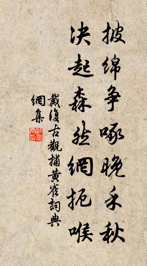 古詩文歷史字典書法欣賞書法字典國語詞典說文解字康熙字典古漢語字典披綿爭啄晚禾秋,決起森然網扼喉戴復古 《觀捕黃雀》名句出處出自宋代戴復古的《觀捕黃雀》全文:披綿爭啄晚禾秋,決起森然網扼喉。一飽等閒輸性命,知機萬不及沙鷗。名句書法欣賞披綿爭啄晚禾秋,決起森然網扼喉書法作品戴復古名句,觀捕黃雀名句名句推薦羹鱠疑居柁樓底,杯螯如墮酒船中徐似道《蓴菜二首》朝與府吏別,暮與州民辭白居易《答劉禹錫白太守行》風吹沙作雲,一時渡遼水李賀《雜曲歌辭。摩多樓子》桃源分散恨無期,忽意江城見有時張詠《和人牡丹》這官告、看看毀壞佚名《失調名》斯文千歲計,平世萬金軀陳造《謝龔養正病後分藥》紅粉淚縱橫,調弦向空屋劉商《相和歌辭。銅雀妓》吉日初成晦,方塘遍是春孫逖《晦日湖塘》嘉定癸未春,授筆題春詞陳著《先兄至能遠忌丙寅十一月十七日行都謝氏家寓》兩腳捎空欲弄春,一頭上又安人俞朝士《遊春黃胖》更何待、將宮報書元好問《太常引》當時若假三千騎,豈但區區活泰州張鎡《劉子履少聊輓辭二首》歸來宴平樂,美酒斗十千曹植《名都篇》祿優仍侍膳,官散得專經溫庭筠《送洛南李主簿》波涵玉鏡浸晴暉,鳴玉船移任昱《【正宮】小梁州_湖上分韻得》詩詞推薦山園文同〔宋代〕久雨無所適,新晴步山園。西風滿高林,敗葉驚已翻。時節急如此,世事安可論。夜歸燈下吟,寒蟲伴幽喧。喜遷鶯高觀國〔宋代〕歌聲悽怨。是幾度訴春,春都不管。感綠驚紅,顰煙啼月,長是為春消黯。玉骨瘦無一把,粉淚愁多千點。可憐損留客住王吉昌〔元代〕悟生滅。頓剿斷、馬顛猿劣。萬緣齊放,感得玄黃真訣。歸依洗心清淨,一向調燮。陰陽功決烈。呼精吸粹,盜虛初秋普明寺竹林小飲餞梅聖俞分韻得亭皋木葉歐陽修〔宋代〕臨水復欹石,陶然同醉醒。山霞坐未斂,池月來亭亭。河瀆神·風緊雁行高納蘭性德〔清代〕風緊雁行高,無邊落木蕭蕭。楚天魂夢與香消,青山暮暮朝朝。斷續涼雲來一縷,飄墮幾絲靈雨。今夜冷紅浦漵,白雲歌為李紫□作王冕〔元代〕我歌謫仙白雲歌,清風飄飄吹女蘿。女蘿風飛白雲出,秦山楚山爭嵯峨。秦楚之山青欲舞,白雲不向湖山住。忘機瓢飲陳子在病後見寄次韻奉答薛嵎〔宋代〕聞君臥病長於悒,文會過從跡頓疎。空對秋風驚節物,無因杯酒具圍蔬。柴刑晝揜聽殘雨,燈火涼生理故書。一啟題束季博山園二十首薝蔔林牟巘五〔宋代〕都將千石危,化作一林雪。盡日無別香,五月何曾熱。燕山送黃千戶之旴江汪元量〔宋代〕萬里關河道路迂,出門一笑意何如。來時雨雪侵駝褐,歸日風雲藹駟車。玉座喜聞黃石策,金台榮拜紫泥書。野人山居貽裴十二迪儲光羲〔唐代〕落葉滿山砌,蒼煙埋竹扉。遠懷青冥士,書劍常相依。霜臥眇茲地,琴言紛已違。衡陽今萬里,南雁將何歸。出徑