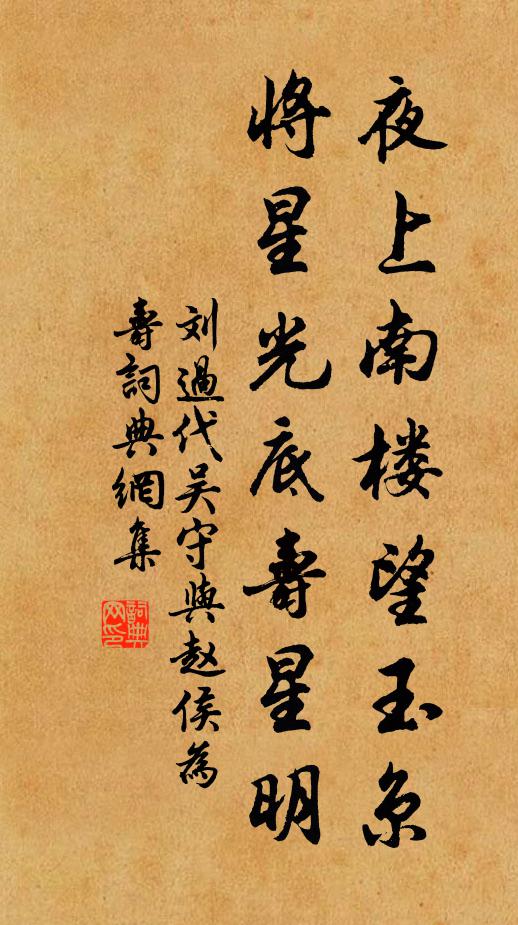 古詩文歷史字典書法欣賞書法字典國語詞典說文解字康熙字典古漢語字典夜上南樓望玉京,將星光底壽星明劉過 《代吳守與趙侯為壽》名句出處出自宋代劉過的《代吳守與趙侯為壽》全文:夜上南樓望玉京,將星光底壽星明。不須便即騎黃鶴,且為皇家致太平。劉過詩詞大全名句書法欣賞夜上南樓望玉京,將星光底壽星明書法作品劉過名句,代吳守與趙侯為壽名句名句推薦一盟一思,惟湯是則宋度宗《日新》諸餘里耍俏,所事裡聰明佚名《普天樂》百年事會紛成毀,一日光陰屢晦明陳杰《見邸報》結茅臨絕岸,隔水聞清磬韋應物《義演法師西齋》比曹賞賜飽無用,談話豈得希封侯晁補之《送龍圖范丈德孺帥慶》去年同渡江,江上風雷惡梅堯臣《送河內令孫偕兼懷太守晁子長》且偷取閒時,向此躊躇張耒《滿庭芳》聞君別後買傾城,酒戒中年亦放行劉克莊《得曾景建書一首》維宋肖德,欽天顧右真宗《寧宗郊前朝獻景靈宮二十四首》伯牙家有焦尾琴,朱弦長掛窗壁陰曾豐《載欣》欲著床頭浣濯衣,汗流成雨垢成泥曾幾《病起始浴二首》君家長松十畝陰,借我一庵聊洗心蘇軾《孔毅父以詩戒飲酒,問買田,且乞墨竹,次其》舟行不見江流闊,一上憑高覺快生趙蕃《雪浪閣二首》卻念故園春事,舞殘紅飛雪趙鼎《好事近(再和)》桃李漫山等俗流,諸楊汝是荔支儔史彌寧《又次韻楊梅三絕句》詩詞推薦憂國陸游〔宋代〕恩許還山已六年,誓憑耕稼餞華顛。養心雖若冰將釋,憂國猶虞火未然。議論孰能忘忌諱?人材正要越拘攣。群公句張士遜〔宋代〕李成謝世范寬死,唯有長安許道寧。偈二首釋休〔宋代〕風動邪,幡動邪,風鳴邪,鈴鳴邪。非風鈴鳴,非風幡動。此土與西天,一隊黑漆桶。誑惑世間人,請看滅胡種。贈石室朱修行兩絕洪咨夔〔宋代〕落葉堆中折腳鐺,白雲煮盡又還生。洞門黃鶴婆娑舞,留得松風待月明。醉蓬萊黃人傑〔宋代〕記征鴻歸候,夢燕來時,雪清梅瘦。寒日迎長,覺微寬宮漏。翼軫分輝,鬥牛呈瑞,間氣維鍾秀。江左風流,夷吾減字木蘭花·相逢不語納蘭性德〔清代〕相逢不語,一朵芙蓉著秋雨。小暈紅潮,斜溜鬟心只鳳翹。待將低喚,直為凝情恐人見。欲訴幽懷,轉過回欄叩玉尋春文同〔宋代〕馬行如疾輪,十里去尋春。盎盎日光麗,鮮鮮雲色新。樓台出花木,道路夾松筠。欲買前村酒,陶然作醉人。問政山拜墓方回〔宋代〕五十年前幼學時,登山諸父許追隨。兩人兄弟身俱老,萬古乾坤事可知。守墓鄰翁姑與酒,傳家後嗣孰能詩。獻花如夢令張元乾〔宋代〕臥看西湖煙渚。綠蓋紅妝無數。簾捲曲欄風,拂面荷香吹雨。歸去。歸去。笑損花邊鷗鷺。風入松(再用韻)侯置〔宋代〕霏霏小雨惱春光。煙水更彌茫。昨宵把酒高歌處,任一聲、雞唱清江。憔悴杏花如許,情懷應似東陽。宿酲猶在莫