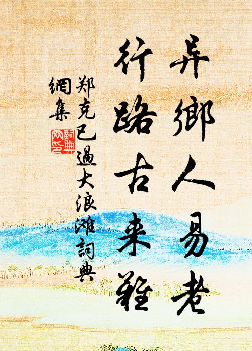 古詩文歷史字典書法欣賞書法字典國語詞典說文解字康熙字典古漢語字典異鄉人易老,行路古來難鄭克已 《過大浪灘》名句出處出自宋代鄭克已的《過大浪灘》全文:急浪吹飛雪,鳴稿破曉灘。異鄉人易老,行路古來難。玉露晨初濕,天河夜不乾。飄流雙鬢白,未有一枝安。鄭克已詩詞大全名句書法欣賞異鄉人易老,行路古來難書法作品鄭克已名句,過大浪灘名句名句推薦也知口業欠消磨,造物嗔人奈口何楊萬里《野望二首》車轍自隨芳草遠,歲華無奈夕陽催陸游《夢題驛壁》夢草詩情全老退,見花病眼尚分明劉克莊《陪宋侯趙粹過倉部弟家園賓主有詩次韻二首》麒麟作脯龍為醢,何似泥中曳尾龜白居易《九年十一月二十一日感事而作(其日獨游香山寺)》年來樂府不栽種,淡月青煙無處求李新《梨花》風物動歸思,煙林生遠愁張九齡《高齋閒望言懷》休三弄,留為與調羹佚名《小重山》徹見其源,如指諸掌釋正覺《偈頌二百零五首》一片古愁縈不斷黎廷瑞《青玉案》縣齋製錦留遺愛,庭樹藏環長舊園楊億《表弟廷憑章得象知信州玉山縣》十年前事影隨風陳德武《西江月》他年一笑同誰說,伴我三年江上村蘇轍《和王適新葺小室》嗟往事未塵,新愁還織,怎堪重訴吳潛《二郎神》晉唐以前舊人物,翩然乘風下大荒釋道璨《樗寮生日》兩幅新詩尤逡邁,泠然醒我以清風孔武仲《答李景文見寄》詩詞推薦謝徐容齋送米顧逢〔宋代〕米囊入戶甑無塵,一室歡聲四壁春。高廩如山堆積者,肯思白髮老人詩。十蟲吟舒岳祥〔宋代〕蟲有轉丸蜣,雙角牛怒張。生子牛矢中,轉圜技所長。兩兩如推車,千百滿路旁。彈丸有不若,累累圓且光。污穢記夢陸游〔宋代〕烏巾白紵憶當年,抵死尋春不自憐。憔悴劍南雙鬢改,夢中猶上暗門船。題竹友軒陳棣〔宋代〕長夏苦炎熱,開軒除鬱蒸。檐前鳥雀喧,朝旭上朱甍。席間裁函丈,詩書浩縱橫。盤礴環堵間,幽獨懷友生。古人鄭侍郎送蠟梅次韻三首曾幾〔宋代〕小瓶梅映短檠燈,幽興何人似我能。枉沐歌詞無用處,維摩詰是在家僧。閻立本職貢圖蘇軾〔宋代〕貞觀之德來萬邦,浩如滄海吞河江,音容傖獰服奇龐。橫絕嶺海逾濤瀧,珍禽瑰產爭牽扛,名王解辮卻蓋幢。粉本漁家傲梵琦〔元代〕聽說娑婆無量苦。橫遭獄訟拘官府。大杖擊身瘡未愈。重鞭楚。血流滿地青蠅聚。牒訴紛紛皆妄語。無人敢打登聞將出洛城過廣愛寺見三學演師引觀楊惠之塑寶蘇轍〔宋代〕寺古依喬木,僧閒正莫年。為生何寂寞,愛客尚留連。虛牖羅修竹,空廚響細泉。坐聽談舊事,遍識洛中賢。虛室元夕周邦彥〔宋代〕翠華臨闕巷無人,曼衍魚龍觸眼新。羽蝶低昂萬人醉,木山采錯九城春。閒坊厭聽粻煌鼓,曉漏猶飛{左車右歷}和唐伯憲二首姜特立〔宋代〕卜鄰初識面,把臂便論詩。摸索曹劉耦,憑陵漢魏時。新章專雅潔,古隸更清奇。若比江西派,無人說具茨。