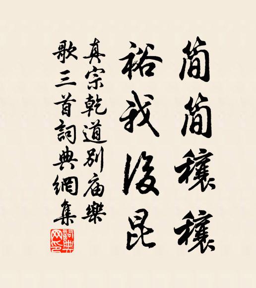 古詩文歷史字典書法欣賞書法字典國語詞典說文解字康熙字典古漢語字典簡簡穰穰,裕我後昆真宗 《乾道別廟樂歌三首》名句出處出自宋代真宗的《乾道別廟樂歌三首》全文:丕時文母,厚德維紳。仙馭雖邈,徽音固存。瑟彼玉瓚,酌此本尊。簡簡穰穰,裕我後昆。真宗詩詞大全名句書法欣賞簡簡穰穰,裕我後昆書法作品真宗名句,乾道別廟樂歌三首名句名句推薦親朋但數松篁在,霜露何滋橘柚甘馬一浮《松生垂詢近狀,書此奉簡》聖賢電拂休笑,離合許多賓客黃裳《喜遷鶯(表海亭冬日閒宴)》風度遠,襟懷爽黃人傑《賀新郎》嘗覘賦千字,誦之當縉笏李流謙《送勾龍伯秋出幕守三榮得出字》酒力漸濃春思盪柳永《蝶戀花·鳳棲梧》此中便見真訊息,莫浪驅馳覓鹿車張繼先《金丹詩四十八首》簡牘尤妙美,一字不可加葉適《哀鞏仲至》小生諒無似,積慶遭昌辰權德輿《伏蒙十六叔寄示喜慶感懷三十韻因獻之》花攢騏驥櫪,錦絢鳳凰窠盧綸《宴趙氏昆季書院因與會文並率爾投贈》閒隨白鷗去,沙上自為群李白《過崔八丈水亭》小城雖寂寞,尚復具輿台方回《大浪灘步至東館》世上乞憐帖雙耳,得失毫芒汗流水鄧肅《和謝吏部鐵字韻三十四首呈幾叟儀曹四首》吾衰已覺身如幻,汝老猶疑氣吐虹姜特立《送邦佐弟歸鄉》羈魂愁似絕,不復待猿吟戴叔倫《過柳州》願言烽火低,不到甘泉宮方岳《次韻酬季兄》詩詞推薦春遊女幾山圖唐寅〔明代〕女幾山前春雪消,路傍仙杏發柔條。心期此日來游賞,載酒攜琴過野橋。和家則堂韻贈高教之北衛宗武〔宋代〕別時欠折蘇堤柳,西方美人無恙否。子卿齧雪十九年,何似生前一杯酒。麒麟胡可係而羈,要使為祥在郊藪。當年送照禪人之湖南釋正覺〔宋代〕衡岳迎秋翡翠瘦,瀟湘漾風瑠璃皴。夜船載月急如箭,歸去來兮休問津。百字謠/念奴嬌三槐〔宋代〕武夷秀氣,萃君家、春色融和時節。賞了花朝才六日,曾記挺生英傑。量吸鯨川,志吞牛渚,標格冰壺潔。台星明早朝十絕趙子潚〔宋代〕廿載承恩侍九重,泰階玉燭喜遭逢。嘉禾瑞協當年兆,佇看遠夷貢獻同。會河道中王之道〔宋代〕會河村店西,沙水清練練。我行獨帶月,滉漾制金線。凝寒逼征衣,霜華重如霰。至此懷僧彌,老淚幾欲泫。讀周瑜傳韓元吉〔宋代〕年來三十過平頭,笑卻周郎卻自羞。但得小喬歌一曲,未須辛苦向荊州。出真州文天祥〔宋代〕人人爭勸走淮西,莫犯翁翁按劍疑。我問平山堂下路,忠臣見詘有天知。昨夜月中一睡殊有秋色覺書所見戲呈道孚張耒〔宋代〕幽人息遙夜,四聽市聲寂。月華清可掬,天色紺欲滴。候蟲先知秋,微響出陰壁。精熒高露濕,斷續殘河白。興懷次韻王宣義見過夜飲四絕毛滂〔宋代〕空琴誰為奏南風,坐看幽香走篆紅。定卜糟丘度余日,此生那復問蓍叢。