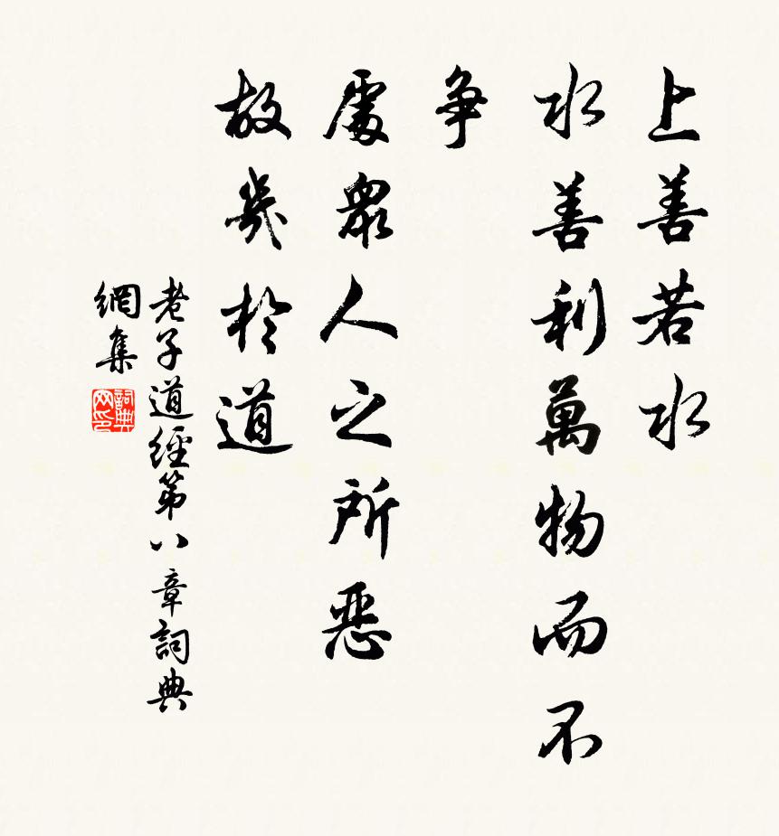 上善若水,水善利萬物而不爭。處眾人之所惡,故幾於道。居善地,心善淵,與善仁,言善信,政善治,事善能,動善時。夫唯不爭,故無尤。
