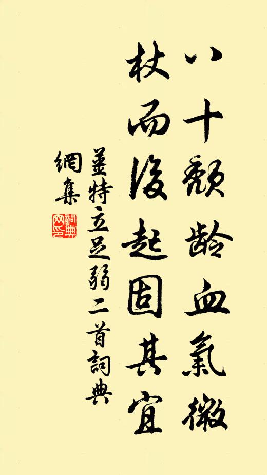 古詩文歷史字典書法欣賞書法字典國語詞典說文解字康熙字典古漢語字典八十頹齡血氣微,杖而後起固其宜姜特立 《足弱二首》名句出處出自宋代姜特立的《足弱二首》全文:八十頹齡血氣微,杖而後起固其宜。堯夫有句君聽取,腳力衰時藥不醫。名句書法欣賞八十頹齡血氣微,杖而後起固其宜書法作品姜特立名句,足弱二首名句名句推薦自顧曾傷翼,甘同不食瓜王禹偁《次韻和仲鹹對雪散吟三十韻》偉茲鄴侯,才不世出陳長方《李鄴侯贊》久無歸田人,今喜子去祿梅堯臣《寄光化退居李晉卿》蒼波繞廬阜,白浪縈銜霍何異《浮石山莊》猶有歸來鶴,清時欲與論趙師秀《林逋墓下》忽然突出肆橫流,險釋正覺《頌古一百則》君能認得自家珠,終身豈羨他人寶張繼先《靖通庵歌》涔陽指天末,北渚空悠悠郎士元《題劉相公三湘圖》無端種在幽閒地,眾鳥嫌寒鳳未知薛能《盩厔官舍新竹》快答此話頭,擬議計即疎張鎡《戲效樂天體》波間風艇一時歸趙彥端《鷓鴣天(白鷺亭作)》風塵苦未息,持汝奉明王杜甫《蕃劍》閒庭猶戲蝶,高柳已鳴蜩佚名《初夏》綠蘿自蒙密,白日易森沉王徵《題謝康樂石門作》始酌薰然和,中飲淡無慮韓維《滍城》詩詞推薦陽羅堡第八文天祥〔宋代〕日色隱孤戌,大江聲怒號。朝廷任猛將,宿昔恨滔滔。聞虜亂次前輩韻陸游〔宋代〕中原昔喪亂,豺虎厭人肉。輦金輸虜庭,耳目久習熟。不知貪殘性,搏噬何日足。至今磊落人,淚盡以血續。後生慶東宮生辰四首周必大〔宋代〕季秋日在房,房心乃明堂。煌煌心前星,於茲侍天王。休符協上象,九月誕元良。太史言有證,重暉照無疆。夜雨不睡鄭清之〔宋代〕少日無歡老易愁,鶯花過眼一春杯。清虛未解窮聃釋,情思誰能更孔周。白醉暫煩檐送暖,蒼顏惟恐鏡包羞。爭知送蓑衣與陳子淵漫成口號薛嵎〔宋代〕莎草為衣葉葉新,已知難上貴官身。野人相贈無他意,從使心親跡更親。贈劉明遠徐照〔宋代〕一生嫌世俗,不向市中居。既是未攀桂,卻堪同釣魚。疾除禪老藥,詩答野人書。又說成丹鼎,吾生愧不如。以詩代書答元丹丘李白〔唐代〕青鳥海上來,今朝發何處。口銜雲錦字,與我忽飛去。鳥去凌紫煙,書留綺窗前。開緘方一笑,乃是故人傳。故人寄送周子中監丞赴舒州二首趙蕃〔宋代〕欲問淮南米,皆雲歲不登。疲羸不難活,摩撫政須能。但使荒田辟,無勞鑄鐵增。素書寧敢寄,苦語未宜憎。晝寢石頤寺毛滂〔宋代〕何人支枕古邯鄲,孤臥僧房四面山。故遣白雲遮谷口,不教幽夢落人間。山行樓鑰〔宋代〕行入春山紫翠中,入山深處更桃紅。一百五日麥秋冷,二十四番花信風。千頃搖青幾蔽地,四山聳翠欲浮空。野橋