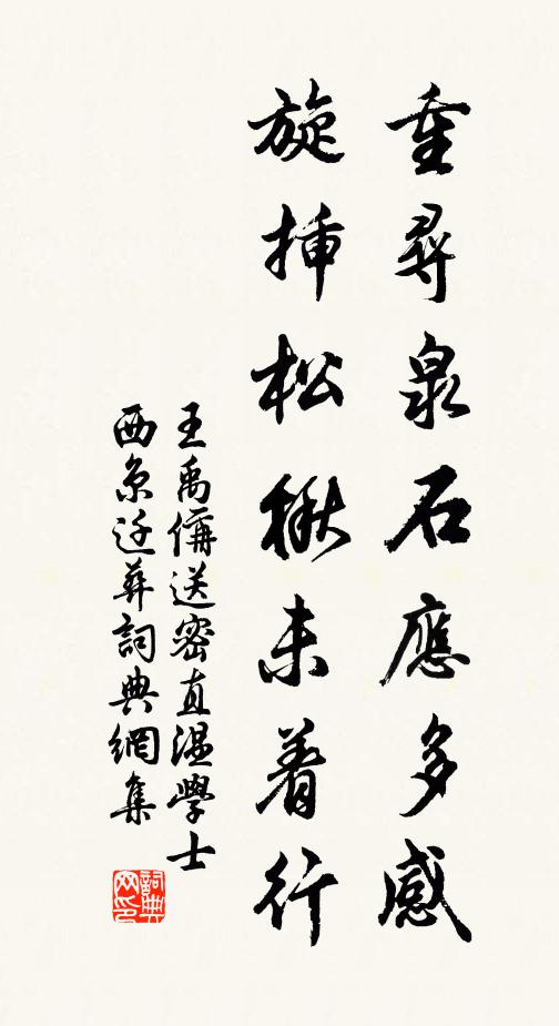 古詩文歷史字典書法欣賞書法字典國語詞典說文解字康熙字典古漢語字典重尋泉石應多感,旋插松楸未著行王禹偁 《送密直溫學士西京遷葬》名句出處出自宋代王禹偁的《送密直溫學士西京遷葬》全文:錦衣西去道何光,卜葬伊川舊釣鄉。留守開筵親舉白,故人垂淚看焚黃。重尋泉石應多感,旋插松楸未著行。一月歸程如有暇,雲間時到讀書房。名句書法欣賞重尋泉石應多感,旋插松楸未著行書法作品王禹偁名句,送密直溫學士西京遷葬名句名句推薦善惡臨時全在人尹志平《減字木蘭花》象天御宇,乘時布政佚名《明堂樂章。肅和》髻高釵自墜,腰細佩長垂錢惟演《宣曲二十二韻》何事上春日,坐令芳意闌劉禹錫《詠庭梅寄人(一作庭梅詠寄人)》白鶴峰前試吏時,尉曹詩酒樂新知陸游《予初仕為寧德縣主簿而朱孝聞景參作尉情好甚》天公尚不與,謂我取傷廉利登《盜犯金川境扶侍母妹復走興安有懷》太上留魂,老君練魄,又被瞿曇都掃殘汪莘《沁園春》暗香疎影春借力,更看青子駢枝頭陳造《次韻魏知元》賦詠差有愧,赤壁與滁山劉克莊《水調歌頭(客散循堤步月而作)》從今獨游後,不擬共人來白居易《仙遊寺獨宿》扶藤據幾久支離,敢料駸駸迫耄期陸游《歲晚》霜乾殷葉背林去,雨足黃雲歸谷來李新《山中秋意》可貴靈台物,七寶莫能比拾得《松月冷颼颼》天光不斷連春水,月影初來破夕嵐強至《和司徒侍中上巳會興慶池韻》周武從天人,戎衣舉仁兵強至《伯夷詩》詩詞推薦恭次家大人初抵季弟海陵官舍之韻孫應求〔宋代〕食貧寧問肉如陵,且喜官曹簡事程。千里平淮隨地闊,一江遠水照水明。幾我懷古登臨意,時作搔頭諷詠聲。酬唱【雙調】蟾宮曲 西湖徐再思〔元代〕十年不到湖山,齊楚秦燕,皓首蒼顏。今日重來,鶯嫌花老,燕怪春慳。聽越女鸞簫象板,惱司空霧鬢雲環。道院秋日與諸君馬頭山登高歐陽修〔宋代〕晴原霜後若榴紅,佳節登臨興未窮。日泛花光搖露際,酒浮山色入樽中。金壺恣灑毫端墨,玉麈交揮席上風。惟有晝眠陸游〔宋代〕困睫瞢騰老孝先,麤氈布被早霜天。珥貂碧落應無分,且向人間作睡仙。代同舍上黃相生辰三首仲並〔宋代〕列宿東南夜有輝,門弧此際誕英奇。晏嬰儉德人皆仰,召虎中興日可斯。名譽雅為天下望,孤忠自結聖君知。大椿游城南韓氏莊孟郊〔唐代〕初疑瀟湘水,鎖在朱門中。時見水底月,動搖池上風。清氣潤竹林,白光連虛空。浪簇霄漢羽,岸芳金碧叢。何言寺居睡覺陸游〔宋代〕虛窗寂寂夜三更,燈斂殘光避月明。老嬾只貪春睡美,媿聞童子誦經聲。上曾安撫二首郭印〔宋代〕萬口爭稱好使君,攜持踴躍看朱輪。入門便灑隨車雨,到處真成有腳春。魚鳥一時生意氣,江山千里有精神。大賢四言贈兄秀才入軍詩 其十八嵇康〔兩漢〕流俗難悟。逐物不還。至人遠鑒。歸之自然。萬物為一。四海同宅。與彼共之。予何所惜。生若浮寄。暫見忽終。三天竺還五首方回〔宋代〕澗晴石出水穿沙,萬樹松杉隱數家。一鳥不鳴風不動,忽聞林下響繅車。