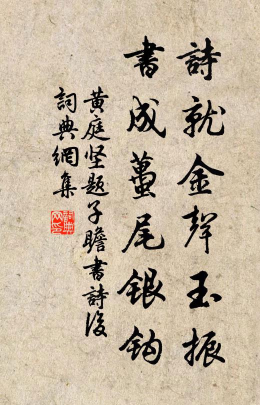 古詩文歷史字典書法欣賞書法字典國語詞典說文解字康熙字典古漢語字典詩就金聲玉振,書成蠆尾銀鉤黃庭堅 《題子瞻書詩後》名句出處出自宋代黃庭堅的《題子瞻書詩後》全文:詩就金聲玉振,書成蠆尾銀鉤。已作青雲直上,何時散發滄洲。黃庭堅詩詞大全名句書法欣賞詩就金聲玉振,書成蠆尾銀鉤書法作品黃庭堅名句,題子瞻書詩後名句名句推薦不信道為伊曾害馬致遠《落梅風》是為千載人,何有萬鍾祿趙蕃《寄主管舅二首》艤舟始搖漾,舉棹旋奔激戴叔倫《下鼻亭瀧行八十里聊狀艱險,寄青苗鄭副端朔陽》天下女子有情,寧有如杜麗娘者乎湯顯祖《牡丹亭記題詞》壯似陰山歌敕勒,悲於易水和漸離方回《九日詩馮伯田王俊甫劉元煇楊泰之見和複次韻》誠能得初心,何必返初服趙蕃《為龍泉令趙舜徒題》望鄉空引領何遜《贈諸游舊詩》春風破曉晴嵐濕,客子竛竮去程急袁說友《峽中聞杜鵑》金波古殿寒星簾,虹節蜺旌觀就試四錫《贈宋小著》歲月箭過歸有期,卻把本色初心娛父母陳著《送兒沆赴昌國學錄》呼兒急走送筠籃,敵暑惟應此物堪劉子翬《送瓜與胡原仲》至今滇昆水含怒,怒迸海脈浮平川李石《題金馬碧雞神祠》浮萍偶相值,悵此臨岐餞李處權《送范才元》看看眉黛低盧祖皋《更漏子》試問謫仙何處?青山外,遠煙碧韓元吉《霜天曉角·題採石蛾眉》詩詞推薦枕上鄭伯熊〔宋代〕飄風不崇朝,驟雨不終日。清寒入絺綌,御袷有餘郁。天時不能調,人事那可必。清燈耿孤窗,萬籟助飀飄。憂愁贈王侍御王建〔唐代〕愚者昧邪正,貴將平道行。君子抱仁義,不懼天地傾。三受主人辟,方出鹹陽城。遲疑匪自崇,將顯求賢名。自來少年游蘇軾〔宋代〕玉肌鉛粉傲秋霜。準擬鳳呼凰。伶倫不見,清香未吐,且糠秕吹揚。到處成雙君獨只,空無數、爛文章。一點香檀樂園假寐李新〔宋代〕藍天聲去復回,蟲絲長復短。江村石枕冷,一睫春夢斷。明朝騎馬且重來,日遲更為楊花暖。薰風亭劉仲堪〔宋代〕茲亭最高峙,勢與群峰仵。層軒一以臨,萬物皆下顧。賡歌音久絕,締構意何古。猿鳥豈有知,騰翔如率舞。飲酒過量肺疾復作蘇轍〔宋代〕朝蒙麴塵居,夜傍糟床臥。鼻香黍麥熟,眼亂瓶罌過。囊中衣已空,口角涎虛墮。啜嘗未雲足,盜釂恐深坐。使君挽趙秋曉李春叟〔宋代〕篋中遺藁墨猶新,門外池塘草自春。鄰笛一聲腸欲斷,騷壇失地倚樓人。滿江紅錦溪〔宋代〕蓬島仙翁,元來是、神鍾岳瀆。喜遇生申時節,一陽來復。蓂莢合朝曾舞翠,月華昨夜圓如玉。展紅箋、泚筆染新栟櫚山陳偁〔宋代〕名藍依淨境,風物倍精神。翠巘藏山跡,寒潭絕世塵。嶺猿吟送月,山鳥語留人。擬學棲真客,林泉老此身。入夜劉應時〔宋代〕入夜雨聲細,小窗燈影寒。僻居成懶惰,飽食幸平安。時事不復問,舊書時一看。欣然會心處,香燼一爐殘。