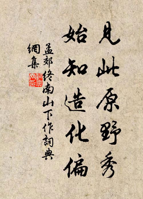 古詩文歷史字典書法欣賞書法字典國語詞典說文解字康熙字典古漢語字典見此原野秀,始知造化偏孟郊 《終南山下作》名句出處出自唐代孟郊的《終南山下作》全文:見此原野秀,始知造化偏。山村不假陰,流水自雨田。家家梯碧峰,門門鎖青煙。因思蛻骨人,化作飛桂仙。孟郊詩詞大全名句書法欣賞見此原野秀,始知造化偏書法作品孟郊名句,終南山下作名句名句推薦曾向華山圖上看,又添潘閬倒騎驢釋守淨《偈二十七首》待喚良工鐫硯背,偷兒攜出有人知劉克莊《余常用小端硯失之經年忽在常賣人手中以錢贖》半世游從,到處逢迎,惟爾麴生張野《沁園春 止酒效稼軒體》一氣運行於虛空,有形孰不歸陶鎔衛宗武《用韻再作》不似文章雋老,重來鳴步斗樞間李廷忠《慶清朝》飛上煙嵐頂,三縷明霞照晚,時對胎仙曹勛《滿路花/促拍滿路花》平生丈人行,每語盡箴規呂祖謙《又二首》金石宣和韶九奏,乾坤薦壽岳三呼蘇頌《興龍節集英殿宴教坊口號》經宿留閒客,看雲作主人許棠《送王侍御赴宣城》行幽兔跡深,矚遠鴉翅緩刁繹《雪後游琅玡山與韋驤聯句》樹石向聞清漢浪,水風初見綠萍陰薛能《西縣作》新詩溢巾幅,見寄警庸懦韓維《答王詹叔見寄》青春本是耐官勞,卻入山居便養高陳著《又次韻帥初諸前七首》經過里巷春,同是謝家鄰盧綸《酬孫侍御春日見寄》唯思未有前,以理遣傷苦白居易《念金鑾子二首》詩詞推薦青山汪若楫〔宋代〕萬木驚秋各自殘。蛩聲扶砌訴新寒。西風不是吹黃落,要放青山與客看。虞美人·愁痕滿地無人省納蘭性德〔清代〕愁痕滿地無人省,露濕琅玕影。閒階小立倍荒涼。還剩舊時月色在瀟湘。薄情轉是多情累,曲曲柔腸碎。紅箋向壁偈頌一百六十首釋宗杲〔宋代〕佛子住此地,則是佛受用。常在於其中,經行及坐臥。僕射相公偶話於故集賢張學士廳寫得德裕…獻此詩李德裕〔唐代〕賦感鄰人笛,詩留夫子牆。延年如有作,應不用山王。江城子毛並〔宋代〕倚牆高樹落驚禽。小窗深。夜沈沈。酒醒燈昏,人靜更愁霖。惆悵行雲留不住,攜手處,卻分襟。悠悠風月兩關心宿玉龍宮周承勛〔宋代〕夜爇松脂火,朝焚柏子香。舉家來萬壽,佳節遇重陽。雨止雲穿日,風高天欲霜。吾廬籬下菊,應怪未還鄉。絕句六十四首張伯端〔宋代〕天地盈虛自有時,審觀訊息始知機。由來庚甲申明令,殺盡三屍道可期。不奈吳則禮〔宋代〕不奈淮南熱,遙知秋可憐。烏皮垂老事,白髮半生禪。井水從兒汲,茶鐺姑自煎。何時決明好,堂下晚鮮鮮。水亭舒眺釋文珦〔宋代〕秋風水上亭,獨坐望郊坰。佛寺山偏好,漁家地亦腥。桑枯因抱蠍,草腐自生螢。踏月歸林下,柴扉尚未扃。題洞靈觀釋輝〔宋代〕古觀多松檜,幽期近暮秋。坐看新月上,間見斷雲愁。野思同花鳥,鄉情隔島洲。輕寒披鶴氅,隱几自搔頭。