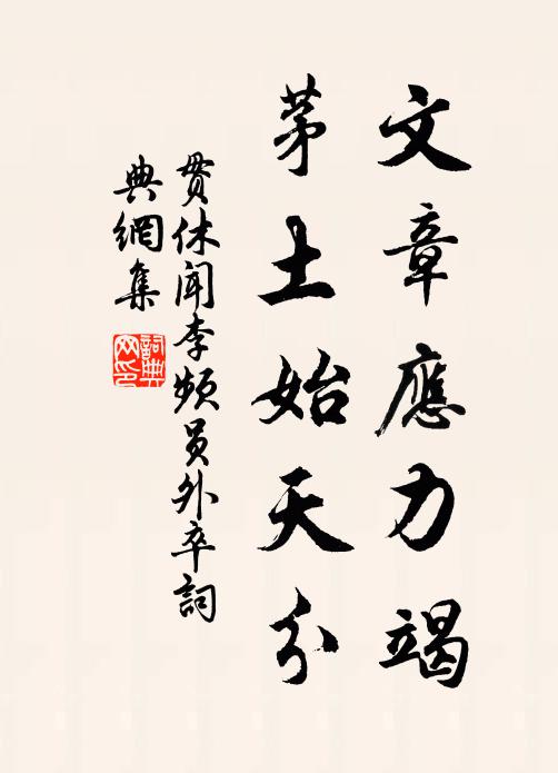 古詩文歷史字典書法欣賞書法字典國語詞典說文解字康熙字典古漢語字典文章應力竭,茅土始天分貫休 《聞李頻員外卒》名句出處出自唐代貫休的《聞李頻員外卒》全文:蒼蒼難可問,問答亦難聞。落葉平津岸,愁人李使君。文章應力竭,茅土始天分。又逐東風去,迢迢隔嶺雲。貫休詩詞大全名句書法欣賞文章應力竭,茅土始天分書法作品貫休名句,聞李頻員外卒名句名句推薦外台綱紀掾,先辟漢名人毛滂《送徐次山督郵之官》群玉府,紫微天李劉《鷓鴣天(壽吳倅·九月初七)》縱然有少殘零熱,自是無緣頓段涼吳潛《七用喜雨韻三首》帝城雲物得陽春,水國煙花失主人章孝標《贈陸鬯浙西進詩除官》小枝圓熟棗累累,短綠尖新麥透泥鄭剛中《馬上口占三絕》忍飢奈凍得嘉句,好在濡筆傳中州王灼《送南平僧歸里》相望樓殿間,宛在雲霄半刁繹《雪後游琅玡山與韋驤聯句》暮年身似一虛舟,付與滄波自在流陸游《北園雜詠》冬我瘴爾雪,夏我魃爾雨劉黻《悼使君趙計院》白兔不忍殺,嘆息愛其老蘇洵《歐陽永叔白兔》鬼藍柄國苦相誤,佛會守城甘自痴陳著《次韻前人傷古》欲醉阿誰同一飲,擬賦才成又止韓淲《賀新郎(十三日,小園梅枝微紅點綴,便覺可句)》驥伏鹽車不稱情,輕裘肥馬鳳凰城黃庭堅《次韻晁補之廖正一贈答詩》執戇無智,空恁亂覓胡猜侯善淵《聲聲慢》更惺惺言語楊無咎《滴滴金》詩詞推薦寄子章某〔宋代〕九十衰翁七十兒,此時那可兩分離。客鄉已是三年別,人世應無百歲期。春雁北飛頻送目,夕陽西下幾顰眉。何如送史館高員外使嶺南徐鉉〔唐代〕東觀時間暇,還修喻蜀書。雙旌馳縣道,百越從軺車。桂蠹晨餐罷,貪泉訪古初。春江多好景,莫使醉吟疏。餞友宰丹陽万俟紹之〔宋代〕昔曾覘吏事,不是小規模。萬象胸中布,全牛眼底無。迅雷推敏速,片月對清孤。鐵瓮城邊邑,今番凋瘵蘇。一高亭二首程公許〔宋代〕一棹松江朔雪饕,椒漿曾此酹三高。遠遊借與薰風便,偉觀還如昔日遭。喚起玉龍噓霧雨,饒教彩昭蜺戰雲濤。平壽寧節祝聖壽王禹偁〔宋代〕謫宦商於又解梁,二年不見赭袍光。重來班列雖疏遠,祝壽情深淚數行。游雲光寺李提舉領客將至留二小詩周必大〔宋代〕作者正七人,飲中空八仙。長齋詎容醉,晉也合逃禪。節夫釋紹曇〔宋代〕一生堅守居延操,歷盡間關見老成。菊噀晚香松傲雪,短筇扶瘦日尋盟。晨起陸游〔宋代〕天公擇地養衰殘,著向桑村麥野間。曉色入簾初滉漾,幽禽窺戶已間關。酒徒散去稀中聖,詩思衰來媿小山。一炷送蘇判院赴江東辟朱翌〔宋代〕春風桃李正開花,客路江山亦可嘉。白鷺洲前浪山起,烏衣巷口夕陽斜。一星終矣君重往,四壁蕭然我獨嗟。元佑雜題陸游〔宋代〕半飽半飢窮境界,知晴知雨病形骸。軒昂似鶴那求料,枯槁如僧不赴齋。