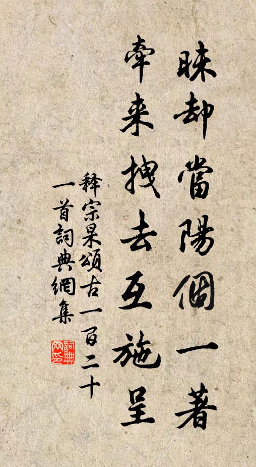 古詩文歷史字典書法欣賞書法字典國語詞典說文解字康熙字典古漢語字典昧卻當陽個一著,牽來拽去互施呈釋宗杲 《頌古一百二十一首》名句出處出自宋代釋宗杲的《頌古一百二十一首》全文:昧卻當陽個一著,牽來拽去互施呈。不知除卻王維手,更有何人畫得成。釋宗杲詩詞大全名句書法欣賞昧卻當陽個一著,牽來拽去互施呈書法作品釋宗杲名句,頌古一百二十一首名句名句推薦睨而不驚,知神之全孔武仲《雷亭四言》日落滄江晚,停橈問土風陳子昂《白帝城懷古》芳菲餘雨露,冠蓋舊公侯武元衡《和楊弘微春日曲江南望》諸生程藝文,承詔當品目黃庭堅《次韻冕仲考進士試卷》遙懷向英義,潛想一夕馳文同《寄友人》歲雲暮矣增憂謝靈運《上留田行》功名夢斷身無用,閒補離騷學楚吟黃庚《書懷》幸自枝條能樹立,可煩蘿蔓作交加韓愈《游城南十六首楸樹二首》才郎一去信音疏,長嘆吁,香臉淚如珠白樸《【中呂】陽春曲_知幾知榮知》曩與劉公同一邦,如今背我去堂堂魏了翁《李微之聞其弟貫之西歸以詩迓之劉左史和韻屬》齊安不可望,滅沒孤城暗張耒《宿樊溪》躊躇不自釋,淥酒徒芳辛李處權《將游西池偶書》一枝欲寄北人看趙子發《阮郎歸·馬蹄踏月響空山》夜月水南寺,秋風城外砧張祜《題上饒亭》對此塊然唯土木,降茲未始不魂銷邵雍《和商守新歲》詩詞推薦歲暮姚勉〔宋代〕歲暮仍為客,書客默自嗟。雁聲催念友,魚膾起思家。廊靜風鳴葉,窗虛雪入花。醉鄉聊避世,天外自寒鴉。偈傾一百六十九首釋智朋〔宋代〕黃檗棒頭,馬祖喝下。家家春風二三月,處處綠楊堪系馬。放缽石章得象〔宋代〕石上曾經轉缽盂,石邊南北路崎嶇。行人見石空嗟歡,還識西來意也無。試筆六言二首劉克莊〔宋代〕薰玉蕤香解穢,挽銀河水滌塵。雖非補造化筆,不似食煙火人。乙巳邵武建寧夜坐書呈諸公陳普〔宋代〕深山夭矯老風霜,自是光明好棟樑。不待萬牛托挽去,不如僵柳與枯楊。寄象田曇藏主釋雲岫〔宋代〕迢迢西望越山青,水宿山行是幾程。為憶象耕遺蹟事,勞心雖苦未勞形。瀟灑亭呂希純〔宋代〕郡因賢守得佳名,水態山光會此亭。雲外僧歸穿竹塢,日邊鷗下集沙汀。浮梁倒影橫雌霓,寶塔張燈疊萬星。不獨南堂五首蘇軾〔宋代〕山家為割千房蜜,稚子新畦五畝蔬。更有南堂堪著客,不憂門外故人車。贈吳氏兄弟三首陳師道〔宋代〕得失媸妍只自知,略容千載有心期。恨君不識金華伯,何處如今更有詩。清燕亭司馬光〔宋代〕波澄蔭群木,永日淇清華。碧筱靜秋色,白苹低晚花。松聲工醒酒,泉味最便茶。外事付丞掾,無妨風景嘉。