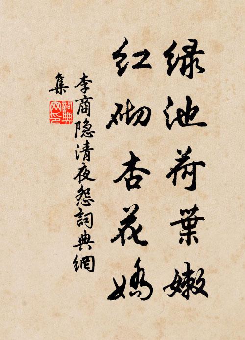 古詩文歷史字典書法欣賞書法字典國語詞典說文解字康熙字典古漢語字典綠池荷葉嫩,紅砌杏花嬌李商隱 《清夜怨》名句出處出自唐代李商隱的《清夜怨》全文:含淚坐春宵,聞君欲度遼。綠池荷葉嫩,紅砌杏花嬌。曙月當窗滿,征雲出塞遙。畫樓終日閉,清管為誰調。名句書法欣賞綠池荷葉嫩,紅砌杏花嬌書法作品李商隱名句,清夜怨名句名句推薦去矣莫久留桑下,歸歟來共煨芋頭范成大《送舉老歸廬山》寒光遠動天邊水,碧影出空煙外山劉滄《夏日登西林白上人樓》身不沉,骨不重僧齊己《雜曲歌辭升天行》鳥道懸崖忽飛騫,戲擲短劍聲鏗然陸游《贈宋道人》雪山清淨問因緣,未識乾坤造化權胡宏《題上封寺》門無過客常籠鶴,園鑿新池學釣魚潘璵《贈白雲道人》短園園敗屋,不見花葯麗牟巘《次史德載韻示諸孫》浩歌待明月,曲盡已忘情李白《春日醉起言志》南有屏山掩翠扉,齊雲亭子漫尋基董嗣杲《南屏山》非君誰能贊陸雲《為顧彥先贈婦往返詩四首》行到水邊心會處,夕陽一樹否花明陳深《小園即事》功名肯擅一丘樂,突兀須教天下歡陳宓《次仙豀陳侍郎韻寄題劉尚書二首秀野》紹興癸丑,罷帥南海,即棄官不仕向子諲《西江月·五柳坊中煙綠》天高萬物肅,虛寂在川岑黃庭堅《陳吉老縣丞同知命弟游青原謁思禪師予以簿領》且願相留歡洽,張籍《賦花》詩詞推薦和王郎中題華州李中丞廳姚合〔唐代〕蓮華峰下郡齋前,繞砌穿池貯瀑泉。君到亦應閒不得,主人草聖復詩仙。還京樂(送陳行之歸吳)張炎〔宋代〕醉吟處。多是琴尊,竟日松下語。有筆床茶灶,瘦筇相引,逢花須住。正翠陰迷路。年光荏苒成孤旅。等趁燕檣,晚步陸游〔宋代〕屏居無俗事,薄暮行溪園。斷續風蟬噪,俯仰露葉翻。月出照西壁,參差見檐痕。新沐嬾不櫛,清冷入髮根。臨流送鄭推官赴分州司馬光〔宋代〕形便豳公國,旗旄擁將壇。秦雲低落日,塞樹 * 。草檄無留思,投壺不廢歡。還應笑黃卷,寂寂守儒官。贈無咎以既見君子云胡不喜為韻八首八張耒〔宋代〕南山縛虎師,肯顧世書字。揚眉喔楚喉,鼎畔倒侯喜。詩聲一蒼蠅,下到霹靂耳。庸庸老尋常,物外有奇偉。狂題二首司空圖〔唐代〕草堂舊隱猶招我,煙閣英才不見君。惆悵故山歸未得,酒狂叫斷暮天雲。須知世亂身難保,莫喜天晴菊並開。長短春日雜言十一首趙蕃〔宋代〕山中寂寞少花枝,過盡春風病不知。未分春歸便無跡,陶瓶聊復浸酴醾。次蘭皋自詠楊公遠〔宋代〕生來無分對書燈,卻喜逢人便眼青。枵腹謾臨求米帖,學耕頻勘相牛經。堎贈骨相身長健,磊磈襟懷鬢未星。密掩石頤寺程九萬〔宋代〕聞法師來杖錫東,於菟蹭蹬奮雷風。當時地裂泉隨動,一酌清甘萬慮空。聞金吾妓唱梁州李頻〔唐代〕聞君一曲古梁州,驚起黃雲塞上愁。秦女樹前花正發,北風吹落滿城秋。