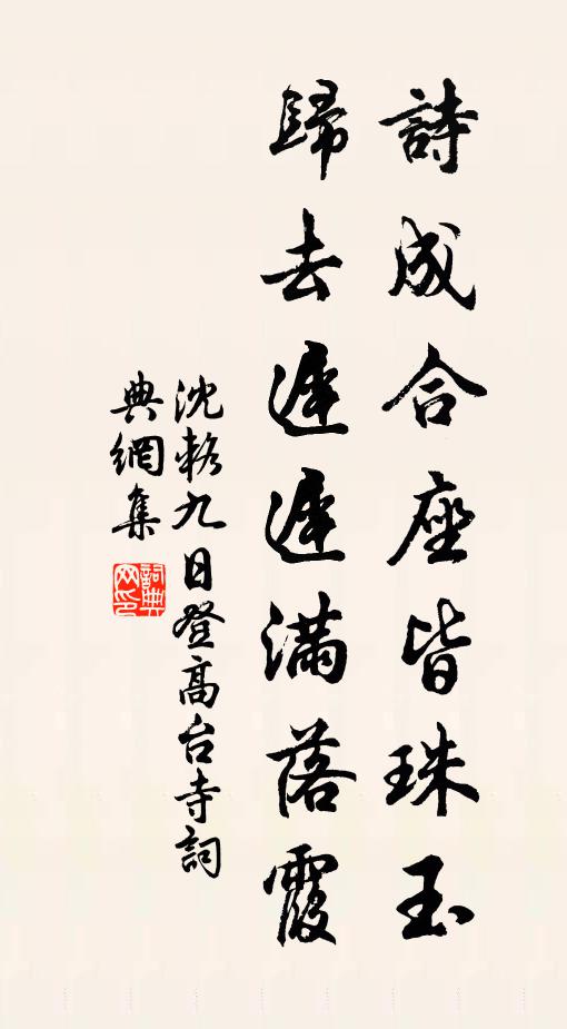 古詩文歷史字典書法欣賞書法字典國語詞典說文解字康熙字典古漢語字典詩成合座皆珠玉,歸去遲遲滿落霞沈輅 《九日登高台寺》名句出處出自清代沈輅的《九日登高台寺》全文:萬里秋光客興賒,同人九日惜年華。台高不盡看楓葉,院淨何須坐菊花。對酒披襟形獨放,憑風落帽笑誰加。詩成合座皆珠玉,歸去遲遲滿落霞。名句書法欣賞詩成合座皆珠玉,歸去遲遲滿落霞書法作品沈輅名句,九日登高台寺名句名句推薦樂天投老刺抗蘇,溪石胎禽載舳艫蘇轍《讀樂天集戲作五絕》我思見諸姑,正復如父存晁公溯《王元才攜家來過有詩風示因簡此作》與君細說爐亭話,強對檳榔萋菜盤朱翌《與羅教授飯園中種梔子》金門倦鳴玉,千騎出東方司馬光《送王校理守琅琊》涖卜他年正首丘,尚乘風日逐英游曹彥約《春同伯中之櫟田》人散廟門燈火盡,卻尋殘夢獨多時王安石《臘享》大學三年聞琢玉,東堂一舉早成名錢起《送張參及第還家》燕子無情,不管帆檣起張雨《蝶戀花 清明日,去梁溪,元鎮買舟追送》晴光分渚曲,綠氣冒原田馬戴《題吳發原南居》起觀疆宇皆周土,只有西山尚屬商王奕《四絕呈周月湖》玉斝恩波遍,靈輼煙雨霏權德輿《德宗神武孝文皇帝輓歌詞三首》雨入殘更滴,霜逢閏歲遲陸游《臥疾》昔年今日度松關,車馬崎嶇行路難耶律楚材《過夏國新安縣》周妻何肉敗吾事,成佛定輸靈運先賀鑄《贈僧孚》箇中顯訣難傳,無名可喚,貴在心通達李道純《百字令 贈通庵》詩詞推薦游承天望廣德湖舒坦〔宋代〕桃源二月春風起,是處農華有桃李。調笑聞聲不見人,遊人只在華山裹。華山逋客來何遲,隱隱茶林隔煙水。滿眼山泉為惠君疇賦仇遠〔宋代〕空青穿秋旻,瘦白噴夏雪。若非林下士,誰識此高潔。山中非無雲,蒼狗隨變滅。山中非無月,陰晴易圓缺。不如除日失步詩以自解虞儔〔宋代〕雙腳平生不踏空,誰教仰面看飛鴻。娛親正要同萊子,爛醉何曾過阿戎。已分折腰營五斗,恐因折臂作三公。妻孥鷹馬辭楊維楨〔元代〕鷹使司漏,馬使警偷。臧者守杼,獲者運牛。彼此職廢,空抱主憂。君不見薛恭尹賞各有所,兩地一易俱稱優。壽蕭東海丘葵〔宋代〕樂哉東海老,天與以遐齡。前一輩人物,為諸生典型。頭因嗜書白,眼不要人青。歲歲桑蓬旦,人間活壽星。樂壽縣君呂氏輓詞二首黃庭堅〔宋代〕歸裝衣楚楚,家世印累累。來作箕帚婦,不忘蘋藻詩。居然成萬古,何啻謁三醫。騎省還秋直,霜侵鬢腳衰。曾宏甫見過因問訊鞓紅花則雲已落矣驚呼之餘曾幾〔宋代〕不令老眼看鞓紅,豈是青春不負公。尚有揚州風物在,亦防此段並成空。三賢堂徐恢〔宋代〕六井猶存記,三賢尚有堂。地連金 * ,廟接水仙王。市井空陳跡,杉松只舊行。唯公識真意,此處酒難忘。題雙岩堂曾幾〔宋代〕老子徜徉地,岩幽想像間。綠陰城角路,青嶂屋頭山。簿領惟生睡,壺觴不解顏。使人留眼處,龕壁字迴環。頌古二十九首釋師體〔宋代〕強盜遭逢惡抵家,賊贓才敗別無他。山藤徹骨令 * ,反與渠儂貼面花。