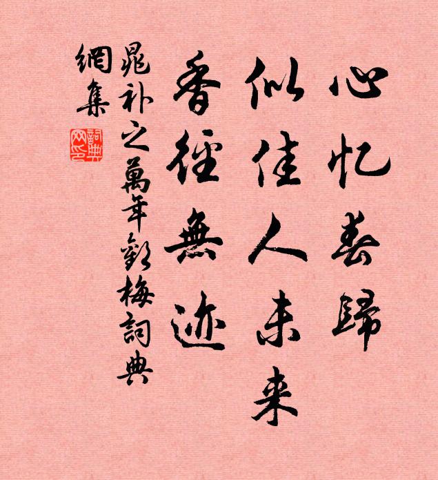 古詩文歷史字典書法欣賞書法字典國語詞典說文解字康熙字典古漢語字典心憶春歸,似佳人未來,香徑無跡晁補之 《萬年歡(梅)》名句出處出自宋代晁補之的《萬年歡(梅)》全文:心憶春歸,似佳人未來,香徑無跡。雪裡江梅,因甚早知訊息。百卉芳心正寂。夜不寐、幽姿脈脈。圖清曉、先作宮妝,似防人見偷得。真香媚情動魄。算當時壽陽,無此標格。應寄揚州,何郎舊曾相識。花似何郎鬢白。恐花笑、逢花羞摘。那堪羌管驚心。也隨繁杏拋擲。名句書法欣賞心憶春歸,似佳人未來,香徑無跡書法作品晁補之名句,萬年歡(梅)名句名句推薦葬用兩日,手板相亞佚名《烏氏葬碑》經旬三尺雪,萬物變顏色歐陽修《喜雪示徐生》欲從寧水成仙骨,趁得先生未出關陽枋《赴大寧司理贄俞帥》古來共一死,何至爾寂寂!秋風兩京道,上有胡馬跡陸游《書悲》木連芝三秀,玉燭協和平佚名《六州》舜處嚚傲厄,文居君臣窮舒岳祥《琴旨》蒙蒙青羅帔,粲粲白玉鈿樓鑰《伯中弟生朝賦酴醿》紅如鹹池浴朝日,瑩若璧月沉秋波釋寶曇《和史魏公荷花》一叢萱草,數竿修竹,幾葉芭蕉石孝友《眼兒媚·愁雲淡淡雨蕭蕭》道學固未泯,吾謀復誰陳韓元吉《送楊安止罷信幕赴調》初聞鏘鐐跳,積漸調參差陸龜蒙《奉和襲美太湖詩二十首明月灣》西陵久茫茫沈約《八詠詩 解佩去朝市》簾窗幕戶便防冷,且恐霰雪相尋來王安石《秋熱》甚欲一行陪祖帳,萬山遙隔幾重雲李昴英《送廣東憲陳均二首》密議初如用,艱危豈易形夏竦《奉和御製讀唐書》詩詞推薦去年張耒〔宋代〕去年四月多風雨,麥秀不實農夫苦。今年麥好風雨調,萬口嗷嗷飢待哺。何事今晨還衣夾,朝日無光寒慘切。天工送蕨與成父趙蕃〔宋代〕道人惠我南山蕨,頗帶齋廚法醬香。聞道城中少蔬供,急令健步走傾筐。孟子親親仁民愛物陳普〔宋代〕仁體雖然無不愛,當知貴賤與親疏。誠心應物寧容偽。天性由來一本真。橋西劉克莊〔宋代〕昔飲橋西歲月多,梨花深處待郎過。垂鞭欲訪湔裙約,奈此蕭蕭鬢雪何。鷓鴣天趙長卿〔宋代〕洗盡鉛華不著妝。一般真色自生香。飄飄何處凌波女,故故相迎馬上郎。尋譜諜,發詩囊。絕勝梅萼嫁冰霜。故山題簡上人西亭詩文後劉翼〔宋代〕真如非字義,綺語道之疵。未見西亭作,長為北磵欺。晚因僧媚遠,初實客從曦。多少才名士,沉淪世不知。禪人並化主寫真求贊釋正覺〔宋代〕白髮星星,骨癯氣清。雪浸山嵂屼,秋在水渟泓。流琥珀兮澗松老,射珊瑚而波月明。影落大千去也,何妨觸處崢春日途中廖行之〔宋代〕人家二月燕始歸,春陰還近清明期。我行東指來江上,傑木夾徑如旌旗。驅馳不憚百里遠,解後時醉青簾垂。懸知丁香結周邦彥〔宋代〕蒼蘚沿階,冷螢粘屋,庭樹望秋先隕。漸雨淒風迅。澹暮色,倍覺園林清潤。漢姬紈扇在,重吟玩、棄擲未忍。登茂洪赴漕試歸苦目疾張鎡〔宋代〕潘侯兩鬢光如月,盡日看山常拄笏。經營菽水才有餘,赴調地飯店況乾謁。少年習氣秋來發,羅藝文場肆猖獗。楊