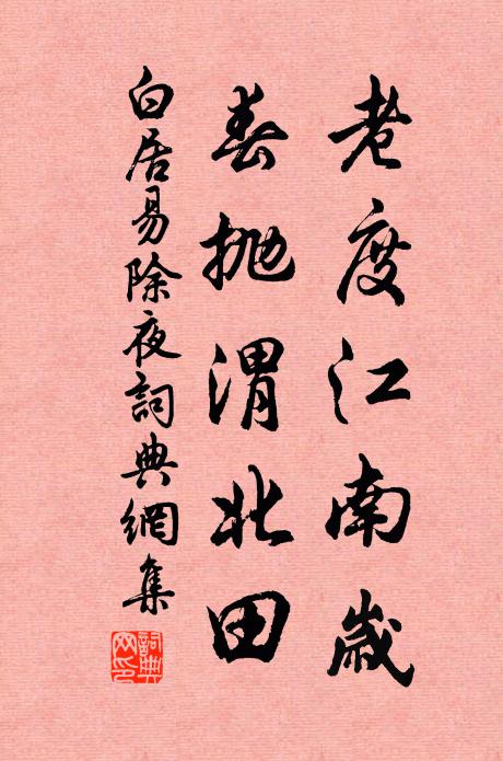 古詩文歷史字典書法欣賞書法字典國語詞典說文解字康熙字典古漢語字典老度江南歲,春拋渭北田白居易 《除夜》名句出處出自唐代白居易的《除夜》全文:薄晚支頤坐,中宵枕臂眠。一從身去國,再見日周天。老度江南歲,春拋渭北田。潯陽來早晚,明日是三年。名句書法欣賞老度江南歲,春拋渭北田書法作品白居易名句,除夜名句名句推薦亦知食不足,但有餓而死陸游《示兒》且喚取、雙歌送行蒲道源《太常引 送趙參政西城別筵》高亭一騁望,舉酒共為壽劉禹錫《和浙西李大夫晚下北固山喜徑松成陰悵然懷古…和依本韻》方舟惜鶴並惜畫,一夔之足萬金價李石《余所藏李文才畫鶴甚奇偉歲久縑爛各缺一趾偶》笑欣悲怨類咆哮王哲《西江月》獨繞空壇下,山風動紫芝魏野《留題華山陳先生舊隱》覺來知是虛無事,山中雪平雲覆地李端《雜歌呈鄭錫司空文明》壯歲從游兩鬢霜,重來函太各堪傷陳傅良《挽尤延之尚書》燈前細與兒曹說,蠹簡猶堪數世傳陸游《新涼書懷》深院閉斜陽,燕入陰陰簾影晁沖之《如夢令》微吟忽忘歸,俗駕不可宿孫應時《游靈岩觀瀑布》芍藥荼還又是,仗何人、說與司花女吳潛《賀新郎》山巔閒地步,溪面白雲多洪咨夔《答贈劉交代二首》都門昔供帳,疏傅未為榮司馬光《次善堂宴餞應詔》品流不落松竹後,懷抱惟應風月知陸游《梅花已過聞東村一樹盛開特往尋之慨然有感》詩詞推薦偈頌二十一首釋普寧〔宋代〕青州布衫重七斤,由來錯認定盤星。那知富士山孤峻,到頂須行三日程。挽李制乾子誠林光朝〔宋代〕千金治產似孫吳,珠箔銀觥只自如。問我長風當夕起,數他極浦落帆初。自知汗簡今千軸,更說生犀有幾株。赤壁古詩龐謙孺〔宋代〕十旬五旬病,三日兩日餓。閉門本求安,歲月不可過。秋成尚百日,急迫如星火。西風吹楸林,木葉朝來墮。夕陽過宿趙次張郊居二首張元乾〔宋代〕莫嘆交遊晚,相期歲月深。秋來初識面,老去要知心。燈火須更仆,杯盤取自斟。平生王霸術,袖手有微吟。蟾宮曲 夢中作鄭光祖〔元代〕敝裘塵土壓征鞍,鞭倦裊蘆花,弓箭蕭蕭,一逕入煙霞,動羈懷,西風禾黍,秋水蒹葭,千點萬點,老樹寒鴉,三除夜楊公遠〔宋代〕老境漸相干,饒儂鬢未斑。歲華今夜換,天道此時還。累重家常儉,身輕心自閒。莫愁生計薄,筆底有青山。送韋八少府判官歸東京崔峒〔唐代〕玄成世業紫真官,文似相如貌勝潘。鴻雁南飛人獨去,雲山一別歲將闌。清淮水急桑林晚,古驛霜多柿葉寒。瓊樹時中良弼茂元慎儀集水閣劉子翬〔宋代〕水色兼山影,漂搖小閣西。風來幽囀活,雨過萬紅低。炯炯杯中趣,喧喧枕裹學。新年一聲笑,四友在潭溪。賀新郎(四用縷字韻為王實之壽)劉克莊〔宋代〕萬字如針縷。憶王郎、丹墀大對,氣為文主。貴近旁觀俱失色,仰止如天聖度。笑杜牧、成名居五。晚面清光猶苦白髮三首趙蕃〔宋代〕葉落歸根莫漫悲,春風解發次年枝。人如草木空多智,一老寧聞再少時。
