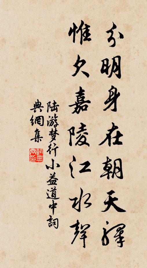 古詩文歷史字典書法欣賞書法字典國語詞典說文解字康熙字典古漢語字典分明身在朝天驛,惟欠嘉陵江水聲陸游 《夢行小益道中》名句出處出自宋代陸游的《夢行小益道中》全文:櫸柳林邊候吏迎,血塗草棘虎縱橫。分明身在朝天驛,惟欠嘉陵江水聲。陸游詩詞大全名句書法欣賞分明身在朝天驛,惟欠嘉陵江水聲書法作品陸游名句,夢行小益道中名句名句推薦登遐皆十月,揚烈擅三朝許月卿《大行皇帝輓詞五首》悵望瑤台清夜月,還送歸輪趙子發《浪淘沙》剩儲名酒待梅開,淨掃虛窗候月來陸游《二友》早晚瑤階歸伏奏,獨能畫地取關西戴叔倫《贈史開府》戎疆迢遞戴星行,驛騎賓士朿火迎蘇頌《和就日館》式微,式微,胡不歸?微君之故,胡為乎中露!佚名《式微》難隨郎馬蹤王灼《長相思》顏色尤難近,馨香不易通李中《隔牆花》眩怖欲前掩,布帛不可裹王令《答束孝先》正飛絮濛濛,平蕪杳杳,家在天涯王炎《木蘭花慢(暮春時在分寧)》倚杖空凝竚,行藏竟不成吳可《登臨川城》星彩沉榆莢,霜華襲桂叢楊億《秋夜對月》能禁幾度別,即到白頭時杜荀鶴《送人游江南》河陽香散喚提壺,金谷魂消啼鷓鴣,隋苑春歸聞杜宇徐再思《【仙呂】一半兒 病酒》雲深通藥徑,草長失柴門釋文珦《邃谷》詩詞推薦冬日懷竟陵管氏梅橋四首張耒〔宋代〕堂下幽芳自可人,北風一為屏埃塵。上元簪珥玲瓏玉,卻曳青霞霜女裙。梅聖俞輓歌二首司馬光〔宋代〕兵形窮勝負,史法貫興衰。落落雖殊眾,恂恂不迕時。位卑名自重,才大命須奇。世俗那能識,傷嗟止為詩。有懷寄二林舒岳祥〔宋代〕去矣兩黃鵠,歸與一老翁。秋蟲陰雨里,夕鳥水雲中。今古唯愁在,乾坤總幻空。詩成無寄處,沙上佇來鴻。御苑採茶歌十首熊蕃〔宋代〕龍焙夕薰凝紫霧,鳳池曉濯帶蒼煙。水芽只自宣和有,一洗槍旗二百年。唐昌文輓詩魏了翁〔宋代〕重葩殗葉露華濃,不忝家聲得似公。休息生靈牙頰里,轉移事變笑譚中。卻將仕宦四千石,換取寬閒五百弓。歲路峽路山行即事十首袁說友〔宋代〕環山翠幄遠尤清,柏葉叢枝到地生。恰傍濃陰深處過,無端杜宇兩三聲。已亥雜詩 301龔自珍〔清代〕艱危門戶要人持,孝出貧家諺有之。葆汝心光淳悶在,皇天竺胙總無私。題飛來峰朱繼芳〔宋代〕元是西天住,飛來莫去休。未憑仙佛國,好似帝王州。彼樹亦如寄,吾生應更浮。白猿呼不應,松露滴獼猴。攤破訴衷情(和)蔡楠〔宋代〕欄乾十二繞層樓。珠簾卷素秋。當年尊酒屢遲留。識公惟白鷗。才得趣,又成愁。情鍾我輩流。買山同隱肯來不。入京第一程胡仲參〔宋代〕六載館杭州,重來訪舊遊。山中才過雨,客里又驚秋。嵐氣蒸衣濕,泉聲激石流。功名苦行役,差見渡頭鷗。