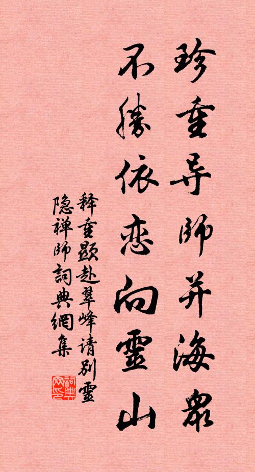 古詩文歷史字典書法欣賞書法字典國語詞典說文解字康熙字典古漢語字典珍重導師並海眾,不勝依戀向靈山釋重顯 《赴翠峰請別靈隱禪師》名句出處出自宋代釋重顯的《赴翠峰請別靈隱禪師》全文:臨行情緒懶開言,提唱宗乘亦是閒。珍重導師並海眾,不勝依戀向靈山。釋重顯詩詞大全名句書法欣賞珍重導師並海眾,不勝依戀向靈山書法作品釋重顯名句,赴翠峰請別靈隱禪師名句名句推薦手跡可傳心鮑照《代門有車馬客行》秋風洄溯險,落日波濤深釋泚《游元象泊》平日惟耽茗,墳前種幾株趙師秀《徐靈暉輓詞》單雄翩獨逝嵇康《五言贈秀才詩》至今是邦數廉吏,君與韋陸俱其名趙蕃《簡子崧時丞建德》不然五湖上,亦可乘扁舟李白《越中秋懷》坐斷意根,方能側耳釋心月《偈頌一百五十首》閒窗掩春寂施岳《蘭陵王》循省誠知懼,安排只自憪柳宗元《酬韶州裴曹長使君寄道州呂八大使因以見示二十韻一首》薦賢仍賭命,有道可辭貧陳師道《胡士彥輓詞二首》遠色曾何隔,微涼亦已同梅堯臣《依韻和原甫對月見邀不至》雨柳枝枝弱,風光片片斜元稹《景申秋八首》追懷昔游地,未語涕已傾陸游《寄十二侄》歲歲今朝陪燕集梅坡《千秋歲引(壽女人·八月初二)》湘中固多山,夾岸萬馬屯范成大《謁南嶽》詩詞推薦金剛隨機無盡頌無法可得分第二十二釋印肅〔宋代〕為無所得耶,窮理絕纖瑕。不可得中得,無礙亦無遮。華胥引(中秋紫霞席上)奚岊〔宋代〕澄空無際,一幅輕綃,素秋弄色。翦翦天風,飛飛萬里,吹淨遙碧。想玉杵芒寒,聽珮環無跡。圓缺何心,有心偏諸公見和次韻呈鄭舜舉國錄瑞伯仙尉陳棣〔宋代〕家聲赫奕繼更生,草聖縱橫亂伯英。鄴下文章惟七子,潁川人士有諸兄。新詩寫物無餘態,硬語盤空若混成。吏隱定林寺家之巽〔宋代〕六籍工夫四海名,太平底事竟沉沉。裕陵一去何年再,長使時賢淚滿襟。樞密東院秋日宋庠〔宋代〕試問山林客,胡然廊廟中。借籌終不效,數馬亦何功。窈窱荀池北,迴環漢壘東。繒雲高幕潤,瑤草半庭空。乍失挽葛夫人二首劉克莊〔宋代〕銀台曾奮塗歸筆,我亦留花批逆鱗。早共裂麻沮裴相,晚某負耒作滕民。兒斑衣從雙旌貴,母繡簾迎萬戶春。方擁寄黃州趙駕庚辰入蜀舟次黃岡適趙倅奇夫檄行崔與之〔宋代〕銅梁玉壘碧雲端,尺舸西風兩鬢殘。世道多岐今已慣,人生一見古來難。丈夫不作謀身外,巧匠那能袖手看。月白愛玉女洞中水既致兩瓶恐後復取而為使者見紿蘇軾〔宋代〕之調水符欺謾久成俗,關市有契繻。誰知南山下,取水亦置符。古人辨淄澠,皎若鶴與鳧。吾今既謝此,但視符有玩晚菊宋祁〔宋代〕佳節雖雲晚,繁英尚獨開。新醪相伴熟,寒蝶不空來。細折愁香破,長吟恐暝催。自嫌霜白鬢,將插重裴回。寄羅主管四首項安世〔宋代〕客有甄卿子,師行八面奇。談禪兼學道,愛酒更能詩。聞說今同事,長懷舊接辭。無人目娛戲,多病欠醫治。