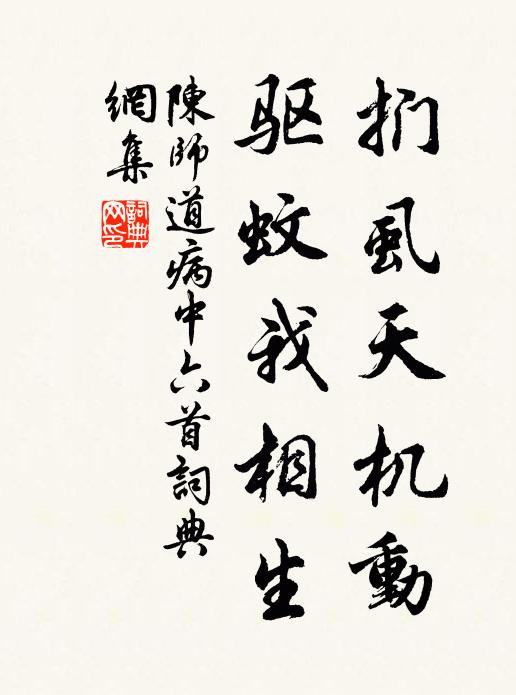 古詩文歷史字典書法欣賞書法字典國語詞典說文解字康熙字典古漢語字典捫虱天機動,驅蚊我相生陳師道 《病中六首》名句出處出自宋代陳師道的《病中六首》全文:嘆息憎晨凊,伸眉愜晚晴。隙虛浮日影,窗穴嘯風聲。捫虱天機動,驅蚊我相生。偶然成一笑,栩栩暫身腰。陳師道詩詞大全名句書法欣賞捫虱天機動,驅蚊我相生書法作品陳師道名句,病中六首名句名句推薦千載簡齊仙去後,何人更著好詩夸樓鑰《題趙睎遠二畫》更相借問詩中語,共說如今勝舊時張籍《喜王六同宿》問姮娥覓取,一枝仙桂佚名《月華清慢/月華清》濟楚風光,昇平時世曹組《脫銀袍》君王念疇昔,臨遣尤繾綣樓鑰《送楊廷秀秘監赴江東漕》蒔藥移花撰石名,稍加心匠可經營方回《春日小園即事十首》年來學力荒唐甚,羞向升雲頂上看項安世《題鹿門山絕頂升雲亭》在公不關白,故故出不測敖陶孫《秋日雜興》三年此月綺筵開,盛意勤拳不待催樓鑰《客目中次韻》只為蓴鱸動歸思,非關勇退早知幾蔡戡《思歸》居民爭出羅酒漿,花間笑語音琅琅許志仁《和寶月彈桃源春曉》勸人滿酌金鍾晏幾道《清平樂》眼前碌碌誰知此,漫走叢祠乞歲豐陸游《南池》素蛾城闕年年,新妝趁羅綺吳文英《祝英台近(上元)》酒醒山月欲侵樓,小摘園蔬雪滿溝方岳《夜渴挑菜》詩詞推薦酷暑葉茵〔宋代〕動息汗流珠,無風可滌除。炎威獄下吏,生意鼎中魚。席地捧冰水,扃門謝客車。因思遊宦者,曾未憶家居。楊柳謠佚名〔唐代〕楊柳楊柳漫頭駝。香閨十詠桃花扇張玉孃〔宋代〕濃花妝點一枝春,影拂瀟湘月半綸。歌和兒裳風力軟,釵橫發亂曉寒新。江居鄒登龍〔宋代〕獨和幽居計,江邊屋數間。水流天自在,心遠地寬閒。鉏月栽梅樹,移雲疊石山。白鷗盟欲結,倚杖看潺湲。早醉趙蕃〔宋代〕晨起倦烏巾,還傾老瓦盆。自知中了了,人謂日昏昏。迤邐谿山別,披紛雁鶩喧。春風得亡賴,幽趣與誰論。九鎖山十詠龍洞鄧牧〔宋代〕老龍山中居,出山作霖雨。風雲幾聚散,田野正辛苦。神仙地位高,使爾司下土。閒詠園中草木陸游〔宋代〕日高未辦續晨炊,一碗村醅且療飢。盤箸索然君勿笑,桑間紫椹正累累。簡單令胡寅〔宋代〕十月絺無斁,中冬木尚榮。原為寒玉佩,思灌閬風清。之子牛刀暇,尋余兔逕行。已攜從事至,旋覺大庖盈。荒郡題覺禪和杜荀鶴〔唐代〕少見修行得似師,茅堂佛像亦隨時。禪衣衲後雲藏線,夏臘高來雪印眉。耕地誡侵連冢土。伐薪教護帶巢枝。有時和水部張員外宣政衙賜百官櫻桃詩韓愈〔唐代〕漢家舊種明光殿,炎帝還書本草經。豈似滿朝承雨露,共看傳賜出青冥。香隨翠籠擎初到,色映銀盤寫未停。食罷