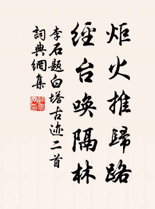 古詩文歷史字典書法欣賞書法字典國語詞典說文解字康熙字典古漢語字典炬火推歸路,經台喚隔林李石 《題白塔古蹟二首》名句出處出自宋代李石的《題白塔古蹟二首》全文:塔倒峰巒影,鍾埋澗谷音,二賢苔像古,四虎竹泉深。炬火推歸路,經台喚隔林。人頭連地脈,古蹟備幽尋。名句書法欣賞炬火推歸路,經台喚隔林書法作品李石名句,題白塔古蹟二首名句名句推薦急急行持,休生退怠譚處端《踏莎行》掃苔紅葉過,臨水白蘋移趙湘《寄霅川刁殿丞十二韻》靈根久向月中栽,不信天香墜下來方蒙仲《木犀》石閭環藻衛,金壇映黼帷李義府《在巂州遙敘封禪》亟歸慰慈抱,毋浪花邊吟杜范《送耕甫弟赴補》塵滿芰荷衣王結《木蘭花慢 送李公敏》欲取功名酬老大,豈將州縣嘆徒勞王之望《上曾二丈仲成》山色溪光還似舊,惜無詩思似當時李時可《題方漕水閣》都緣默禱胸中久,一瓣香焚喚得晴仲並《平江守禱晴即應時近元夕矣寄呈五絕句》手披不厭薰沉水,心悟何妨涉貝多洪咨夔《再用陀字韻》昨日西風動歸思,滿船涼葉在天涯章碣《寄友人》五原人走馬,昨夜到京師黃滔《河梁》春雨銘旌暗,東郊薤露悲張元乾《挽寺丞許子如》無限中塗未歸客,明明開眼墮深坑釋宗杲《頌古一百二十一首》衰柳啼鴉,驚風驅雁,動人一片秋聲周邦彥《慶宮春》詩詞推薦寄陝守祖擇之舍人邵雍〔宋代〕記得相逢否,當時在海東。別離千里外,倏忽十年中,跡異中尤異,心同齒更同。終期再清會,文酒樂無窮。中宗祀昊天樂章。豫和佚名〔唐代〕天之歷數歸睿唐,顧惟菲德欽昊蒼。撰吉日兮表殷薦,冀神鑒兮降闓陽。游雲門山讀亭中詩板擬丐使者以石易之項安世〔宋代〕唐人詩板四十五,麗句亭中歲月深。煩公丐我一碑石,與張萬壑松風音。宿昭應張喬〔唐代〕夜憶開元寺,淒涼里巷間。薄煙通魏闕,明月照驪山。半壁空宮閉,連天白道閒。清晨更回首,獨向灞陵還。種柳戲題柳宗元〔唐代〕柳州柳刺史,種柳柳江邊。談笑為故事,推移成昔年。垂陰當覆地,聳乾會參天。好作思人樹,慚無惠化傳。三川觀水漲二十韻杜甫〔唐代〕我經華原來,不復見平陸。北上唯土山,連山走窮谷。火雲無時出,飛電常在目。自多窮岫雨,行潦相豗蹙。蓊匌臨濟贊釋道璨〔宋代〕開眼受睦州廝瞞,甘心吃黃櫱痛棒,握定拳以當平勢生,除一喝伎倆。何曾夢見無位真人,剛要滅卻 * 眼藏。見漢宮春趙汝茪〔宋代〕著破荷衣,笑西風吹我,又落西湖。湖間舊時飲者,今與誰俱。山山映帶,似攜來、畫卷重舒。三十里、芙蓉步障蘇仁仲計議挽章二首呂祖謙〔宋代〕登門疇昔奉從容,婺越之間一水通。今日江東無賀老,去年床下拜龐公。舊來論議多遺落,新出傳聞或異同。已矣乳燕飛/賀新郎劉辰翁〔宋代〕赤壁之遊樂。但古今、風清月白,更無坡作。矯首中洲公何許,共我橫江孤鶴。把手笑、孫劉寂寞。頗有使君如今