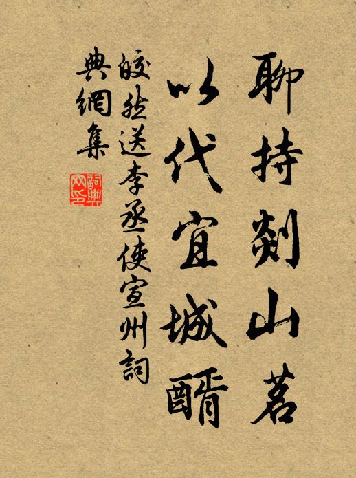 古詩文歷史字典書法欣賞書法字典國語詞典說文解字康熙字典古漢語字典聊持剡山茗,以代宜城醑皎然 《送李丞使宣州》名句出處出自唐代皎然的《送李丞使宣州》全文:結駟何翩翩,落葉暗寒渚。夢裡春谷泉,愁中洞庭雨。聊持剡山茗,以代宜城醑。名句書法欣賞聊持剡山茗,以代宜城醑書法作品皎然名句,送李丞使宣州名句名句推薦憶昔初辭鵷鷺行,慨然誓墓老耕桑陸游《歲暮書懷》塗歌邑誦揚徽懿,鼎命協惟新佚名《導引》貧家無節物,何況此荒城方回《癸未至節以病晚起走筆戲書紀事排悶十首》轅門立奇士,淮水秋風生柳宗元《韋道安(道安嘗佐張建封於徐州,及軍亂而道安)》天地不仁,人心招感釋紹曇《偈頌一百一十七首》念將小駐蹇莫留,冰霜豈不思推輈,山川回首空相繆趙蕃《次韻徐運使送行》承家知有子,翮就看摩雲李處權《挽許主簿》焚香燒燭恣狂吟,管甚冬冬催五鼓胡仲弓《抱拙以三通鼓為韻見寄次韻》露葉翻風驚鵲墜。暗落青林紅子。陳師道《清平樂·秋光燭地》一春長雨霧,明日歸樊籠陳傅良《游鼓山》井裡滿前靈宇壯,長江千古帶高情曹既明《胥山廟》羽飛朝暮驛,鱗疊往來舟司馬光《送丁秘丞知雍丘》頌美觀名士,傳家付令兒王洋《挽焦適道寺丞》自爾音塵隔,思公歲月除周必大《凌閣學輓詩二首》結綬當年仕兩京,自憐年少體猶輕歐陽修《縣舍不種花惟栽楠木冬青茶竹之類因戲書七言》詩詞推薦書事三絕范成大〔宋代〕簡子約同湖棹,周郎許過田廬。碧雲日暮空合,多病故人遂疏。登揚州棲靈寺塔劉長卿〔唐代〕北塔凌空虛,雄觀壓川澤。亭亭楚雲外,千里看不隔。遙對黃金台,浮輝亂相射。盤梯接元氣,半壁棲夜魄。稍登萱李嶠〔唐代〕屣步尋芳草,忘憂自結叢。黃英開養性,綠葉正依籠。色湛仙人露,香傳少女風。還依北堂下,曹植動文雄。四月二十日被以郡事入奏之命再賦二首岳珂〔宋代〕去年冬暮拜弓招,槐夏重承接畫朝。錫馬敢期先雨露,冥鴻自愧點菸霄。沙墀有路瞻唐表,瓦缶何堪溷舜韶。歸郡徂歲釋善珍〔宋代〕徂歲忙如電後雷,新年又下急符摧。雪將解舞絮夸柳,春遣先鋒花付梅。窗白看書俄晻靄,爐紅炙手倏寒灰。憑欄倚樓陳郁〔宋代〕一聲新雁一聲秋,獨向江樓倚莫愁。江上片雲將雨去,卻留殘照管汀洲。藤花董嗣杲〔宋代〕蒙葺紫結秀蕤明,遠訝霞鋪彩鳳輕。碎影照溪羞晚悴,爛香蔓壑藉春榮。蔓如諛佞依權勢,色比空華易死生。花落弋陽道中吳儆〔宋代〕積雨今朝霽,東皋晚日紅。人家深蔽樹,野水闊浮空。久客仍行役,青春已過中。嶺頭凝望處,腸斷白雲東。病中獨坐毛滂〔宋代〕千秋橋畔桑麻村,槐陰覆砌綠映門。關門誰覓病居士,掩書不讀愔不言。明窗養石作幽伴,蒼骨孤瘦棲秋痕。瀟湘翻經台強至〔宋代〕失道從僧指,窮高聽鳥呼。千山四回抱,一徑百盤紆。人事空今昔,台基儻有無。吟邊嵐氣夕,落日伴猿狐。