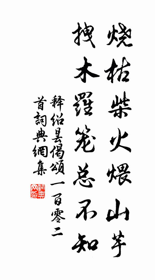 古詩文歷史字典書法欣賞書法字典國語詞典說文解字康熙字典古漢語字典燒枯柴火煨山芋,拽木羅籠總不知釋紹曇 《偈頌一百零二首》名句出處出自宋代釋紹曇的《偈頌一百零二首》全文:三十餘僧眼似眉,白雲深處聚頭嬉。燒枯柴火煨山芋,拽木羅籠總不知。名句書法欣賞燒枯柴火煨山芋,拽木羅籠總不知書法作品釋紹曇名句,偈頌一百零二首名句名句推薦風波自此去,桂水空離憂劉長卿《上湖田館南樓憶朱宴》奉報富春姑馬鈺《煉丹砂 贈清靜散人孫不二 金蓮正宗記卷五》年少春心花里轉張綱《惜分飛(次韻丁希閔)》龍來求珠珠不與,吐下腥涎滿庭宇錢聞詩《龍穴》想見魚秧泛,沙汀白鳥雙吳潛《苦雨吟十首呈同官諸丈》冰輪駕,天緯逼張矩《應天長(平湖秋月)》舜華徂北渚,宸思結南陽吳兢《永泰公主輓歌二首》白紙憑誰寄,青燈此夜分釋寶曇《送友人》天闊冰壺淨,溪平玉鑒寒張堯同《嘉禾百詠月波樓》野步晚悠悠,山光澹早秋劉得仁《晚步》一年勾漏守,尋盡洞中天陶弼《容管》於心儻無愧,此首何妨挽虞儔《和張文潛有所嘆韻》魚龍川北盤谿雨,鳥鼠山西洮水雲岑參《與獨孤漸道別長句,兼呈嚴八侍御》榴花最恨來時晚,惆悵春期獨後期歐陽修《榴花》山腰綠映女郎祠,祠下泉通竹下池李復《隴州神泉鋪後池》詩詞推薦寄王秋泉王冕〔元代〕尺書不寄海天遙,兩見春風換柳條。台閣競瞻官濟濟,山林誰問□蕭蕭?月明故國人情別,花落江城客思饒。記得阮郎歸 題秋山草堂圖 古山樂府卷下 以上強張野〔元代〕青山重疊水縈紆。扁舟隔岸呼。依稀綠野輞川圖。又疑陶令居。紅樹晚,白雲孤。乾坤別一壺。草堂瀟灑竹窗虛。天奪劉克莊〔宋代〕曩造河沙業,今災夢幻身。不知岩下電,天奪與何人。句仇遠〔宋代〕高荷不受雨,傾瀉與低荷。低荷強自持,聚雨傾入波。朝雨尚滴瀝,晚雨忽滂沱。臨池臥以聽,雨聲靜中多。兩耳憶母二首釋雲岫〔宋代〕天不高兮海不深,白雲飛處定關心。蒲鞋能上時人眼,那更西風葉落金。偈頌一百零四首釋紹曇〔宋代〕百二十日夏,今朝始發頭。飯抄雲子白,羹煮菜香浮。未問寒山子,先看水牯牛。山前千頃地,信腳踏翻休。試院書懷陳與義〔宋代〕細讀平安字,愁邊失歲華。疏疏一簾雨,淡淡滿枝花。投老詩成癖,經春夢到家。茫然十年事,倚杖數棲鴉。題陰山七騎圖李石〔宋代〕回岩客子賣墨人,諸孫賣筆筆有神。墨翁已入蓬萊殿,筆孫有愧中書君。邇來小孫兼好畫,兩幅溪藤七匹馬。虎狼自嘲陸游〔宋代〕歲月惟遷萬事非,放翁可笑白頭痴。此生竟出古人下,有志尚如年少時。僻學固應知者少,長歌莫問和予誰。自嘲宣城道中華岳〔宋代〕躍馬上宣城,千山翠欲顰。蕙風輕捲舌,櫻雨細沾唇。柳絮難驅臘,榆錢不 * 。何如澆一斗,爛醉石湖濱。