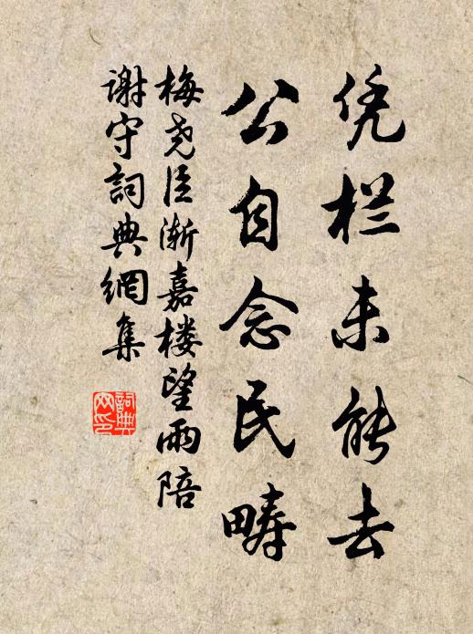 古詩文歷史字典書法欣賞書法字典國語詞典說文解字康熙字典古漢語字典憑欄未能去,公自念民疇梅堯臣 《漸嘉樓望雨陪謝守》名句出處出自宋代梅堯臣的《漸嘉樓望雨陪謝守》全文:冒雨上城頭,淒淒欲報秋。雲低密藏樹,風急暗侵樓。漸積荷珠重,新添沼監幽。憑欄未能去,公自念民疇。名句書法欣賞憑欄未能去,公自念民疇書法作品梅堯臣名句,漸嘉樓望雨陪謝守名句名句推薦詩魂飛繞翠屏中,冷雨疎風時入夢王柏《赤松夜宿》以茲寓繩準,棄髓索皮毛戴表元《陳晦父赴十三韻》金刀雖雲利,未聞能斫風蘇轍《次韻子瞻和淵明擬古九首》我生亦已晚,百拙勞化工王柏《和寬居見懷韻》異哉賓主兩無語,客起疾如走避燃林之奇《謁客》上馬即塵事,欲歸欣少留強至《齋宮獨酌待曉入城》狂風猛雨日將暮,舞榭歌台人乍稀邵雍《落花吟》嗚呼山中猛虎今已無,人間苛虎誰驅除艾性夫《射虎行贈張生》當時大耳兒,甚似隆準公晁公溯《題先生廟》晚來堪畫,小橋風雪梅花張可久《【越調】天淨沙_孤山雪夜淡》百花雖好,問還有恁標格袁去華《念奴嬌(和人韻)》赤坂途三折沈約《白馬篇》簾外翠陰如幄盧祖皋《謁金門》閉戶安禪主,衝風逆水船陳師道《別觀音山主》馮夷蹁躚舞淥波,鮫人出聽停綃梭劉禹錫《傷秦姝行》詩詞推薦送王亢宗赴建德尉趙蕃〔宋代〕雁斷行連雨,梧乾葉隕風。悲涼今日別,邂逅幾時同。末路多浮梗,吾生甚轉蓬。青衫溧陽尉,不嘆孟郊窮。縣齋秋懷程公許〔宋代〕古人日以遠,古心誰與共。陳編如有覿,整袂神自竦。書短疲眾喧,夜永息群動。賴此一炷膏,假我數行誦。古今水夫謠王建〔唐代〕苦哉生長當驛邊,官家使我牽驛船。辛苦日多樂日少,水宿沙行如海鳥。逆風上水萬斛重,前驛迢迢後淼淼。半夜過詩人李長源故居元好問〔金代〕楚些招魂自往年,明珠真見抵深淵。巨鰲有鉺雖堪釣,怒虎無情可重編。千丈豪氣天也妒,七言詩好世空傳。傷心糖多令侯善淵〔元代〕休恁苦爭儸。人生得幾何。奈百年、有似南柯。富貴功名俱遂意,難免死生磨。也*。隨分養天和。陽生滿鼎多。樂漁吟金朋說〔宋代〕桃花澗底頻垂釣,蓼子灘頭穩擊舟。取得魚來換美酒,清風明月興悠悠。吳太博遺柑子梅堯臣〔宋代〕太學先生欺綠橘,吳興才士與黃柑。黃柑似日勝崖蜜,帶葉初擎翠竹籃。還料楚王曾未識,徒將萍實托江南。晚次東亭獻鄭州宋使君文儲光羲〔唐代〕自初賓上國,乃到鄒人鄉。曾點與曾子,俱升闕里堂。武皇恢大略,逸翮思寥廓。三居清憲台,兩拜文昌閣。為道碑匠釋普度〔宋代〕點劃縱橫一脫新,之乎者也轉精神。只於黑白分明處,驗尺尋行數墨人。戲贈潘供奉黃庭堅〔宋代〕潘郎小時如白玉,上學覓歸如杜鵑。當年屢過乃翁家,沽酒煮蟹不論錢。大梁相逢初不識,黃塵漬面催挽船。不如