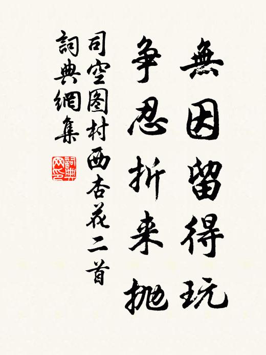 古詩文歷史字典書法欣賞書法字典國語詞典說文解字康熙字典古漢語字典無因留得玩,爭忍折來拋司空圖 《村西杏花二首》名句出處出自唐代司空圖的《村西杏花二首》全文:薄膩力偏羸,看看愴別時。東風狂不惜,西子病難醫。肌細分紅脈,香濃破紫苞。無因留得玩,爭忍折來拋。司空圖詩詞大全名句書法欣賞無因留得玩,爭忍折來拋書法作品司空圖名句,村西杏花二首名句名句推薦是非既循環,興亡亦繼軌范仲淹《上漢謠》南服有橘隱,春風罔知聞王柏《和立齋橘花韻》不堪蠟炬燒殘淚,雨打船窗半夜天王周《泊巴東》膺期千歲色,垂世九疇文丁謂《龜》濕薪如桂米如珠,有突不黔旦逾望朱翌《大雪》邪求無實事,如影定相隨宋太宗《緣識》猗歟崇基,右平左誠佚名《夕月十首》棗種兮南舍,風來兮東廂曾豐《祀蠶先》惟恨餘杭門外柳,長年不了送征鞍仇遠《鳳凰山故宮》斷岸通別浦,孤舟入春煙陸游《開歲半月湖村梅開無餘偶得五詩以煙濕落梅村》紫翅青金翅,木翅與油單賈似道《論翅》卸鞍良久茅檐下,待得巴人樵採歸戎昱《過商山》自憐江海跡,能到友生家陳著《至直學士院樊伯撝家》池邊廢沼邀閒立,乍合冰澌怯杖敲張鎡《雪》且當置是事,勿使冰作炭黃庭堅《見子瞻粲字韻詩和答三人四返不困而愈崛奇輒》詩詞推薦宿石窟寺喻鳧〔唐代〕一剎古岡南,孤鍾撼夕嵐。客閒明月閣,僧閉白雲庵。野鶴立枯枿,天龍吟淨潭。因知不生理,合自此中探。禁中春松常沂〔唐代〕映殿松偏好,森森列禁中。攢柯沾聖澤,疏蓋引皇風。晚色連秦苑,春香滿漢宮。操將金石固,材與直臣同。翠影生查子朱淑真〔宋代〕寒食不多時,幾日東風惡。無緒倦尋芳,閒卻鞦韆索。玉減翠裙交,病怯羅衣保不忍捲簾看,寂寞梨花落。游安樂山魯某〔宋代〕苔徑傍岩斜,林間是道家。夜潭魚戲月,春地鹿眠花。柳梢青韓淲〔宋代〕雲淡秋空。一江流水,煙雨濛濛。岸轉溪回,野平山遠,幾點征鴻。行人獨倚孤篷。算此景、如圖畫中。莫問功名即事十絕劉克莊〔宋代〕飲血吞奴羯,盛溲餉佛貍。勿論城大小,但問守城誰。九誦周公鮮于侁〔宋代〕噫嗟兮文公,巋然兮秘宇。悵王室兮多難,獨勤勞兮左右。四國流言兮沖人不知,東片問罪兮慆慆不歸。大電以風燕居十六首彭龜年〔宋代〕為利較錙銖,真成小丈夫。脂肥不滿腹,罪已塞堪輿。感遇之廿七陳子昂〔唐代〕朝發宜都渚。浩然思故鄉。故鄉不可見。路隔巫山陽。巫山彩雲沒。高丘正微茫。佇立望已久。涕落沾衣裳。豈茲明月許月卿〔宋代〕明月天雙鑒,清湖地萬弓。人行楊柳外,身在畫圖中。天闊雙眸快,樓高萬象融。故山應更好,楊柳映芙蓉。