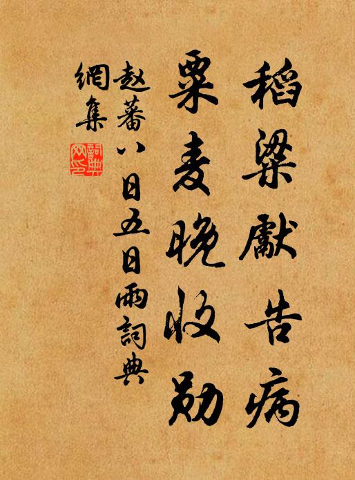 古詩文歷史字典書法欣賞書法字典國語詞典說文解字康熙字典古漢語字典稻粱先告病,粟麥晚收勛趙蕃 《八日五日雨》名句出處出自宋代趙蕃的《八日五日雨》全文:小雨新涼進,遙山翠靄分。稻粱先告病,粟麥晚收勛。助爾農人喜,嗟余課子勤。跨驢窮有相,琢句老無聞。趙蕃詩詞大全名句書法欣賞稻粱先告病,粟麥晚收勛書法作品趙蕃名句,八日五日雨名句名句推薦君家酥酪弟兄賢,督府從軍滯幕蓮宋庠《寄武昌胡從事》繡被薰香,蓬窗聽雨,還解知人否楊無咎《永遇樂》房房皆疊石,風掃永無塵許棠《題金山寺》就使新春年運吉,鈍庚難撥馬頭開吳泳《病中有懷》繞闌乾、追憶沈吟,欲言難賦王奕《賀新郎(題揚州瓊花觀)》嬌婭奼,語惺松盧炳《鷓鴣天(席上戲作)》偶經名藍亦終日,喜有勝士同茲游劉子翬《同原仲成元致和入開善》杜門忍飢吾與汝,文字穮蔉祈年豐李石《舟中示開並寄圓》山神川後領要束,遁走虎豹藏蛟鯨劉過《嘉泰開樂日殿岩涇原郭季端邀游鳳山自來美堂》欲覺聞晨鐘,令人發深省杜甫《游龍門奉先寺》病後能吟否,春來曾醉無白居易《夢劉二十八,因詩問之》近古意全朴,當風勢亦危薛嵎《茅屋》小小葫蘆,生來不大身材矮張繼先《點絳唇(祐陵問:所帶葫蘆如何不開口,對御作)》好待春風暖,相隨還北鄉賀鑄《登烏江泊子岡懷潘景仁》一從慕膻腥,中棄如敝屣蘇轍《和王適寒夜讀書》詩詞推薦緣識宋太宗〔宋代〕手談勝負觀其智,斂跡藏鋒不自製。傲慢因從貪上虧,侵他理路無深計。何齷齪,何凝滯,率爾圖謀太容易。恃嶮泊上虞驛來日行四首陳造〔宋代〕溪山可圖畫,風物憶吾鄉。漁艇鷗鶩亂,茅茨菱芡香。訪姚輔周郎中月陂西園邵雍〔宋代〕相憶不可遏,西街來訪時。交橫過溝水,隙曲繞蔬畦。樹偃低頭避,筇高換手持。朋游相得甚,何樂更如之。送梅子明還吳孔武仲〔宋代〕姑蘇限雲水,官舍隱蓬萊。出汴青山涌,橫江畫舸開。家園雖渴別,書社早歸來。新命鄉人喜,神仙舊姓梅。秋霜閣陳天麟〔宋代〕登台坐想遺民釣,入寺行歌李白詩。竹榻 * 僧定早,清鞋布襪我歸遲。雲邊掃石留題處,月下憑欄把酒時。百尺秋風陸游〔宋代〕秋風吹客檣,節物嘆遐方。歲事忽雲暮,吾行殊未央。霜清漢水綠,日落楚山蒼。此去三巴路,無猿亦斷腸。病中修實錄馬廷鸞〔宋代〕明聖當陽四十春,十年供奉感孤臣。雲龍幄幕天容邇,河漢篇章帝墨新。正始遺音危絕縷,貞元舊曲慟沾巾。焚膏送僧歸天寧萬年禪院李宗諤〔宋代〕師住天台寺,天台水石幽。眼前皆勝境,門下盡名流。法號君恩賜,精藍國力修。渡杯來鳳闕,振錫謁珠旒。內殿酹江月侯善淵〔元代〕玄元至道,大無隅、寂寂寥寥獨立。遍應諸方通上下,極目天光微密。隱顯存亡,穿無貫有,善用無轍跡。琅然泄頌十玄談回機釋印肅〔宋代〕再三撈摝始方知,捉影逃形也太痴。行眼大悲分得半,維摩老漢始全提。