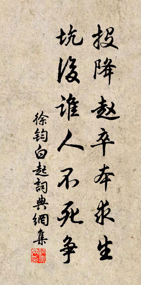 古詩文歷史字典書法欣賞書法字典國語詞典說文解字康熙字典古漢語字典投降趙卒本求生,坑後誰人不死爭徐鈞 《白起》名句出處出自宋代徐鈞的《白起》全文:投降趙卒本求生,坑後誰人不死爭。三召三辭寧自刎,邯鄲料不再長平。徐鈞詩詞大全名句書法欣賞投降趙卒本求生,坑後誰人不死爭書法作品徐鈞名句,白起名句名句推薦揚鑣驚主辱,拔劍撥年衰杜甫《夔府書懷四十韻》昔時高士宅,今日梵王居宋輝《次唐彥猷顧亭林韻》小闌花盡蝶,靜院醉醒蛩李商隱《垂柳》藜杖初防老,桃符又換新王灼《次韻李士舉丈除夕》君不見,朅來歐北天驕驟進化,寧容久扃吾文明梁啓超《愛國歌四章》平野春來堪細履,何時與子杖藜行張嵲《新春偶書寄致宏》無人當便闕,應罷太師官王維《故太子太師徐公輓歌四首》帳殿倚雲開佚名《導引》簾外一眉新月、浸梨花謝逸《南歌子》我為靈芝仙草,不為朱唇丹臉,長嘯亦何為黃庭堅《水調歌頭·遊覽》細思不獨人間少,月里何曾有兩株陸游《楚辭所謂桂數見於唐人詩句及圖畫間今不復見》寒蟬初停號,客燕催將歸楊冠卿《秋懷十首微雲淡河漢疏雨滴梧桐為韻》春風引車馬,隱隱何闐闐黃庭堅《次韻感春五首》因為鸞章吟,忽憶鶴骨客陸龜蒙《夏日閒居作四聲詩寄襲美平入聲》風緊雲輕已變秋蔡伸《南鄉子》詩詞推薦赴馮翊作儲光羲〔唐代〕本自江海人,且無寥廓志。大明耀天宇,靄靄風雨被。迢遞別荊吳,飄颻涉沂泗。廣川俟舟楫,峻坂傷騏驥。蹭蹬好事近張炎〔宋代〕蔥倩滿身雲,酒暈淺融香頰。水調數聲嫻雅,把芳心偷說。風吹裙帶下階遲,驚散雙蝴蝶。佯拈花枝微笑,溜晴波速陳李二居士還茅山劉宰〔宋代〕髯李魁然玉抱璞,淡陳蕭散出林鶴。華陽洞口笑相逢,三風自奏鈞天樂。飛雲出岫本無心,大隱不必皆山林。朱弦南歌子 原作十愛詞,無調名,茲據詞律補 齊鄭子聃〔元代〕我愛沂陽好,民淳訟自稀。誰言珥筆混萊夷。行見離離秋草,鞠園扉髮長安堰葉紹翁〔宋代〕夏老蟲聲切,晨興草氣香。買瓜依綠樹,出水{左氵右旱}青身。船聚知村近,牛閒覺晝長,雙鳧蓮葉盪,無雨故酬翁常之徐照〔宋代〕半掩柴門一徑深,山中免見俗塵侵。愁因有酒春生面,老不饒貧雪滿簪。舊井遠通幽谷水,翠藤新長小窗陰。扁舟黃牛峽廟陸游〔宋代〕三峽束江流,崖谷互吐納。黃牛不負重,雲表恣蹴蹋。吳船與蜀舸,有請神必答。誰憐馬遭刵,百歲創未合。柂師查元信餉日鑄茶因用其韻感嘆舊遊項安世〔宋代〕芒鞋沖雨上茶園,綠髮晞風正少年。重見靈光元好在,卻循雙鬢已蒼然。芽生日鑄無多樹,瓶采千山自昔年。小碾觀上朝宋祁〔宋代〕郁蔥佳氣護天台,銜尾茸題隘路槐。金箭忽鳴衡漏盡,火城爭撲相車來。黃人日映仙盤上,閶闔天隨禁鑰開。規地次韻戴帥初見寄二首陳著〔宋代〕胸次玲瓏達事端,入山買屋貯清寒。奉親最樂危時見,與俗相忘實處看。閒輟琴書翻兔冊,旋添竹樹隔牛闌。疏衣