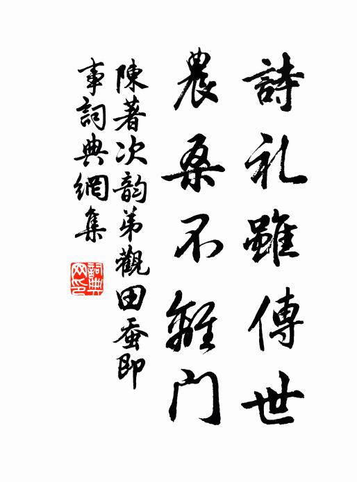 古詩文歷史字典書法欣賞書法字典國語詞典說文解字康熙字典古漢語字典詩禮雖傳世,農桑不離門陳著 《次韻弟觀田蠶即事》名句出處出自宋代陳著的《次韻弟觀田蠶即事》全文:詩禮雖傳世,農桑不離門。梅天繅雪屋,秧雨種雲村。衣帛知先老,含飴擬弄孫。願言同井樂,無怨亦無恩。陳著詩詞大全名句書法欣賞詩禮雖傳世,農桑不離門書法作品陳著名句,次韻弟觀田蠶即事名句名句推薦嬰病曾無苦,期頤未滿年宋祁《挽張元常葬母夫人二首》我家大江左,江水日夜江洪邁《酬馬退翁見示之什》南陌上、玉佩鈿車,悵紫陌、青門日暮康與之《杏花天》眼界無多地,縱橫亘十方郭印《眾香橋》別來才一書,無使無由頻趙蕃《寄范建康》潮落家遙見,梅香檝暫停釋行肇《送簡師南遊》建俗輕生自古然,況逢軍旅更飢年王邁《賊平賀本路史禽良叔彌忠四首》眼裡鉛華今日見,胸中冰炭幾時除賀鑄《丹陽客舍示曾紆公袞》走敵存亡義有餘,全由雄勇與英謨周曇《春秋戰國門再吟》高僧本姓竺,開士舊名林劉長卿《寄靈一上人(一作皇甫冉詩,一作郎士元詩)》風惡為台避,晴烘著幙遮劉克莊《竹溪直院盛稱起予草堂詩之善暇日覽之多有可》夢到揚州,依然南浦夏完淳《兩同心 有夢》不惟氣浩然,亦是敦薄俗於石《次韻劉和德賦淵明》班行便覺九天近,登覽何辭一日留曾協《和史志道侍郎游朝陽岩》寄取相思,一枝和夜雪王沂孫《齊天樂(贈秋崖道人西歸)》詩詞推薦病起三首楊公遠〔宋代〕一病已兼旬,朝來試整襟。眼前驚霧散,耳底怪蟬吟。檢點塵侵硯,爬搔雪滿簪。春歸渾未省,綠樹又成陰。登城釋紹嵩〔宋代〕奔走倦塵埃,登臨亦快哉。江城含變態,蹤跡共徘徊。古殿桐陰合,秋山晚翠開。相逢吟未足,更擬上高台。擬行路難鮑照〔南北朝〕奉君琴金卮之美琴,玳瑁玉匣之雕琴。七彩芙蓉之羽帳,九華琴之錦衾。紅顏零落歲將暮,寒光宛轉時欲沉。願君初入巫峽范成大〔宋代〕鑽火巴東岸,摐金峽口船。束江崖欲合,漱石水多漩。卓午三竿日,中間一罅天。偉哉神禹跡,疏鑿此山川。和程公辟游宿猿洞二首陳襄〔宋代〕老來歸鞅海邊村,猶喜諸親聚里門。漢宗朱轓臨祖賬,韓侯清酒滿離樽。猿驚出洞時三哭,梅送行人早一番。此去游青城山楊可弼〔宋代〕我笑羊叔子,峴首矜一生。又怪謝阿客,伐山覓崢嶸。豈如銅梁守,出門便赤城。絕句歐陽修〔宋代〕冷雨漲焦陂,人去陂寂寞。惟有霜前花,鮮鮮對高閣。觀蓮強至〔宋代〕水仙也曝晚霞衣,萬片鮮紅照綠池,花近酒杯逾酷烈,蓋隨舞袖忽欹垂。且延勝賞觀靈匹,好折清香贈侍姬。苦被贈張君馬廷鸞〔宋代〕人生識字憂患始,底用區區更出奇。我欲掃空閒筆墨,只憑老腕把鋤犁。寓興歐陽詹〔唐代〕桃李有奇質,樗櫟無妙姿。皆承慶雲沃,一種春風吹。美惡苟同歸,喧囂徒爾為。相將任玄造,聊醉手中卮。