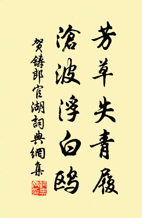 古詩文歷史字典書法欣賞書法字典國語詞典說文解字康熙字典古漢語字典芳草失青履,滄波浮白鷗賀鑄 《郎官湖》名句出處出自宋代賀鑄的《郎官湖》全文:當年賢守令,載酒沔南遊。涼月呈新霽,明湖涵素秋。郎官夏口使,仙客夜郎囚。促膝青螭舫,連觴紫綺裘。高驩隨雨散,余躅想風流。芳草失青履,滄波浮白鷗。江吞百頃盡,石刻一篇留。宜有沈碑者,前懷陵谷憂。名句書法欣賞芳草失青履,滄波浮白鷗書法作品賀鑄名句,郎官湖名句名句推薦用才殊未盡,無地可招魂樓鑰《余給事輓詞》吾儕烹茶有滋味,華池神水先調試白玉蟾《茶歌》間歲從使檄,親賓苦川馳權德輿《丙寅歲苦貧戲題》萬言倚馬不作難,坐令神鬼皆驚嚇羅與之《題採石李太白祠》每為飢所驅,奔走不可奈趙善括《和羅倅竹園唱和之什》一壺天上有名物,兩個世間無事人鄭遨《與羅隱之聯句》江闊亂分漁火細,灘空長漱岸沙圓艾性夫《餘干問舟》梅笑故知情熟客,犬鋟不是眼生人舒岳祥《正仲次帥初前韻見示數日相訪再次韻酬之》長安南下幾程途,得到邗溝吊綠蕪崔顥《維揚送友還蘇州》諸侯取為官,佐幕大名府王禹偁《五哀詩故尚書兵部侍郎琅琊王公》彈為古曲聲,如與古人言歐陽修《彈琴效賈島體》周遭暗室工訶夜,偃息朝檐喜曝晴劉克莊《失貓一首》任玉山摧倒王觀《紅芍藥》文場供秀句,樂府待新詞白居易《讀李杜詩集因題卷後》是也是不著,非也非不及,此時佛祖從何立釋覺《偈二首》詩詞推薦木蘭花慢(三潭印月)周密〔宋代〕遊船人散後,正蟾影、印寒湫。看冷沁鮫眠,清宜兔浴,皓彩輕浮。扁舟。泛天鏡里,溯流光、澄碧浸明眸。棲鷺洞房怨陸龜蒙〔唐代〕玉鍤朝扶鬢,金梯晚下台。春衫將別淚,一夜兩難裁。登白馬山護明寺孔德紹〔唐代〕名岳標形勝,危峰遠鬱紆。成象建環極,大壯闡規模。層台聳靈鷲,高殿邇陽烏。暫同游閬苑,還類入仙都。三休泊貴池驛董嗣杲〔宋代〕琴書湓浦擔,風雪貴池船。問酒臨津醉,添衣入驛眠。漁翁寒補網,鄰女夜調弦。何日齊山去,尋僧學說禪。江南好/憶江南趙師俠〔宋代〕天共水,水遠與天連。天淨水平寒月漾,水光月色兩相兼。月映水中天。人與景,人景古難全。景若佳時心自快,黃花朱淑真〔宋代〕土花能白又能紅,晚節猶能愛此工。寧可抱香枝上老,不隨黃葉舞秋風。少年游方千里〔宋代〕人如穠李,香濛翠縷,芳酒嫩於橙。寶燭烘香,珠簾閒夜,銀字理鸞笙。歸時醉面春風醒,花霧隔疏更。低輾雕輪城南五題其一郊步穆修〔宋代〕野水岸邊逢草歇,平林煙畔逐花行。雨晴南陌塵埃洗,倍覺風光奪眼明。辰州陶弼〔宋代〕東海舊聲屋,南江新塞垣。璽書行絕域,銅柱入中原。草暖聞鳴鹿,江清對飲猿。何時一樽酒,重上謝公軒。題宗上人舊院杜荀鶴〔唐代〕此院重來事事乖,半欹茅屋草侵階。啄生鴉憶啼松枿。接果猿思嘯石崖。壁上塵粘蒲葉扇,床前苔爛筍皮鞋。分明