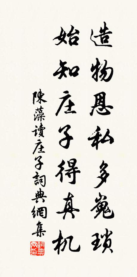 古詩文歷史字典書法欣賞書法字典國語詞典說文解字康熙字典古漢語字典造物恩私多嵬瑣,始知莊子得真機陳藻 《讀莊子》名句出處出自宋代陳藻的《讀莊子》全文:堯無是處桀無非,此語堪驚與道違。造物恩私多嵬瑣,始知莊子得真機。陳藻詩詞大全名句書法欣賞造物恩私多嵬瑣,始知莊子得真機書法作品陳藻名句,讀莊子名句名句推薦手持高斗柄,觜瀉三犁壠梅堯臣《和孫端叟寺丞農具十五首其三摟種》窮賤餐茹薄,興與養性宜姚合《街西居三首》臨卭惜第如庾信《奉和永豐殿下言志詩 二》中秋八月朔,人在竹之西丘葵《壽竹西》禪子初心易淒斷,秋風莫上少陵原皎然《送僧之京師》何當請長纓,一戰河湟復蘇軾《和王晉卿》楚屈入水死,詩孟踏雪僵孟郊《答盧仝》春滿洲鸚樓鶴,天付簪山帶水,駟馬駕輕車李曾伯《水調歌頭(送印德遠經略入廣)》覆雨翻雲市道交,公持正論息群嘲王邁《再和王君何定通判韻》芳年不共游謝朓《往敬亭路中》女當力蠶桑,男當力耘耔趙孟頫《題耕織圖二十四首奉懿旨撰》青雲去地遠,白日終天速白居易《相和歌辭。短歌行二首》聖蹤猶可想,衷曲向誰論,倍切乾乾志,虞孤覆載恩乾隆《避暑山莊》打動東海魚,失卻南山虎釋洵《偈二十二首》何事新春勝舊春,陰陽順序國安榮周必大《立春帖子皇后閣》詩詞推薦阮郎歸宋德廣〔宋代〕好風吹月過樓西。樓前人影稀。杜鵑啼斷綠楊枝。行人知不知。紅葉字,斷腸詩。從今懶再題。後園零落淡胭脂。奉和襲美太湖詩二十首明月灣陸龜蒙〔唐代〕昔聞明月觀,只傷荒野基。今逢明月灣,不值三五時。擇此二明月,洞庭看最奇。連山忽中斷,遠樹分毫釐。周回雨中作陸游〔宋代〕空濛初喜灑檐楹,忽聽空階點滴聲。高枕便知宜夕睡,豐年不嘆負春耕。多情幽草沿牆綠,無賴群蛙繞舍鳴。屈指寄劉八山中皇甫冉〔唐代〕東皋若近遠,苦雨隔還期。閏歲風霜晚,山田收穫遲。茅檐燕去後,樵路菊黃時。平子游都久,知君坐見嗤。竹素山房小飲南徐唐正方善歌吳伶以長簫和之仇遠〔宋代〕少時聞簫白玉台,一曲未終丹鳳來。金瀨空明秋水淺,妙音久不聞蓬萊。吳下老伶燕中回,能以北腔歌落梅。紅塵西夏寒食遣興朱孟德〔明代〕春空雲淡禁菸中,冷落那堪客里逢。飯煮青精顏固好,杯傳藍尾習能同。錦銷文杏枝頭雨,雪卷棠梨樹底風。往事霽後宋庠〔宋代〕小雨春膏潤,微波晚照空。壺光遙送電,梁影半傾虹。珍樹疏煙合,幻塘暗溜通。羲皇誰可上,靖節有窗風。楊參政挽章二首晁公溯〔宋代〕學海波瀾濶,人間爵齒尊。南宮冠多士,東海起高門。請去三公府,歸休五畝園。何須篆幽石,天下有師言。依韻和賈直孺舍人初春祠左太乙二首王珪〔唐代〕嚴祠初綴漢墀班,爚爚珠熉照幄寬。玉殿威神來帝福,紫垣風骨敵春寒。芝華擁蓋陰猶合,桂醑流觴飲欲殘。拂曉廣陵五題其五次韻子由題光化塔秦觀〔宋代〕古佛悲憐得度人,應緣來現比丘身。水流月落知何處,花發鶯啼又一春。方外笑談清似玉,夢中煩惱細如塵。老僧