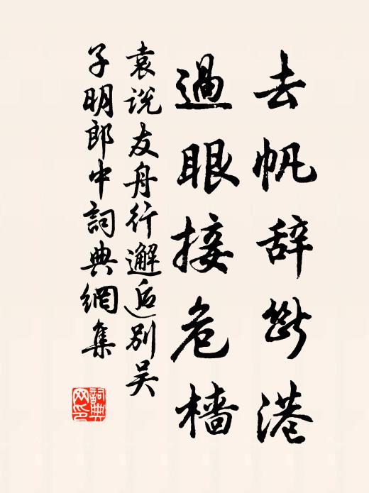 古詩文歷史字典書法欣賞書法字典國語詞典說文解字康熙字典古漢語字典去帆辭斷港,過眼接危檣袁說友 《舟行邂逅別吳子明郎中》名句出處出自宋代袁說友的《舟行邂逅別吳子明郎中》全文:杜宇催歸急,青山送客忙。去帆辭斷港,過眼接危檣。親戚五年別,尊罍一笑長。山西墮殘照,不忍酹離觴。名句書法欣賞去帆辭斷港,過眼接危檣書法作品袁說友名句,舟行邂逅別吳子明郎中名句名句推薦長嘯風前,無人會我,登臨此意楊載《水龍吟 式古堂書畫考卷十八》別後有誰能顧我,客中無日不思君華岳《寄王士貴》這些業種自何來,雖不同門共一家釋了惠《偈頌七十一首》上宰隆恩禮,中闈集寵光蘇頌《秦國太夫人輓辭二首》新來識得閒中性程垓《鳳棲梧(南窗偶題)》殘桃間墮井,新菊亦侵籬許渾《早秋三首》氈帽騎款段,瘦嶺衰草歇胡仲弓《念昔游四首》襟韻絕纖塵,炯炯夜光明月仲並《好事近》百冤退盡任他愁王哲《得道陽》做嬉嬉坦蕩,更認閒閒,閒里安居王哲《錦堂春》享茲吉蠲,申錫來裔佚名《紹興祈谷三首》晞素髮,暖丹田劉克莊《最高樓》明堂購眾材,我公實梁棟強至《上知郡都官》子向水中去,母從岸呼嗚方逢辰《雞雛吟》數行嘉樹紅張錦,一派春波綠潑油黃庭堅《寄別說道》詩詞推薦遠塵軒釋智愚〔宋代〕開窗種修竹,鑒石搆方池。良夜月來此,勞生幾個知。盧似之從道子行項安世〔宋代〕昔我為行客,煩君作好詩。今吾仍是主,送子得無辭。文賦須勤作,經書莫暫離。天資誠美矣,師道可無之。相和歌辭。銅雀台羅隱〔唐代〕強歌強舞竟難勝,花落花開淚滿繒。只合當年伴君死,免教憔悴望西陵。春日書懷虞儔〔宋代〕吳興太守也堪憐,十日齋廚九不煙。索漠清懷寒食夜,顛狂風雨落花天。流鶯百囀還求友,化鶴重來不是仙。待得病思陸游〔宋代〕殺物求君舌本肥,是非豈復待深思。即今不足何時足?小甑香粳日兩炊。賀新涼(戊戌生日用鄭省倉韻)方岳〔宋代〕問訊江南客。怕秋崖、苔荒詩屋,雲侵山屐。留得釣竿西日手,夢落鷗傍鷺側。倩傳語、溪翁將息。四十飛騰斜暮次韻和張芸老阻風見寄孔武仲〔宋代〕聞道征帆卻滯留,蕭條湘岸正南頭。春光雖有將歸意,野色仍供不盡愁。破浪心期元萬里,揚帆目送已千舟。山齊書台州上方不出院僧壁李邴〔宋代〕不下山來十四年,區區笑我走塵寰。只應後夜經聲寂,明月清風自往還。嘲淮浪楊萬里〔宋代〕碧琉璃地展青羅,橫作一波仍萬波。突起銀山倚空立,碎成雪陣掠人過。爭先打岸終誰勝,淘盡浮沙柰汝何。借與寄鄭龍川子汝瞻岩翁二首一敘別懷一謝惠端硯王邁〔宋代〕寄我端溪玉一彎,文房取友此其端。眼中厭持珊瑚樹,掌上忻擎紫馬肝。底用千金求國手,擬封九錫霸詞壇。他時