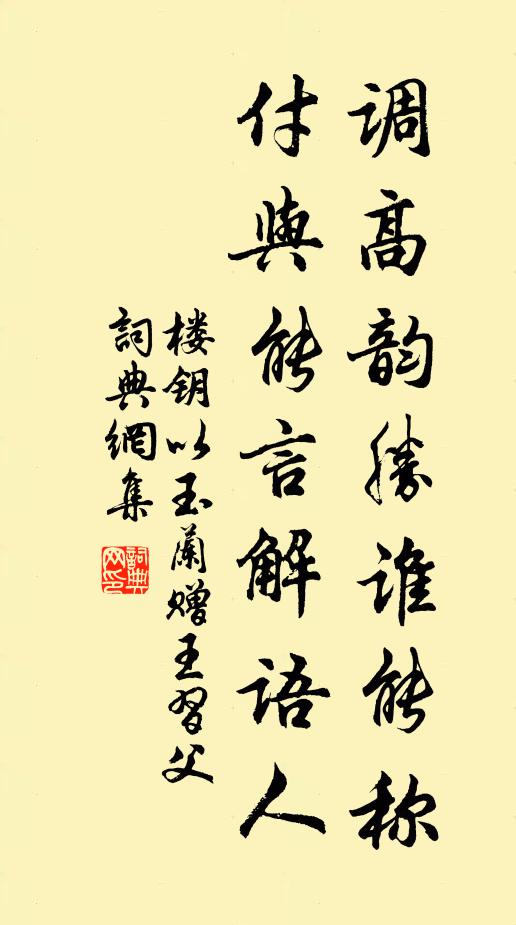 古詩文歷史字典書法欣賞書法字典國語詞典說文解字康熙字典古漢語字典調高韻勝誰能稱,付與能言解語人樓鑰 《以玉蘭贈王習父》名句出處出自宋代樓鑰的《以玉蘭贈王習父》全文:一種香蘭玉色新,仙家分得蘂宮春。調高韻勝誰能稱,付與能言解語人。名句書法欣賞調高韻勝誰能稱,付與能言解語人書法作品樓鑰名句,以玉蘭贈王習父名句名句推薦歸來北堂下,寒光翻露葉蘇軾《中秋月寄子由三首》金行分此夜,桂子落何山,座席清風裡,人家灝氣間孫復《中秋月》爾為背風鳥,我為涸轍魚王績《薛記室收過莊見尋率題古意以贈》明月如昨日,而我鬢成絲高斯得《中秋獨坐有感》想見江南原上墓,樹枝零落紙錢風王安石《思王逢原三首》絕望羔酒醉,作意鷺股割陳造《雪再次韻》竹下幽香祗自知,孤高終近歲寒姿鄭清之《竹下見蘭》春風中哨立,古道上安馳陳著《挽孫大監二首》淺著鉛華素淨妝呂勝己《浣溪沙》剖竹相通澗下泉,更邀山色在樽前俞桂《山中》上方成共宿,劇語到元幽杜耒《同紫芝宿雙嶺》佇立望日昃陸機《擬西北有高樓詩》負梢水中蒲,菸葉湖外草王之道《夏日雨講郊行次韻劉春卿》自慶一時文物會,肯拚身世醉如泥趙崇潔《游亭晚酌》且宴陪珠履,歌按雲鬟鄧千江《望海潮·上蘭州守》詩詞推薦偶成小酌招魯望不至,以詩為解,因次韻酬之皮日休〔唐代〕醉侶相邀愛早陽,小筵催辦不勝忙。沖深柳駐吳娃幰,倚短花排羯鼓床。金鳳欲為鶯引去,鈿蟬疑被蝶勾將。如何和武相公早春聞鶯韓愈〔唐代〕早晚飛來入錦城,誰人教解百般鳴。春風紅樹驚眠處,似妒歌童作艷聲。呵筆袁說友〔宋代〕呵筆小吟消白日,閉門高臥卻紅塵。平生笑我千方誤,投老從公兩歲隣。雜詠一百首周堪劉克莊〔宋代〕舊{左亻右替日換心}臣學淺,晚召主恩深。莫鑒蕭張否,重來遂病瘖。送宋飲冰過四明郡齋薛嵎〔宋代〕元戎招士重親臨,喜遂詩書萬里心。乍免客愁供帳具,暫停游事戟門深。秋空矯首瞻魁彩,夜燭憑花聽雁音。從此二月四日雪梅堯臣〔宋代〕前日春風初擺條,昨夜雪飛深一尺。北帝及臘不行令,東皇發煦遭爾厄。侵時奪氣四時錯,欲問上天何不責。天高融州老君洞敕賜真仙岩之圖杜應然〔宋代〕古號黔南今號融,真仙第一勝高嵩。仙關標榜門增麗,聖像威靈民名崇。帝賜御書藏寶閣,天生石像老仙翁。瓶爐箭李嶠〔唐代〕漢甸初收羽,燕城忽解圍。影隨流水急,光帶落星飛。夏列三成范,堯沉九日輝。斷蛟雲夢澤,希為識忘歸。題張埧夫腴莊圖三首楊萬里〔宋代〕花光泉響不相參,城市山林難兩兼。不分腴莊最無賴,一時奄有忒傷廉。句吳芾〔宋代〕半刺豈能淹驥足,一封行見下龍墀。