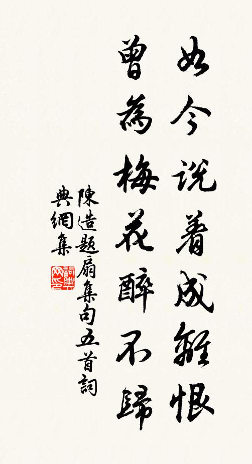 古詩文歷史字典書法欣賞書法字典國語詞典說文解字康熙字典古漢語字典如今說著成離恨,曾為梅花醉不歸陳造 《題扇集句五首》名句出處出自宋代陳造的《題扇集句五首》全文:自恨尋春去較遲,古來四事巧相違。如今說著成離恨,曾為梅花醉不歸。名句書法欣賞如今說著成離恨,曾為梅花醉不歸書法作品陳造名句,題扇集句五首名句名句推薦往事總悠悠吳澄《木蘭花慢 三用韻 原誤作 茲據何抄本改》一曲清歌倒酒蓮,尚有香蒲暈史浩《卜運算元(端午)》試效人所為,君魚不勝食文同《夏秀才江居五題直鉤磯》曲直我不知,負暄候樵牧杜甫《寫懷二首》陰磵澌經月,寒花開過春釋善珍《雪峰舊院》我來臥病還多感,一筆蛛絲滿硯塵林逋《謝馬程先輩惠蜀牋》似水驚衣被,如金議炭薪方回《阻雪留丹陽苦寒》功名蟻行磨,意氣鵲棲枝馬廷鸞《次趙二車韻》樓澄鑑湖北,地險雪濤東石延年《送鄭十學士戩通理越州》軻峨商客艑,嘈囋酒家樓陸游《郡齋偶書》費盡胭脂畫不妍,春心一縷褪唇嫣廖行之《雨中惜海棠花四首》西方頃多事,二十勇如虎袁說友《贈王副伴》兵銷擒布後,台聳畏軒餘宋庠《朝謁建隆寺》綠窗銷暗燭,蘭徑掃清塵權德輿《雜言和常州李員外副使春日戲題十首》一水近通西浦路,客來猶可棹漁船李行中《醉眠亭》詩詞推薦嵩山小兒吟佚名〔唐代〕我本長生深山內,更何入他不二門。爭如訪取舊時伴,休更朝夕勞神魂。四言詩祭母文_〔近現代〕嗚呼吾母,遽然而死。壽五十三,生有七子。七子餘三,即東民覃。其他不育,二女二男。育吾兄弟,艱辛備歷。早起玉堂窗前俯方池有感徐元傑〔宋代〕玉堂窗外小池深,香霧朝浮花氣沈。村杪亭亭鴉點墨,萍根發發鯉跳金。中涵一勺淵泉定,上有九重天日臨。充廣偶游溫庭筠〔唐代〕曲巷斜臨一水間,小門終日不開關。紅珠斗帳櫻桃熟,金尾屏風孔雀閒。雲髻幾迷芳草蝶,額黃無限夕陽山。與君次韻蘇公西湖觀月聽琴陳師道〔宋代〕清湖納明月,遠覽無留雲。人生亦何須,有酒與桐君。自醉寧問客,一樽復一樽。平生今不飲,意得同酣醺。清言句張湜〔宋代〕吳山空對越山明。雙峰寺得舍弟書李涉〔唐代〕暫入松門拜祖師,殷勤再讀塔前碑。回頭忽向尋陽使,太守如今是惠持。宿龜石寺舒岳祥〔宋代〕朅來誰主我,野寺得閒行。借屋安書庋,就岩搘飯鐺。山晴分雁轉,水暖見魚生。無事人情好,相逢總笑迎。鷓鴣天晏幾道〔宋代〕陌上濛濛殘絮飛,杜鵑花里杜鵑啼。年年底事不歸去,怨月愁煙長為誰。梅雨細,曉風微,倚樓人聽欲沾衣。故園題金州西園九首石庭姚合〔唐代〕布石滿山庭,磷磷潔還清。幽人常履此,月下屐齒鳴。藥草枝葉動,似向山中生。