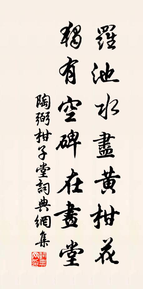 古詩文歷史字典書法欣賞書法字典國語詞典說文解字康熙字典古漢語字典羅池水盡黃柑花,獨有空碑在畫堂陶弼 《柑子堂》名句出處出自宋代陶弼的《柑子堂》全文:子厚才名甲有唐,話官分得荔支鄉。羅池水盡黃柑花,獨有空碑在畫堂。陶弼詩詞大全名句書法欣賞羅池水盡黃柑花,獨有空碑在畫堂書法作品陶弼名句,柑子堂名句名句推薦閏秋重九再佳辰,猶見黃花裛露新晏殊《閏九月九日》憶昔補官太皞墟,泮宮蕭條人事疏蘇轍《寄孫朴》起尋塵外游,綠陰已連畦李壁《游西湖分韻得棲字》晚節誠知止,吾生況若浮宋祁《還都有感》耽詩吧我寒仍瘦,養氣知君老更華趙蕃《過曾季永》歸與謝郎稱萬福,免教紅爛在漁舟釋紹曇《疏山送日兄歸玄沙》得句莫嫌呵凍筆,明年歲事已堪占華岳《雪》眾中若有知恩者,一粒何曾咬破來范成大《淨慈顯老為眾行化,且示近所寫真,戲題五絕》年豐如可待,吾豈病長飢趙蕃《十二月二十九日雪三首》權奇滅沒猶驚電,漫許拳毛世特夸岑津《題韓乾馬》空餘故宮苑,寒譽飛野蒿陳深《姑蘇台晚眺分韻得高字》黃鶴樓前吹笛時,白蘋紅蓼滿江湄呂岩《題黃鶴樓石照》月樹吾人傾蓋,風蟬老子聞韶李石《扇子詩》霧豹文雖隱,同蟬蛻即仙姚勉《和葛德遠》南渡衣冠墜,俄然氣象還周必大《凌閣學輓詩二首》詩詞推薦四月八日三絕劉克莊〔宋代〕徵在生夫子,摩耶育釋迦。人人衣逢掖,個個著袈裟。再賦紅梅王洋〔宋代〕比玉比冰俱未切,恰是紅兒兼比雪。東君主掌不堅牢,也作堪憐也堪折。又和次中答莘老見招蘇頌〔宋代〕近甸無辭暫駐車,吳門雖好隔重湖。且嘗竹苑迎霜兔,休憶松江上釣鱸。老見交朋尤眷戀,醉吟風月好躊躇。廣陵禁中聞蛩白居易〔唐代〕悄悄禁門閉,夜深無月明。西窗獨暗坐,滿耳新蛩聲。卜運算元(集句)趙彥端〔宋代〕脈脈萬重心,相望何時見。強半春寒去卻來,野水差新燕。遠負白頭吟,坐惜紅顏變。欲問平安無使來,日落庭花句盛度〔宋代〕南國松楸舊,東湖水石涼。游太平公主山莊韓愈〔唐代〕公主當年欲占春,故將台榭押城闉。欲知前面花多少,直到南山不屬人。次韻謝石教授喜十晁公溯〔宋代〕天子齋居坐法宮,萬方都屬指揮中。敢安無事思樂泮,方戒有司歸在豐。每念三農皆望歲,直朝九月始休工。知君次韻曾子開舍人游藉田載荷花歸黃庭堅〔宋代〕維王調玉燭,時夏雨我田。壁掛蒼龍骨,溜渠故濺濺。三推勸根本,百穀收皂堅。官司極齋明,崇丘見升煙。系馬別楊尊章粲〔宋代〕遠遊同是客,執別兩情牽。天地愁眉破,山林歸夢圓。西行迷蜀道,北望黯淮邊。馬上封侯事,相期在少年。
