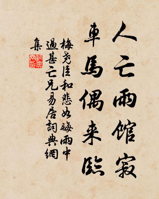 古詩文歷史字典書法欣賞書法字典國語詞典說文解字康熙字典古漢語字典人亡雨館寂,車馬偶來臨梅堯臣 《和悲如晦雨中過甚亡兄易居》名句出處出自宋代梅堯臣的《和悲如晦雨中過甚亡兄易居》全文:人亡雨館寂,車馬偶來臨。濕衣添新淚,故物傷夙心。淒淒庭下樹,萬葉起哀音。此地嘗對語,在昔豈知今。名句書法欣賞人亡雨館寂,車馬偶來臨書法作品梅堯臣名句,和悲如晦雨中過甚亡兄易居名句名句推薦西弱水兮東瀛洲,超然變化兮不可以留王炎《臨湘縣崇惠廟詞》南渡百年無雅樂,當年猶惜廣陵音陳普《詠史下嵇康》堯舜非傳子,殷周但卜年姚合《文宗皇帝輓詞三首》目送蜚鴻歸天際黃升《西河(已亥秋作)》繞巡門,散喏好降心,與修行方便佚名《玉交梭 梭疑枝之誤》數叢芳草在堂陰,幾處閒花映竹林張謂《西亭子言懷》相承次第,皮肉骨髓釋正覺《禪人並化主寫真求贊》氣清夜永兮月低,斗冷河空兮露泣釋正覺《禪人並化主寫真求贊》淺淺銀壺催曉色貫雲石《蝶戀花 錢塘燈夕 永樂大典卷二萬三百五十四》雪繭紅蠶熟後,黃雲隴麥秋間周紫芝《雨中花令(吳興道中,頗厭行役,作此曲寄武林交舊)》遙指蒙茸雲木堆,入門小剎傍岩偎馮伯規《游北岩》倒屣迎王粲,登門得孔融陳棣《挽主簿吳寧侯三首》草庵文字太多,只為老婆心切樓鑰《跋惠峰詢老所編類海》莫訝塵生楊綰席,都緣坐少席文氈鄭剛中《客至木綿坐已為長韻成四韻》抖擻身章卻冒塵,褭躓顧影也逡巡程大昌《宿直留詩》詩詞推薦村笛韋莊〔唐代〕簫韶九奏韻淒鏘,曲度雖高調不傷。卻見孤村明月夜,一聲牛笛斷人腸。白髮葉茵〔宋代〕半世持竿笠澤濱,鬢邊留得幾莖春。近來白髮無公道,暗把黑頭饒貴人。唆都文天祥〔宋代〕虎牌氈笠號公卿,不直人間一唾輕。但願扶桑紅日上,江南匹士死猶榮。題史壽卿二畫仇遠〔宋代〕香草何時號水仙,翠翹羅襪步蹁躚。風標宜作梅花伴,不入離騷亦偶然。木蘭花令黃庭堅〔宋代〕風開水面魚紋皺。暖入草心犀點透。乍看晴日弄柔條,憶得章台人姓柳。心情老大痴成就。不復淋漓沾翠袖。早梅夢語洪咨夔〔宋代〕塵尾御犢轅,竹枝招羊車。意足各人眼,心合無天涯。寶扇閒草蟲,碧衫涼暗花。荼蘼金沙底,清歌按紅牙。醒疑靜中釋文珦〔宋代〕靜中觀世道,一一總非真。齟齬英賢詘,依馮鄙賤伸。狂瀾乘颶勢,枯木借藤春。何似都忘著,沈潛自養神。再次羊羔酒韻三首陳造〔宋代〕元放諸孫憐遽許,截肪醉骨薦馨香。茂先九醖猶須問,自是詩翁石作腸。堂下梅一枝開遲而花極小疑地勢使然感嘆而作趙蕃〔宋代〕梅發無衰盛,根生有瘠腴。都緣托地薄,故使著花癯。渺小吾憐爾,伶仃爾念吾。詎須詩欠興,何用竹相娛。興善寺貝多樹張喬〔唐代〕還應毫末長,始見拂丹霄。得子從西國,成陰見昔朝。勢隨雙剎直,寒出四牆遙。帶月啼春鳥,連空噪暝蜩。遠根