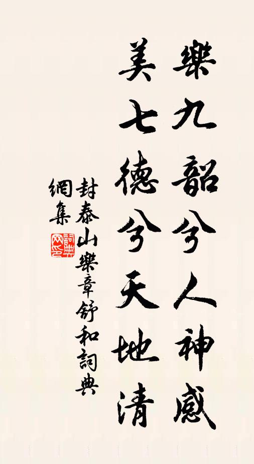 古詩文歷史字典書法欣賞書法字典國語詞典說文解字康熙字典古漢語字典樂九韶兮人神感,美七德兮天地清佚名 《封泰山樂章。舒和》名句出處出自唐代佚名的《封泰山樂章。舒和》全文:六鍾翕協六變成,八佾倘佯八風生。樂九韶兮人神感,美七德兮天地清。佚名詩詞大全名句書法欣賞樂九韶兮人神感,美七德兮天地清書法作品佚名名句,封泰山樂章。舒和名句名句推薦秋韃人散雨千絲,誰把秦笙隔院吹方岳《湖上》久知天命屬真主,奮身來建非常功迺賢《答祿將軍射虎行》寥落空江上,買魚開酒尊林景熙《宿七里灘》湖雁雙雙起,人來故北征杜甫《宿青草湖(重湖,南青草,北洞庭)》一水從天下,源深不可知釋文珦《九仙山中瀑》散作一空雨,長如四月天李介山《梅雨潭》客帆詎表駐,搔首蒼煙叢范成大《湖口望大孤》一任張良算出去,人生何惜老年華陳普《壽柏峰》食人及其類,勛舊一朝烹陳獨秀《告少年》往未瞻烏府,先曾涉杏壇趙蕃《呈王侍郎昆仲二首》追隨我輩人,偶到蓬萊家李彌遜《與同館晝會王公衡家分韻得瓜字》胎息存思當黑處,井華懸綆取朝間賈島《贈溫觀主》楚客驚停棹,湘妃慘濕鬟樂章《龍壽山萬歲寺》竅聽鏘金奏,仍聞破竹成陳造《次韻趙帥四首》不教才展休明代,為罰詩爭造化功白居易《答劉和州禹錫》詩詞推薦再賦前韻五首王洋〔宋代〕衛玠神清玉不如,非同杜刈斬肌膚。十篇冰玉傳青史,便是神清得似無。太息高選〔宋代〕天運逢南度,和成勢已移。山河憐破碎,草木亦傷悲。鐵騎馳中土,烽塵隘北陲。哀臣雙淚眼,豈畏朔風吹。賦得白鷺鷥送宋少府入三峽李白〔唐代〕白鷺拳一足,月明秋水寒。人驚遠飛去,直向使君灘。清平樂朱敦儒〔宋代〕相留不住。又趁東風去。樓外夕陽芳草路。今夜短亭何處。杏花斜壓闌乾。朱簾不捲春寒。惆悵黃昏前後,離愁酒頌古四十八首釋慧開〔宋代〕聞名不如見面,見面不如聞名。雖然救得鼻孔,爭奈瞎卻眼睛。拒霜姜特立〔宋代〕楚天寂歷暮雲平,何處江村落雁聲。正是西風掃黃葉,不知春色在朱榮。酹江月(和辛稼軒金陵賞心亭)王奕〔宋代〕英雄老矣,對江山、莫遺淚珠成斛。一D64E西風休掩面,白浪黃塵迷目。鳳去台空,鷺飛洲冷,幾度斜陽木。送崔玄亮赴果州冬夜宴韓卿宅姚合〔唐代〕蘭燭照重茵,飛杯復幾分。主人寒不寐,上客曉離群。騎吏緣青壁,旌旗度白雲。劍銘生蘚色,巴字疊冰文。華省醉時歌(贈廣文館博士鄭虔)杜甫〔唐代〕諸公袞袞登台省,廣文先生官獨冷。甲第紛紛厭粱肉,廣文先生飯不足。先生有道出羲皇,先生有才過屈宋。德尊和陶乞食戴表元〔宋代〕今朝胡不樂,取書一喔之。飢窮古不免,陶生良有辭。骨肉同天倫,僮僕緣食來。如何長年中,萬事付酒杯。脫身