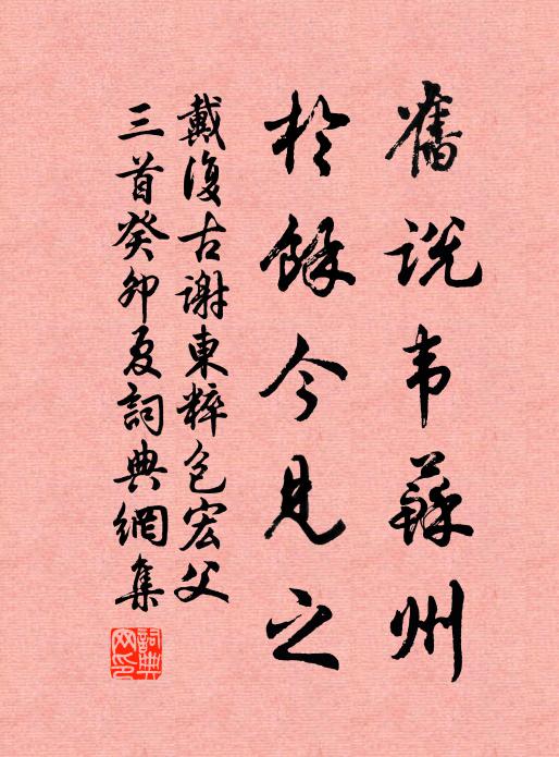 古詩文歷史字典書法欣賞書法字典國語詞典說文解字康熙字典古漢語字典舊說韋蘇州,於余今見之戴復古 《謝東粹包宏父三首癸卯夏》名句出處出自宋代戴復古的《謝東粹包宏父三首癸卯夏》全文:平生不識字,把筆學吟詩。舊說韋蘇州,於余今見之。每遭饑寒厄,出吐辛酸辭。候蟲鳴屋壁,鳳蟬囀枯枝。但有可憐聲,入耳終無奇。宏齋誤題品,恐貽識者飢。名句書法欣賞舊說韋蘇州,於余今見之書法作品戴復古名句,謝東粹包宏父三首癸卯夏名句名句推薦已止還復作,瀉檐聲更長張九成《雨》浮空交彩翠,濺遠亂珠璣文同《施公潭》金輪統御四天下,普施群生安隱樂釋宗杲《偈頌一百六十首》青錢學士方年少,年少羞為老人調許志仁《謝張學士惠靈壽杖》清愁亦可剪,無處買並刀陸游《遣懷》策杖過短壑,蠟屐登高邱王銍《送和斜川詩二首》病悰拋酷暑,詩興得高秋張耒《斜日二首》春妍老欲仙,敢不一告至方岳《再用韻酬朱制乾憶梅》茅屋三間臨木杪,門前流水潺潺倪偁《臨江仙》近住城中寺,陰雲漬竹房薛師石《淨光長老極能詩》真閒真靜,誰知如是訊息李道純《百字令 贈陳制斡》白玉毬團青玉枝,幽芳不恨見春遲陳造《新林小憩見花二首》後所以信今,豈不亦藉此方回《七十翁吟五言古體十首》落英欲買真無價,唯許騷人罄一餐楊巽齋《金錢菊》山中人,灶間婢,亦驚猜魏了翁《水調歌頭(過凌雲和張太博方)》詩詞推薦南歌子陳允平〔宋代〕懶傍青鸞鏡,慵簪翠鳳翹。玉屏春重寶香銷。因甚不忺梳洗、怕登樓。載酒垂楊浦,停橈杜若洲。傷春情緒寄箜篌任師中輓詞蘇軾〔宋代〕大任剛烈世無有,疾惡如風朱伯厚。小任溫毅老更文,聰明慈愛小馮君。兩任才行不須說,疇昔並友吾先人。相看再賦丁謂〔宋代〕彼美性秋江上,性塵埃恥托性根。笑傾性行雨國,香返夢蘭魂。蛺蝶無媒妁,鴛鴦見子孫。遍窺思兩槳,深鎖憶重殘句歲寒冰冷天地閉蘇軾〔宋代〕歲寒冰冷天地閉,為我起{上左幸右丸下蟲}鞭魚龍。宮詞宋白〔宋代〕繡騎前驅盡國娃,芳園初看牡丹花。千官狼狽如蜂蝶,迴避楊妃七寶車。賦月李紳〔唐代〕月。光輝,皎潔。耀乾坤,靜空闊。圓滿中秋,玩爭詩哲。玉兔鏑難穿,桂枝人共折。萬象照乃無私,瓊台豈遮君送誠齋二首袁說友〔宋代〕誰作朝陽一鳳鳴,公朝今復嘆斯人。抗章寧奪三軍帥,去國尤輕一葉身。政以青蒲姑夕駐,更聞白簡為前陳。只今末利菊史鑄〔宋代〕來從西域馨香異,翻作東籬品自新。悟此肯為微利役,殷勤來賞屬幽人。送朱熙載改官還鄉傅察〔宋代〕陶唐名臣有朱虎,揖遜夔夷尊文祖。後來傑出漢雲孫,折檻當時誰敢侮。煌煌新地見斯人,凜凜遺風振千古。乘牛謁叢霄館張鎡〔宋代〕奉真祠宇並丹房,露下層壇夜未央。玉繡球明依砌樹,翠鬘雲轉罨爐香。何心輕舉氛塵外,但願閒居歲月長。卻上