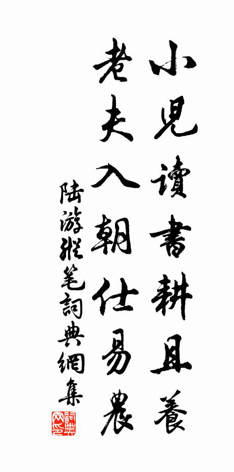 古詩文歷史字典書法欣賞書法字典國語詞典說文解字康熙字典古漢語字典小兒讀書耕且養,老夫入朝仕易農陸游 《縱筆》名句出處出自宋代陸游的《縱筆》全文:小兒讀書耕且養,老夫入朝仕易農。明春史成許歸去,父子相逐歌年豐。陸游詩詞大全名句書法欣賞小兒讀書耕且養,老夫入朝仕易農書法作品陸游名句,縱筆名句名句推薦晴煙獨鳥沒,野渡亂花飛司馬扎《送歸客》金氣風初勁,銀河露恐垂釋慈永《詠月桂峰桂子》聽金童宣敕,瓊胎掇送,大唐進士,聖宋仙翁趙福元《沁園春》短篇堪掣鯨,片文可驅鱷劉克莊《古意二十韻》老天也信還家好,淡日柔風送客歸洪咨夔《嘉陵江舟中三絕》風卷浮雲披睥睨,露涼明月墜闌乾許渾《和崔大夫新廣北樓登眺》輕飈振槁葉,唱徹陽關曲羅與之《玉梁道中雜詠》兒歌女舞,彩衣共戲,仰祝齊眉偕老佚名《鵲橋仙》邇來焦槁遍區宇,黃金剌液膠流弩王之道《次韻子厚弟喜雨行贈趙守端質》瑤匣若浮雲,冥冥藏玉水鮑溶《舊鏡》算蝸戰、多少功名,問蟻聚、幾回今古朱敦儒《聒龍謠》沖融道貌丹為臉,扶疏漆發黑盈頭史浩《最高樓(鄉老十人皆年八十,淳熙丁酉三月十九日,作慶勸酒)》眾作紛紛鳴瓦釜,黃鐘聊復鼓於宮劉克莊《次韻別方時父》治法征謀關世道,清忠定力簡皇衷文天祥《挽李制帥二首》修短有定數,賢愚莫問渠戴復古《族侄孫子榮之子神童顏老不幸短命而死哭之不》詩詞推薦丙辰元夜釋斯植〔宋代〕淡河斜浸月光浮,看盡青山更倚樓。殘燭怕寒元夕夜,小欄花影伴人愁。智斷身心辭晃逈〔宋代〕咨咨爾幻身,誰能住世久。洪纖妍媿,豈長存而不朽。咨咨爾幻心,常隨外物誘。風生電滅,求其狀而何有。豁然和彭秋宇四月所唐律張埴〔宋代〕囅聲鐵聚杯湖上,霍地金舂鏡石前。鳳至祗和成二老,龍眠不作可千年。南樓暫阻詩同賦,東郭還存履未穿。一優和宋英叟二首何夢桂〔宋代〕圯上編書未出奇,有來相問重相規。桑蓬自笑平生志,泡露誰能萬世基。閒去帶鉏編露術,醉來呼酒賦江蘺。青門變竹枝詞九首之二賀鑄〔宋代〕隔岸東西州,清川拍岸流。但聞竹枝曲,不見青翰舟。秦淮楊修〔宋代〕一氣東南三鬥牛,祖龍空為子孫憂。金陵地脈何曾斷,不覺真人已姓劉。送西秦張仲實游大滌洞天林昉〔宋代〕此時仙興發,九鎖訪名峰。玉洞晝飛鼠,石池春浴龍。異人花外見,道士酒邊逢。余欲采芳茗,白云何所從。梅殘寒夜不寐新柳小飲俎豆,頗備江西淮浙之楊萬里〔宋代〕雪巳都消去,梅能小住無。雀爭飛落片,蜂獵未蔫須。臨江仙佚名〔宋代〕促坐重燃絳蠟,香泉細瀉銀瓶。一甌月露照人明。清真無俗韻,久淡似交清。正味能銷酒力,餘甘解助茶清。瓊漿偈四首釋鼎需〔宋代〕懶翁懶不懶,最懶懶說禪。亦不重自己,亦不重先賢。又誰管你地,又誰管你天。物外翛然無個事,日上三竿猶更