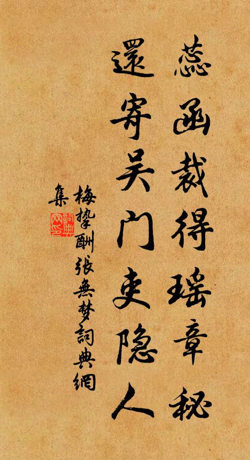 古詩文歷史字典書法欣賞書法字典國語詞典說文解字康熙字典古漢語字典蕊函裁得瑤章秘,還寄吳門吏隱人梅摯 《酬張無夢》名句出處出自宋代梅摯的《酬張無夢》全文:一夢浮生無夢身,先生真是古之真。蕊函裁得瑤章秘,還寄吳門吏隱人。梅摯詩詞大全名句書法欣賞蕊函裁得瑤章秘,還寄吳門吏隱人書法作品梅摯名句,酬張無夢名句名句推薦多少欲來無路問,空於洞口覓桃花陳文蔚《癸未二月廿五日訪周道人西庵戲題》六月苦炎熱,蠟人何似生釋紹曇《偈頌一百一十七首》到頭不會天何意,卻使人生有別離祖無擇《鴛鴦》雲誰之思?美孟庸矣佚名《桑中》池灰休辨劫,川月解明心梅堯臣《過山陽水陸院智洪上人房》平生夢想處,奉乞小巑岏陳與義《心老久許為作畫未果以詩督之》館娃宮中春已歸,闔閭城頭鶯已飛李嘉祐《傷吳中》慶雲飛川泳,和熏三白張榘《瑞鶴仙(次韻陸景思喜雪)》是時歲雲暮,節物良可悲晁公溯《冬暮》爐寒閒取薪添火,窗暗時將燭助燈鞏豐《寒夜》玉樓明月長相憶,柳絲裊娜春無力溫庭筠《菩薩蠻·玉樓明月長相憶》幽蹊幾日不曾來方岳《春日雜興》誰昔夜登閣,歌罷飲亦終陳文蔚《題傅岩叟悠然閣三章章八句》鄉山何處是,目斷廣陵西丘為《登潤州城》惟患不自立,彼於我非愈陳著《夜窗書懷》詩詞推薦南海石門戍懷古陳陶〔唐代〕漢家征百越,落地喪貔貅。大野朱旗沒,長江赤血流。鬼神尋覆族,宮廟變荒丘。唯有朝台月,千年照戍樓。和十二兄五首晃沖之〔宋代〕伯也今代豪華,嗜詩如嗜酒。賦多轉遒勁,語老愈深厚。塵言刪不存,妙句元自有。白華忽補亡,關雎不為首。堝寄江州白司馬楊巨源〔唐代〕江州司馬平安否,惠遠東林住得無。湓浦曾聞似衣帶,廬峰見說勝香爐。題詩歲晏離鴻斷,望闕天遙病鶴孤。莫謾醉詩唐寅〔明代〕碧桃花樹下,大腳墨婆浪,未說銅錢起,先鋪蘆席床。 新雨喜得王卿書問錢起〔唐代〕苦雨暗秋徑,寒花垂紫苔。愁中綠尊盡,夢裡故人來。果有相思字,銀鉤新月開。又代上張帥太尉沈繼祖〔宋代〕三傑人材有重輕,子房呼字不呼名。天授家傳此韜略,固應堂上有奇兵。方虎成功張仲在,惟忠與孝一心純。英姿贈算數汪生方岳〔宋代〕十年不讀床頭易,山雨鳴蓑為口忙。行矣公無落吾事,水田漠漠正移秧。郭司徒廳夜宴錢起〔唐代〕秋堂復夜闌,舉目盡悲端。霜堞鳥聲苦,更樓月色寒。美人深別意,斗酒少留歡。明發將何贈,平生雙玉盤。上西垣舍人王安石〔宋代〕共說才高世所珍,諸賢誰敢望光塵。討論潤色今為美,學問文章老更醇。賦擬相如真復似,詩看子建的應親。仍聞題畫梅李方膺〔清代〕揮毫落紙墨痕新,幾點梅花最可人。願借天風吹得遠,家家門巷盡成春。