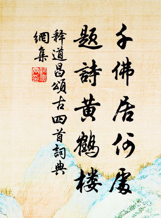 古詩文歷史字典書法欣賞書法字典國語詞典說文解字康熙字典古漢語字典千佛居何處,題詩黃鶴樓釋道昌 《頌古四首》名句出處出自宋代釋道昌的《頌古四首》全文:千佛居何處,題詩黃鶴樓。感恩並積恨,終日在眉頭。釋道昌詩詞大全名句書法欣賞千佛居何處,題詩黃鶴樓書法作品釋道昌名句,頌古四首名句名句推薦有熊競心起,驅獸出林樊元稹《競渡》白頭錯料事,抱璞晞世價王淹《吾兄文夫宦遊天台余將官於江左不勝感離之情》醉臥春色少年馮延巳《三台令》腐朽神奇,夢幻吞侵,朝昏變遷元好問《沁園春 除夕二首》宗廟之問,一出乎正宋高宗《文宣王及其弟子贊》天子按劍怒,使者遙相望鮑照《代出自薊北門行》東方垂欲明,忽被林霧濃方回《楊村秋曉》一心思杏子,便擬見梅花梅堯臣《一日曲》整髻花當檻,吹燈月在窗吳融《戲》可憐烏鵲儔,一枝聊自寄宋伯仁《梅花喜神譜欲謝一十六枝》憑誰詩寄我,溪水接流瓢舒岳祥《酬張常吉》往事不須追諫,從今去、拂袖何求潘良貴《滿庭芳(中秋)》月落牆陰,一屏睡睫濛濛趙功可《聲聲慢(殘夢和兒韻)》他寢此時吾不寢,近秋三五日逢晴賈島《酬朱侍御望月見寄》盤緗錯縹天上無,若為雲錦如許都曾豐《敬賦黃萬安肅餘五雲閣》詩詞推薦醉花陰佚名〔宋代〕粉妝一捻和香聚。教露華休妒。今日在尊前,只為情多,脈脈都無語。西湖雪過留難住。指廣寒歸去。去後又明年送藍峰赴南泉教王希旦〔宋代〕君去清源第一州,鱠魚沽酒有人留。泉山紫帽登臨處,還有高人寄我不。平湖樂·采菱人語隔秋煙王惲〔元代〕采菱人語隔秋煙,波靜如橫練。入手風光莫流轉,共留連,畫船一笑春風面。江山信美,終非吾土,問何日是歸年初度寓郡楊公遠〔宋代〕得失榮枯付分休,康強之外復何求。靈台洞徹天無夜,銀海精明月正秋。謾賦律章酬誕節,旋沽官醞破羈愁。生來與趙旭叩柱歌青童〔唐代〕白雲飄飄星漢斜,獨行窈窕浮雲車。仙郎獨邀青童君,結情羅帳連心花。寄葛秋岩林景熙〔宋代〕吳地繁華半劫灰,故山秋遠夢頻回。琵琶亭老春風棹,桑落洲寒夜雨杯。歲月悠悠人幾換,關河渺渺雁空來。酒酣簡章伯和王諶〔宋代〕論交三十載,彼此坐詩窮。只恨性各別,其他心盡同。茶苗封穀雨,書葉寄苹風。無限懷君意,鶯聲綠樹中。戊戌生日二首方回〔宋代〕客舍逢生日,鄰家送壽星。循彝須答禮,恃熟莫忘形。把筆遲賡和,開樽共醉醒。五兒一隨侍,心竊愧椿庭。詠山榴詩沈約〔南北朝〕靈園同佳稱。幽山有奇質。停采久彌鮮。含華豈期實。長願微名隱。無使孤株出。小重山周容〔宋代〕謝了梅花恨不禁。小樓羞獨倚,暮雲平。夕陽微放柳梢明。東風冷,眉岫翠寒生。無限遠山青。重重遮不斷,舊離