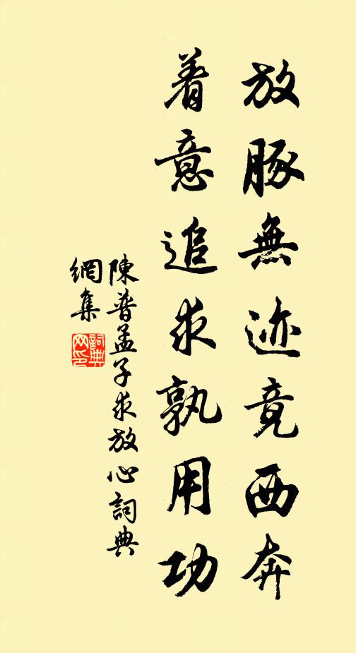 古詩文歷史字典書法欣賞書法字典國語詞典說文解字康熙字典古漢語字典放豚無跡竟西奔,著意追求孰用功陳普 《孟子求放心》名句出處出自宋代陳普的《孟子求放心》全文:放豚無跡竟西奔,著意追求孰用功。惟必操存能主敬,依然不離這腔中。名句書法欣賞放豚無跡竟西奔,著意追求孰用功書法作品陳普名句,孟子求放心名句名句推薦應為仙家修養法,將臨玉女洗頭時乾隆《聖水盆》神識獨游天地外,低眉寧肯謁王公唐寅《抱琴歸去圖》君王有鳳偶,不數芹邊燕白玉蟾《明妃曲》無情休問,許多般事,且自訪梅踏雪辛棄疾《永遇樂》有情願寄向南枝,圖得洛陽春色看張先《木蘭花(送張中行·般涉調)》正想黃陂何淼淼,可憐禹瀆更滔滔祖無擇《濟上夜泊寄杜秘教》青青山上薇,朝莫猶可采釋文珦《言志》月體元自空,三三認盈缺郭印《諸公以嵩師破戒作詩嘲詠因次韻解之》才亡不可用,由上所措置呂公著《分題得癭林壺》浮雲富貴適堪憐,烈士襟期定不然孫應時《用韻贈李恭父》林紅葉盡變,原黑草初燒劉禹錫《連州臘日觀莫徭獵西山》東池暮春風景妍,汩汩淺渠鳴細泉張耒《東池》晨昏調弄自然琴馬鈺《踏雲行 贈駱進道先為鐵匠》千山絕影飛禽怕洪适《漁家傲引/漁家傲》把茅從此成開山,法華妙果僧中賢袁說友《題天衣寺》詩詞推薦諸暨道中五首葛紹體〔宋代〕兩畔綠楊臥碧溪,人家一帶綠楊堤。門開恰出市行路,山在屋頭誰肯棲。石堂陳普〔宋代〕仙佛人言是一家,好分半席共煙霞。廓清摧陷儒家事,不謂青山識正邪。次韻吳叔廉山村許存我〔宋代〕田繞青山好住家,短籬疏圃接丘麻。煙村遠近棲鴉亂,竹岸高低飛鷺斜。泉噴石間嚴涌雪,霧浮堤外柳吹花。連雲次韻梁廣文重午弔古陳造〔宋代〕去年重午飲酒歸,賡歌酬酢無俗子。今年重午約同飲,更向詩人閱詩史。平生玩物遊戲爾,把酒孰知情所寄。交朋送松岡黃提乾釋道璨〔宋代〕人物如公豈久淹,極和平處極森嚴。無心為祿長思去,直道從人肯避嫌。學務躬行惟恐失,貧於未仕不言廉。書邊關成嘉父崔與之〔宋代〕諸老不敢吏,我來容友之。調高械夏曲,局熟弈秋棋。南斗捩船柁,西風吹鬢絲。莫將金玉質,膏沐畫長眉。一萼紅(前題)王沂孫〔宋代〕翦丹雲。怕江皋路冷,千疊護清芬。彈淚綃單,凝妝枕重,驚認消瘦冰魂。為誰趁、東風換色,任絳雪、飛滿綠羅挽江寧丁尉二首劉宰〔宋代〕進秩膺丹詔,論功更紫樞。九霄飛鶚奏,萬里入鵬圖。竟負丁年志,端符巳歲呼。向來延客處,落日澹平蕪。樂府曹植〔魏晉〕魴{月雋}熊掌。豹胎龜腸。正月十一日夜夢與亡友譚德稱相遇於成都小東陸游〔宋代〕當年與子別江乾,漸老心知後會難。豈料今宵清夢裡,東門交轡說春寒。