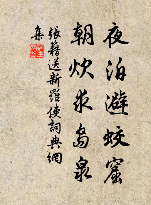 古詩文歷史字典書法欣賞書法字典國語詞典說文解字康熙字典古漢語字典夜泊避蛟窟,朝炊求島泉張籍 《送新羅使》名句出處出自唐代張籍的《送新羅使》全文:萬里為朝使,離家今幾年。應知舊行路,卻上遠歸船。夜泊避蛟窟,朝炊求島泉。悠悠到鄉國,遠望海西天。張籍詩詞大全名句書法欣賞夜泊避蛟窟,朝炊求島泉書法作品張籍名句,送新羅使名句名句推薦希哲學主靜,人死不聞聲袁枚《詠史(六首選—)》蒙莊吏隱機心息,老杜詩成筆力豪陳襄《次韻和程少卿省宿寄齊熙業少卿》無心門掩苔三徑,觀化庭栽竹萬竿白玉蟾《題棲雲堂》聞說平生輔漢卿,武夷山下啜殘羹。陳善《句》處世不必邀功,無過便是功;與人不要感德,無怨便是德。洪應明《菜根譚·概論》一月春寒縮牛馬,束桂薪芻不當價蕭立之《春寒嘆》荻筍蔞芽新入饌,弦鳳吹能翻曲范成大《滿江紅·清江風帆甚快》見說丹台名第一,蕊章須詔侍嚴徐王珪《仁字卷子》洞裡乾刊異,悠然看不窮馬鈺《巫山一段雲》長安千萬人,出門各有營白居易《答元八宗簡同游曲江後明日見贈》曾餌仙丹元不死,求容鬼質豈其然劉克莊《錄顏魯公事》抱病臥漳浦,荏苒久不瘳蔡戡《病中紀事》醉到春來能幾度黃裳《漁家傲(冬月)》覓得黔婁為妹婿,可能空寄蜀茶來白居易《楊六尚書新授東川節度使代妻戲賀兄嫂二絕》慚多無以敘,拙備實難陳源乾曜《奉和御製乾曜與張說宋璟同日上官命宴都堂賜詩》詩詞推薦春色邵雍〔宋代〕去歲春歸留不住,今年春色來何處。洛陽處處是桃源,小車漸轉東街去。奉和御製秋懷詩二首徐沖淵〔宋代〕東壁星辰爛不收,夜涼河漢截天流。芙蓉院靜琴三疊,翡翠簾開月一鉤。黃屋非心辭大寶,碧雲有意思高秋。金聲枯梅史文卿〔宋代〕樛枝半著古苔痕,萬斛寒香一點春。總為古今吟不盡,十分清瘦似詩人。春晴衛博〔宋代〕柳梢梅子暗春城,深院誰家曲水橫。海燕未來人鬥草,野鳩相喚雨初晴。韶光縱好都來幾,客抱如今作麽生。風物漁具詩罱陸龜蒙〔唐代〕有意烹小鮮,乘流駐孤棹。雖然煩取捨,未肯求津要。多為蝦蜆誤,已分??笑。寄語龍伯人,荒唐不同調。書齋晁公溯〔宋代〕廷尉已執天下平,更出一節令循行。時清斷獄歲在減,小臣何功君聖明。紙窗風破夜自語,瓦溝雨來寒有聲。官閒沁園春 將之成都李齊賢〔元代〕堪笑書生,謬算狂謀,所就幾何。謂一朝遭遇,雲龍風虎,五湖歸去,月艇煙蓑。人事多乖,君恩難報,爭柰光陰戲折竹葉為舟示奚奴陳必復〔宋代〕乃翁兒戲可憐生,折葉浮舟趁岸行。有便信風翻覆易,無心逐水去留輕。角崖頗似乘時意,藏壑深關遁世情。幸喜浣溪沙汪莘〔宋代〕青女催人兩鬢霜。自篘白酒作重陽。方壺老子莫淒涼。天地兩三胡蝶夢,古今多少菊花香。只將破帽送秋光。送長子琳連州史入覲章潁〔宋代〕沖雪登長道,吾兒更勉旃。人常談作郡,汝且去朝天。身歷窮閭久,條陳正寧前。故人如問我,為說病彌年。