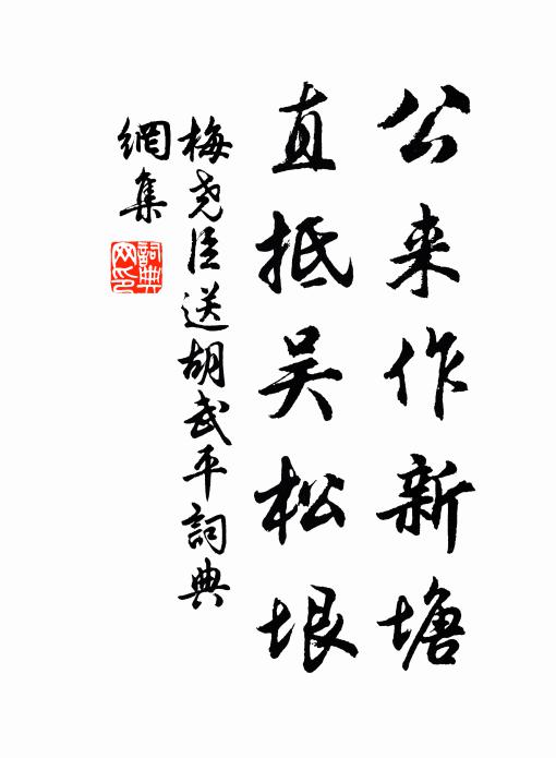 古詩文歷史字典書法欣賞書法字典國語詞典說文解字康熙字典古漢語字典公來作新塘,直抵吳松垠梅堯臣 《送胡武平》名句出處出自宋代梅堯臣的《送胡武平》全文:來見江南昏,使君詠汀苹。再看苹葉老,汀畔送歸人。人歸多慕戀,遺惠在茲民。始時繞郊郭,水不通蹄輪。公來作新塘,直抵吳松垠。新塘建輿梁,濟越脫輈仁。言度新塘去,隨跡如魚鱗。從今新塘樹,便與蔽芾均。我雖備僚屬,筆舌敢妄陳。因行錄所美,願與國風振。名句書法欣賞公來作新塘,直抵吳松垠書法作品梅堯臣名句,送胡武平名句名句推薦紅蓼白蘋訊息斷,舊溪煙月負漁舟李中《感秋書事》數畦蔬甲出,半夢鳥聲移劉得仁《寄春坊顧校書》我生從窮困,哆侈傷南箕王之道《次韻魏定文》疑我此心在,遮防費欄楯蘇軾《李公擇過高郵見施大夫與孫莘老賞花詩憶與仆》北客悲秋色,田園憶去來韓翃《送客之上谷》儉匪珠襦殮,危猶玉幾憑劉克莊《大行皇帝輓詩六首》乃翁一片心,秋月行太虛姚勉《和楊鐵庵送子監鎮之任韻五首》周麰農意切,一一願流根宋庠《遲明出都謝雪龍門佛祠途中復遇雪》英名愧終賈,高節謝巢由司馬光《自嘲》意遠身仍近,人同已易訛項安世《送江陵劉縣丞得多字》翠微寺在杉松老,紫閣峰高水石寒楊徽之《送夢英大師》破裘寒旋補,殘發短猶梳陸游《閒記老境》撫掌棲松鶴,驚飛雪點郊朱谷《和張敏叔祠部壓雲軒韻》拆看篇篇珠玉喜沈瀛《減字木蘭花(同前)》多應卻笑張居士,綺語妄言無了期張鎡《夏夜二首》詩詞推薦初七日雨殊未沾足作四十字趙蕃〔宋代〕上天憐久旱,赫日變濃陰。要使今年熟,須成三日霖。蕭疏財卻暑,點滴謾過林。問我無田客,那懷閔雨心。靖安寺陳洙〔宋代〕處士亡來二百年,故居牢落變祗園。詩名長共江山在,冤氣尚磨星斗昏。台榭幾人留好句,漁樵何處問曾孫。昔時夜行船侯善淵〔元代〕設誓明言衷腸話。棄般般物情俱舍。心口相違,不分真假。把玄門返成功價。縱意為非難勸化。業深大罪愆無舍。南池雜詠五首水月皎然〔唐代〕夜夜池上觀,禪身坐月邊。虛無色可取,皎潔意難傳。若向空心了,長如影正圓。姜鍾離輓詞樓鑰〔宋代〕別去期三載,伻來痛一書。死生誠大矣,力量果何如。平日真知我,遺言苦問予。作銘雖不愧,回首倍欷歔。歲豐宋祁〔宋代〕皇天降豐年,本憂貧土食。貧士無良疇,安能得稼穡。工傭輸富家,日落長嘆息。為供豪者糧,役盡匹夫力。天地和學士秋懷一十五首李彌遜〔宋代〕官居城郭枕山根,嬉語兒童亦帶村。老子痴頑甘避俗,欲從社叟學方言。感遇十首次韻和黃著作魯直以將窮山海跡勝絕晁補之〔宋代〕葉公好畫龍,龍固不可晤。安知下其室,驚駭暗楹霧。昭王亦貿骨,冀以得馬故。相者競舉肥,終然駒遠去。句崔珏〔唐代〕楚王宮地羅含宅,賴許時時聽法來。和謝倅見贈生日二首陳傅良〔宋代〕朝天冠佩幾千員,熟數東州未乏賢。若論中原舊文物,蒲輪應合聘高年。
