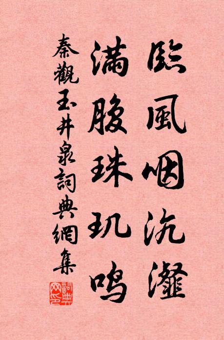 古詩文歷史字典書法欣賞書法字典國語詞典說文解字康熙字典古漢語字典臨風咽沆瀣,滿腹珠璣鳴秦觀 《玉井泉》名句出處出自宋代秦觀的《玉井泉》全文:雲蒸崑山液,月浸藍田英。臨風咽沆瀣,滿腹珠璣鳴。名句書法欣賞臨風咽沆瀣,滿腹珠璣鳴書法作品秦觀名句,玉井泉名句名句推薦不及空庭草,榮衰可兩忘黃庭堅《次韻師厚萱草》正宜且聚集,恨此當離尊杜甫《別李義》雀來啄其茨,蚓出穴其穾韓維《和晏相公觸事成詠四首》信美無與娛,濁醪聊自傾秦觀《和孫莘老題召伯斗野亭》況於五陰後,蒼龍掛高寒魏了翁《九日分韻得寒字》都被海棠分了張炎《杏花天》短晷何能理幽事?南窗剪燭話寒更鄭元祐《和薩天錫留別張貞居寄倪元鎮》掩銀屏,垂翠箔,度春宵溫庭筠《酒泉子·花映柳條》百尺危梯眇海寰,欄乾十二盡青山胡仲參《用馮深居韻題莆陽章氏環翠樓》朝語日再昃,夜談更五檛葉適《哀鞏仲至》長劍倚天誰問,夷甫諸人堪笑,西北有神州辛棄疾《水調歌頭·送楊民瞻》洪纖各遂逍遙遊,續鳧之頸爾其叵方回《題徐仲彬達觀亭》崎嶇歷重丘,窈窕窮遠壑釋文珦《西城行》清江縈山碧玉環,下有老龍千古閒蘇軾《張競辰永康所居萬卷堂》雲心在蓬閬,枝粒不相關丁謂《鶴》詩詞推薦夜行船馬鈺〔元代〕秘奧豈愁天地管。處玄機,故然貧懶。守服環牆,高而不短。馬風性,無寒暖。常*心香慵執卷。師恩報,何時願和李起居秋夜之作薛奇童〔唐代〕過庭聞禮日,趨侍記言回。獨臥玉窗前,捲簾殘雨來。高秋南斗轉,涼夜北堂開。水影入朱戶,螢光生綠苔。簡成念奴嬌侯置〔宋代〕競春台榭,媚東風、迤邐繁紅成簇。方霽溪南簾繡卷,和氣充盈華屋。金暖香彝,玉鳴舞佩,春筍調絲竹。烏衣宴題沖虛堂張繼先〔宋代〕羊其沖氣以全生,棲息虛堂只數楹。南浦道高坊號美,太微風暖木蘭清。百章為愛青林密,三體應書老子成。未有仙遊潭五首馬融石室蘇轍〔宋代〕扶風貴公子,早歲伴山家。吹笛墮秋葉,讀書隨曉鴉。業成心自叛,學苦我長嗟。石室非人住,窮山雪似沙。王監簿南墅新樓落成林景熙〔宋代〕玉佩珊珊不可招,眼空塵界等秋毫。山林貞白三層迥,湖海元龍百尺高。自笑行藏關氣數,肯將歌舞換風騷。捲簾涼思李商隱〔唐代〕客去波平檻,蟬休露滿枝。永懷當此節,倚立自移時。北斗兼春遠,南陵寓使遲。天涯占夢數,疑誤有新知。句錢若水〔宋代〕 * 藻燕簪裾上,五對龍顏日月邊。偈頌二百零五首釋正覺〔宋代〕寒林濡露,明月濯波。時節恁麽,衲僧如何。廓一念不見有自,極十方不見有它。遍界通身無背面,莫教絲緒落機南鄉子(夏夜)黃升〔宋代〕多病帶圍寬。未到衰年已鮮歡。夢破小樓風馬響,珊珊。缺月無情轉畫欄。涼入薴衾單。起探燈花夜欲闌。書冊滿