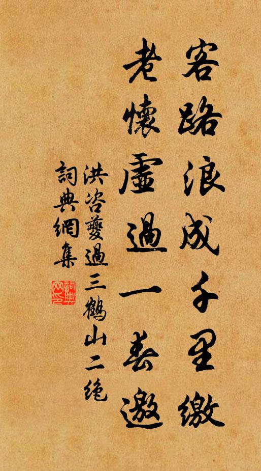 古詩文歷史字典書法欣賞書法字典國語詞典說文解字康熙字典古漢語字典客路浪成千里繳,老懷虛過一春邀洪咨夔 《過三鶴山二絕》名句出處出自宋代洪咨夔的《過三鶴山二絕》全文:客路浪成千里繳,老懷虛過一春邀。落約剛被風扶起,恰與連雲石棧高。名句書法欣賞客路浪成千里繳,老懷虛過一春邀書法作品洪咨夔名句,過三鶴山二絕名句名句推薦岸隔青山,依舊修眉嫵高觀國《鳳棲梧/蝶戀花》十載江湖夢,鴻飛不到君胡仲弓《柬蕭芸莊》優曇花正開,清香來不徹釋道璨《偈頌二十五首》仰看銀河忽倒瀉,月明風露何娟娟汪元量《七月初七夜渡黃河》數窠岷紫破窮搜,珍重留為老齒羞陳著《收芋偶成》不如買田園,荷鍤理蔬畦郭印《次蒲大受檢覆韻》讀書老不入,屢讀屢遺忘曹勛《懷歸自訟》前時向者里解粘去縛,而今卻要添繩加索釋可湘《偈頌一百零九首》漸望廬山遠,彌愁峽路長白居易《郡齋暇日憶廬山草堂,兼寄二林僧社三十韻,》好個嫩涼天氣,想聞雞聽雁,意氣猶忺李曾伯《八聲甘州(壽劉舍人)》誰言千里自今夕,離夢杳如關塞長。薛濤《送友人》層塔可梯升後進,五峰有路達前修王南一《西湖》風綽佩珊珊賀鑄《步花間》謫降人間,愧恨當初錯侯善淵《點絳唇》紅日破陰晴色轉,廬山如洗入堂來董嗣杲《生意堂三首》詩詞推薦贊歷代天師第二十八代諱敦復字延之白玉蟾〔宋代〕棘圍戰罷笑歸來,一寸功名心已灰。白鶴何年歸洞府,夕陽影里野猿哀。長命女·春日宴馮延巳〔唐代〕春日宴,綠酒一杯歌一遍。再拜陳三願:一願郎君千歲,二願妾身常健,三願如同樑上燕,歲歲長相見。李都尉芙蓉堂鄭獬〔宋代〕堂上芙蓉花最饒,開時不見玉欄橋。來從洛浦見羅襪,生在楚宮俱細腰。何處仙人來跨鳳,夜深明月好 * 。剩收寄題張法曹瞻雲軒樓鑰〔宋代〕張侯名軒意可知,如登太行看雲移。我雖未得登軒墀,不鄙要我巴人詞。爾時膝下遨以嬉,欲斵數語語不隨。娛侍挽阮開之洪咨夔〔宋代〕窮達皆歸命,虧成不掛心。醉余便腹睡,棋罷掉頭吟。孔雀門闌舊,驪駒院落深。可堪重剝啄,寂寂杏花陰。葛坡釋紹曇〔宋代〕滋蔓年來愈更深,一刀截斷了無因。不知大道陵遲處,絆倒幾多忙走人。頌古三十一首釋安永〔宋代〕見成底事沒商量,剔起眉毛未廝當。日暮碧天鴻雁斷,海門斜去兩三行。江居寄關中知己齊己〔唐代〕多病多慵漢水邊,流年不覺已皤然。舊栽花地添黃竹,新陷盆池換白蓮。雪月未忘招遠客,雲山終待去安禪。八行酬張明府皎然〔唐代〕愛君詩思動禪心,使我休吟待鶴吟。更說郡中黃霸在,朝朝無事許招尋。楚甸江頭望雪晴二首馮時行〔宋代〕晴天開澤國,江渚匝煙圍。鷺靜蕭蕭立,梅孤默默飛。岸荒群虎過,村迥一人歸。愁緒如相惱,帆收徑典衣。