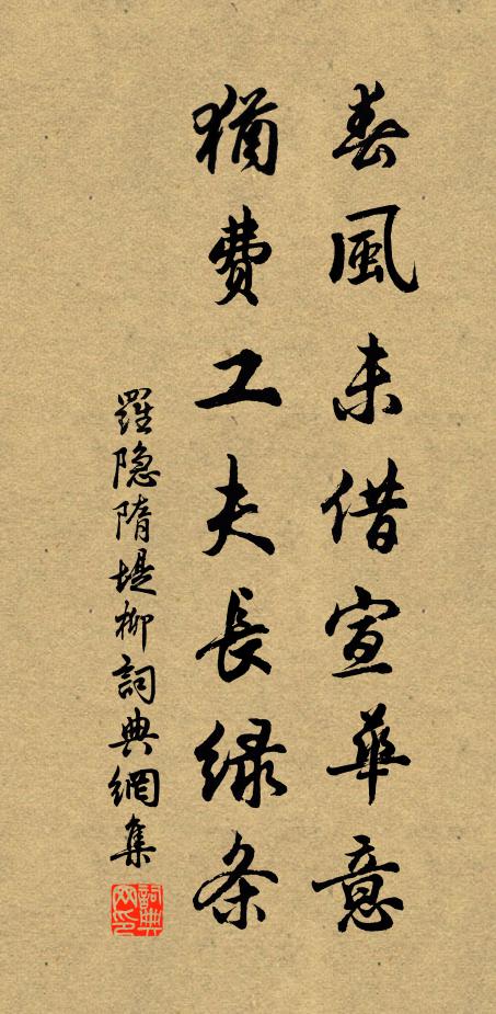 古詩文歷史字典書法欣賞書法字典國語詞典說文解字康熙字典古漢語字典春風未借宣華意,猶費工夫長綠條羅隱 《隋堤柳》名句出處出自唐代羅隱的《隋堤柳》全文:夾路依依千里遙,路人回首認隋朝。春風未借宣華意,猶費工夫長綠條。羅隱詩詞大全名句書法欣賞春風未借宣華意,猶費工夫長綠條書法作品羅隱名句,隋堤柳名句名句推薦高穿群木無因蔽,平倚危樓最好看張冕《海棠》籬菊師淵明,庭草悲王胄張九成《和施彥執懷姚進道葉先覺韻》前日訪潘閬,下馬入窮巷王禹偁《送馮尊師》千丈拿空蟄龍起,一聲破柱春雷疾劉克莊《關仝驟雨圖》仙宮仙府有真仙,天寶天仙秘莫傳高適《玉真公主歌》諸君莫笑茅茨陋,野意蕭疏更覺真程公許《小圃茅亭初成即事十絕句》向來於湖翁,詩詞題屋枋仇遠《予久客思歸以秋光都似宦情薄山色不如歸意濃》風力鹹通邁何遜《贈族人秣陵兄弟詩》四照梨花一色中,他時珍賞有雌雄強至《和司徒侍中壬子寒食會壓沙寺詩二首》遂令一時暫不雨,輒以困急號天翁歐陽修《答楊辟喜雨長句》脫體文章都換骨,從頭宦業便通神鄭剛中《贈范茂直》稽首彌陀圓滿覺梵琦《漁家傲 西方樂》蜀嶂紛重沓,祇園隱寂寥宋祁《題蜀州修覺寺》但願此身無病,天台剡縣閒遊陸游《六言》酒未到、先成淚范仲淹《御街行》詩詞推薦掃室喻良能〔宋代〕凝塵晝滿室,燕處亦超然。掃罷掩關臥,從嘲邊孝先。禪定指迷歌張伯端〔宋代〕如來禪性如水,體靜風波自止。興居湛湛常清,不獨坐時方是。今人靜坐取證,不道全在見性。性於見里若明,見寄贈華山致仕韓見素魏野〔宋代〕盡垂華發戀金門,獨乞懸車未五旬。清世一般為隱逸,碧霄兩處應星辰。繡衣脫下寧妨貴,錦帳眠來不稱貧。瀟灑滿江紅·燕子樓中文天祥〔宋代〕和王夫人《滿江紅》韻,以庶幾後山《妾薄命》之意。燕子樓中,又捱過、幾番秋色。相思處、青年如夢,乘鸞仙挽曹夫人劉黻〔宋代〕一見豐碑已愴情,大家名重乞誰銘。金花屢錫華封誥,白髮重看禁從榮。三世種成庭上桂,一生讀盡藏中經。當年青冢杜牧〔唐代〕青冢前頭隴水流,燕支山上暮雲秋。蛾眉一墜窮泉路,夜夜孤魂月下愁。米元章四大字詩帖贊岳珂〔宋代〕四詩之作,句新而詞伉。兩軸之書,意軒而神王。合此名跡,奇變萬狀。予得此詩,季春既望。風激海而濺霧,月九日黃滔〔唐代〕陽數重時陰數殘,露濃風硬欲成寒。莫言 * 花開晚,獨占樽前一日歡。滿庭芳 贈小胡村李姑馬鈺〔元代〕姑姑修煉,聽予重告。先要斷除煩惱。擒捉心猿意馬,休使返倒。如同男兒決裂,莫躊躇、更休草草。速下手,仗竹篦釋祖元〔宋代〕不觸又不背,徒勞生擬議。開口更商量,白雲千萬里。