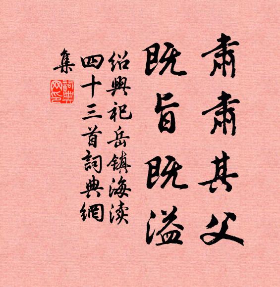 古詩文歷史字典書法欣賞書法字典國語詞典說文解字康熙字典古漢語字典肅肅其父,既旨既溢佚名 《紹興祀岳鎮海瀆四十三首》名句出處出自宋代佚名的《紹興祀岳鎮海瀆四十三首》全文:肅肅其父,既旨既溢。迨其畢酌,偏茲博碩。祀事既遂,不敢誶射。神或醉止,我心斯怪。佚名詩詞大全名句書法欣賞肅肅其父,既旨既溢書法作品佚名名句,紹興祀岳鎮海瀆四十三首名句名句推薦後人未可輕雌黃,兩翁之心秋月白真德秀《題隱者蘇翁事跡》樂雖思泮水,愚恐累溪神王阮《次韻葉教二首》蝶飛逢草住,燕出認檐歸舒岳祥《寄子堂》時餐金鵝蕊李白《贈嵩山焦鍊師》又不聞樵採之人王子質,邂逅仙人執手談,贏輪未決藏機密韓信同《棋盤仙跡》同彼乘駒,亦食以芻王令《翩翩弓之張兮詩三章寄王介甫》青燈耿耿夜沉沉,掩卷悽然感獨深陸游《讀史》安得長劍揮,盡劖疊嶂斷范成大《蟠龍嶺》謂可略欹枕,童子致委曲方回《午困》絲竹路傍散,風雲馬上生張說《奉和聖制送王晙巡邊應制》聞有啼鶯處,暗幄曉雲披盧照鄰《凌晨》舊話新情如覿面,同年真是我同年曹涇《次胡濟鼎同年三律》蕙蘭蹊徑失芳期,風雨春深怯減衣歐陽修《傷春》幸生無事日,更隸浙西州陳杰《蘇湖道間》金盆弄水停歌扇朱敦儒《杏花天》詩詞推薦耕園驛佛桑花蔡襄〔宋代〕溪館初寒似早春,寒花相倚醉於人。可憐萬木彫零盡,獨見繁枝爛熳新。清艷夜沾雲表露,幽香時過轍中塵。名園贈歸宗長老道賢楊萬里〔宋代〕地下歸宗天下傳,老夫剩欲到雲邊。王弘送酒催歸去,且省遠公沽酒錢。望江南/憶江南陳朴〔宋代〕珠自右,飛電入丹城。內養嬰兒盈尺象,時逢九數采陽精。火向水中生。燒鬼岳,紫殿勢崢嶸。隨意出遊寰海內,滿江紅劉克莊〔宋代〕滿腹書詩書,餘書事到、穰書苴兵法。新受了、烏公書幣,著鞭垂髮。黃紙紅旗喧道路,黑風青草空巢穴。向幼安適齋掛冠次韻樓鑰〔宋代〕致仕吾非不待年,禮經自合許求田。只圖逕取衣冠掛,不願更尋香火緣。富貴鼎來先瞥地,是非袞處獨翩然。鄮峰漫塘觀雪分韻得遠字劉宰〔宋代〕入臘甫目茲,得雪殊不晚。凝寒祛厲氣,積潤滋麥本。清興浩無極,步屐忘足蹇。扣門呼石交,頸縮語猶謇。挾攜題濂溪畫像陳杰〔宋代〕睟盎真元會,揚休沕穆宣。定非三代下,自得六經先。翠草紅蓮地,光風霽月天。幾神千載悟,紙上更須圈。雁王安石〔宋代〕北去還為客,南來豈是歸。倦投空渚泊,飢帖冷雲飛。垣柵雞長暖,溝池鶩自肥。憐渠不如此,更墮野人機。寄二嚴(士良,婺牧。士元,郴牧)韋應物〔唐代〕絲竹久已懶,今日遇君忺。打破蜘蛛千道網,總為鶺鴒兩個嚴。第一百八十九卷偈頌十二首釋道璨〔宋代〕隱山無量罪過,復被 * 追到。要得重整頹網,不免再升此座。