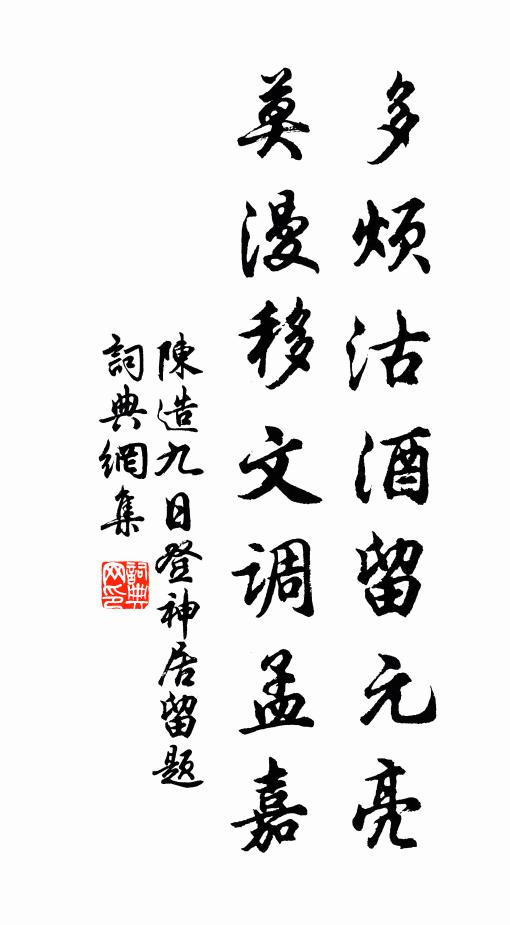 古詩文歷史字典書法欣賞書法字典國語詞典說文解字康熙字典古漢語字典多煩沽酒留元亮,莫漫移文調孟嘉陳造 《九日登神居留題》名句出處出自宋代陳造的《九日登神居留題》全文:行行十刻冒風沙,驟喜深堂放馬撾。旋報陰雲漏紅日,共追佳節把黃花。多煩沽酒留元亮,莫漫移文調孟嘉。未竟笑譚人樹醉,簷棲片月欲翻鴉。名句書法欣賞多煩沽酒留元亮,莫漫移文調孟嘉書法作品陳造名句,九日登神居留題名句名句推薦如松如杞,淑問不已蕭穎士《江有楓一篇十章》易牙去已久,吾齒若貝編薛師石《寄謝黃元信惠茶》雲龍風虎盡交回,太白入月敵可摧李白《胡無人》從來底事活計,不與俗相干姬翼《水調歌頭》依依故國樊川恨,半掩村橋半拂溪杜牧《柳絕句》又斜陽,征鴻影斷,夜來空信燈花劉塤《長相思(客中景定壬戌秋)》白頭所得能多少,枉被人書莽大夫劉克莊《漢儒二首》赤紙藤書宋鼎歸,寄奴柴燎告功時曾極《宋受禪壇》閒中一覺日高眠張掄《訴衷情》晨曦已告今天始,又是人間一次春啟功《一九九四年元日口占》登山正可小天下,跨海何用尋蓬萊陸游《東山》山川降嘉歲,草木蒙潤滋韋應物《秋集罷還途中作,謹獻壽春公、黎公》遠餞元非趨炎者,二十年、相與形骸外李昴英《賀新郎(餞廣帥馬方山赴召)》周興而爪牙,郄超而賓客李昴英《肇慶府倅王庚應平反廣府帥司冤獄詩以紀其事》一點浩然如古鏡,圓明不受微塵姬翼《臨江仙》詩詞推薦送惠空北游齊己〔唐代〕君向峴山游聖境,我將何以記多才。叮嚀墮淚碑前過,寫取斯文寄我來。和孫端叟寺丞農具十五首其一田廬梅堯臣〔宋代〕結廬野田中,其高足以覘。坐臥劣自容,巢棲未嘗厭。但能風雨蔽,何惜茅蓬苫。終當收刈畢,寂寞慚山店。訴衷情蔡伸〔宋代〕亭亭秋水玉芙蓉。天際水浮空。碧雲望中空暮,人在廣寒宮。雙縷枕,曲屏風。小房櫳。可憐今夜,明月清風,無渭水權德輿〔唐代〕呂叟年八十,皤然持釣鉤。意在靜天下,豈唯食營丘。師臣有家法,小白猶尊周。日暮駐征策,愛茲清渭流。送沈太博粹滑台蘇頌〔宋代〕早歲淮陽宰邑初,相君連上薦能書。新從墨綬諸侯國,便領油泥別駕輿。東郡提封今輔屏,南都接軫舊鄉閭。優遊司馬相如徐鈞〔宋代〕賣賦名成賣酒餘,歸來駟馬擁高車。錦衣只欲湔前恥,不道開邊困里閭。浣溪沙許棐〔宋代〕欲把香繒暖纈裁。玉箱金鎖又慵開。一杯茶罷上春台。方向柳邊揉碧縷,又從花畔並紅腮。不知凝待阿誰來。師厚生日因以詩贈梅堯臣〔宋代〕龍驥產龍駒,良金出良冶。良冶無頑礦,龍駒豈凡馬。致遠在御徒,作礪由工者。君子生慶門,詩書未嘗舍。進道傷秦姝行劉禹錫〔唐代〕長安花二月花滿城花,插花女兒彈銀箏。南花仙郎下朝晚,曲頭駐馬聞新聲。馬蹄逶遲心蕩漾,高樓已遠猶頻望。送虞仲房赴潼川漕樓鑰〔宋代〕我來丹丘乘貳車,送客往往萬里余。盛山使君別寖久,漢中郡丞新寄書。公指四明喜鄰境,典午何知成畫餅。揚旌