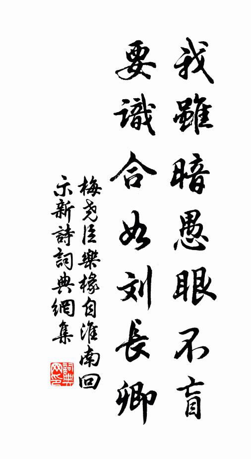 古詩文歷史字典書法欣賞書法字典國語詞典說文解字康熙字典古漢語字典我雖暗愚眼不盲,要識合如劉長卿梅堯臣 《樂椽自淮南回示新詩》名句出處出自宋代梅堯臣的《樂椽自淮南回示新詩》全文:淮南歷覽還宣城,囊多嘉句何冰清。入門先叫十年兄,袖中大卷持來評。我雖暗愚眼不盲,要識合如劉長卿。舉頭不言笑且驚,此兄議論頗稱情。我亦感君知我名,阮籍從呼作老兵。名句書法欣賞我雖暗愚眼不盲,要識合如劉長卿書法作品梅堯臣名句,樂椽自淮南回示新詩名句名句推薦猶有白蘋香十里,生來黃蜆蛤蜊粗朱彝尊《鴛鴦湖棹歌 之二十四》通宵縱飲燒銀燭,攙早催開喚玉簫劉克莊《二月十八日過梅庵追懷主人二首》旋取茶鐺泛,多收藥匕調朱長文《雪夕林亭小酌因成拙詩四十韻以貽坐客昔歐陽》近來卻被官身累,三過西湖不見山范成大《寄題西湖並送淨慈顯老三絕》承華啟畫堂江總《宴樂修堂應令詩》桂子月中落,天香雲外飄宋之問《靈隱寺》欲系孤舟日已斜,秋霜一岸著蒹葭楊冠卿《渡口》山從何來,蜿蜿蜒蜒袁甫《題陳和仲尊明亭》官曹一見故情親,宴語識君心志古晁補之《次韻太學黃博士冕仲同考試作》水滿不知新獲稻,霜嚴猶放後凋花韓維《同芳公上人游湖》出處付身外,吾生可自由郭印《題絕塵亭》夫是田中郎,妾是田中女孟郊《織婦辭》有甚成虧處朱敦儒《桃源憶故人》津頭卻望後湖岸,別處已隔東山雲獨孤及《早發龍沮館舟中寄東海徐司倉鄭司戶》景命有開和未艾,萬年孫子慶純精文天祥《明堂慶成詩》詩詞推薦寄致政吳虞部王安石〔宋代〕白鷗生意在滄波,不為風塵有網羅。年抵馮唐初未半,才方疏廣豈能多。孤清楚國知誰繼,遺愛郴人想共歌。嗟我漁家傲 余讀歐公李太尉席上作十二月淦家傲歐陽玄〔元代〕其盛麗,生平思仿佛一言不可得。近年竊官於朝,久客輦下,每欲放此,作十二闋,以道京師兩城人物之富,四時重過戴氏居 其二王冕〔元代〕矮籬編綠槿,小逕入青桑。屋繞河流潤,門開竹色涼。課兒書滿架,留客酒盈觴。西沼芙蓉美,南薰□□香。水調歌頭朱敦儒〔宋代〕中秋一輪月,只和舊青冥。都緣人意,須道今夕別般明。是處登臨開宴,爭看吳歌楚舞,沈醉倒金尊。各自心中事贈彈箏者薩都剌〔元代〕銀甲彈冰五十弦, 海門風急雁行偏。故人情怨知多少, 揚子江頭月滿船。重入東林寺董嗣杲〔宋代〕雁門市里梵坊通,整理重登興未窮。雙劍風高雲氣壓,五杉閣峻水聲空。欲拋世網離塵境,要扣禪機演祖風。況有寄上蘇邛州兼呈八座史堯弼〔宋代〕稽首仇池翁,歸住小有天。葛公尚遠孫,岣嶁丹山傳。道骨亦有種,而今見嬋嫣。大小茅山君,霞襜兩聯翩。弟兄雲岩寺釋永頤〔宋代〕老來好古尚關心,寺里荒題幾度尋。山鵲報晴窺畫閣,水雞嫌雨上高林,麥殘餘冷收春候,楝落輕風滯晚陰。無限送李翱習之孟郊〔唐代〕習之勢翩翩,東南去遙遙。贈君雙履足,一為上皋橋。皋橋路逶迤,碧水清風飄。新秋折藕花,應對吳語嬌。千巷宿山中十首劉克莊〔宋代〕市脯店猶遠,刈芻人未歸。夜深語童子,且掩半邊扉。
